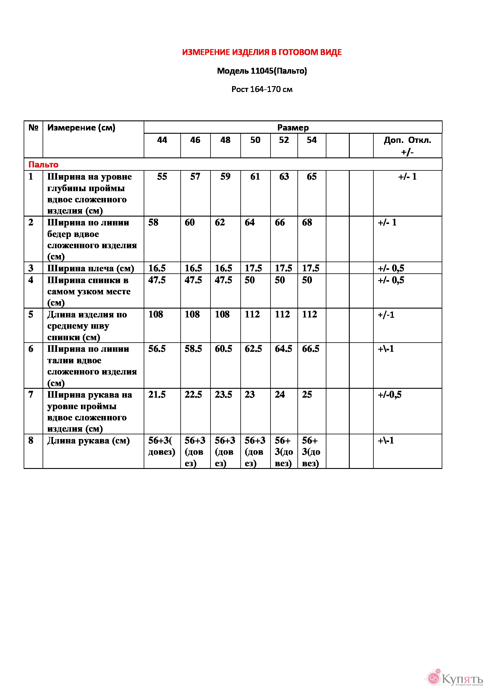 Таблица размеров