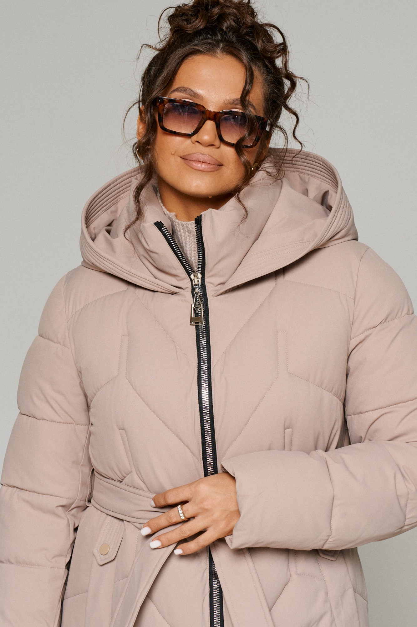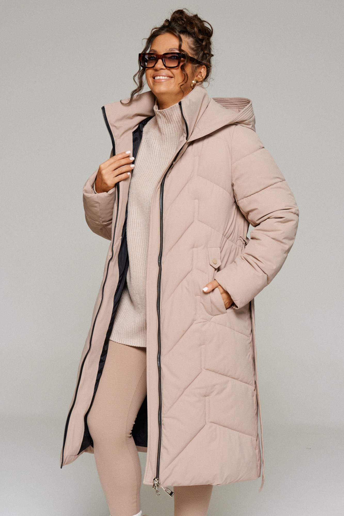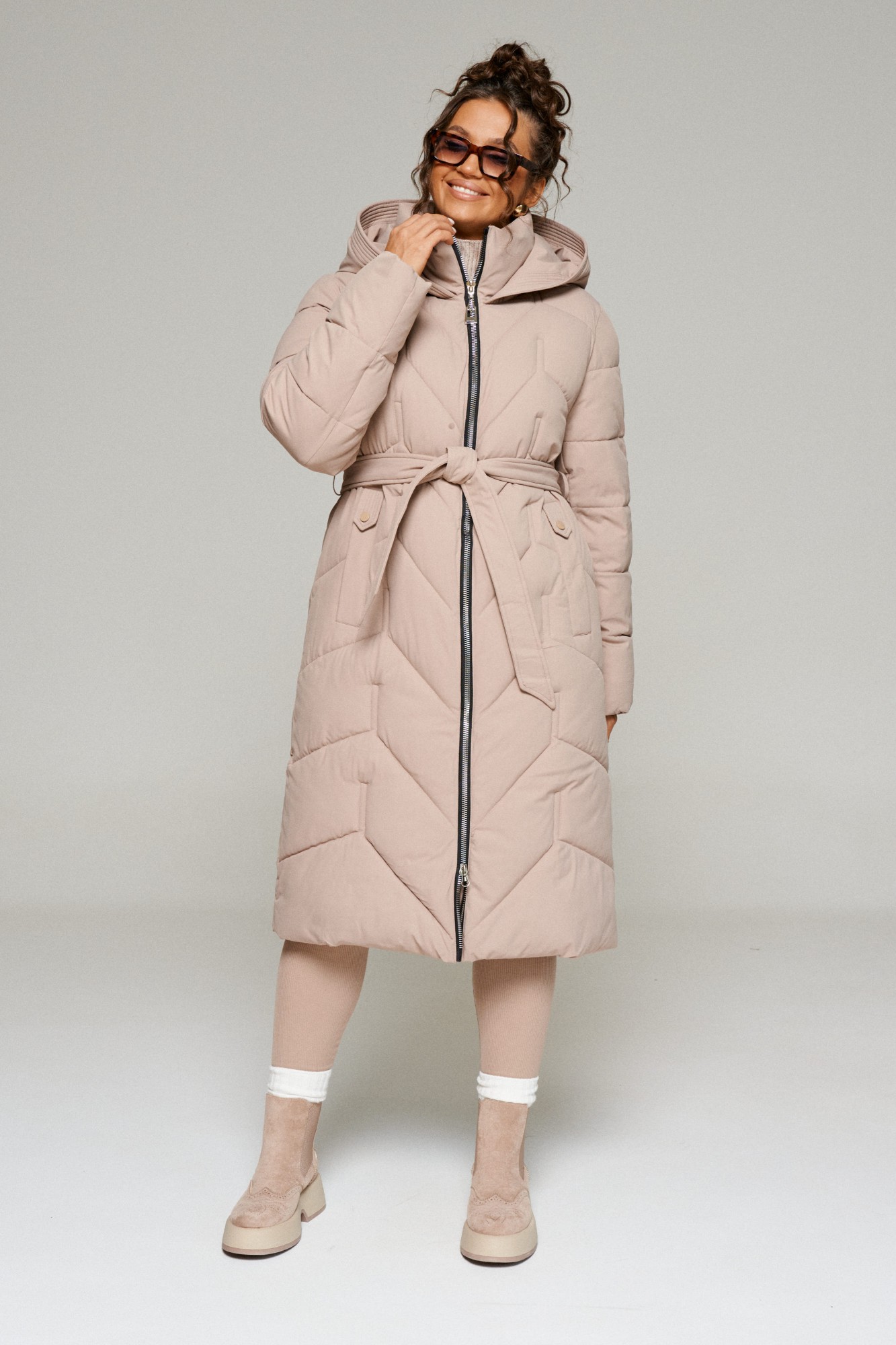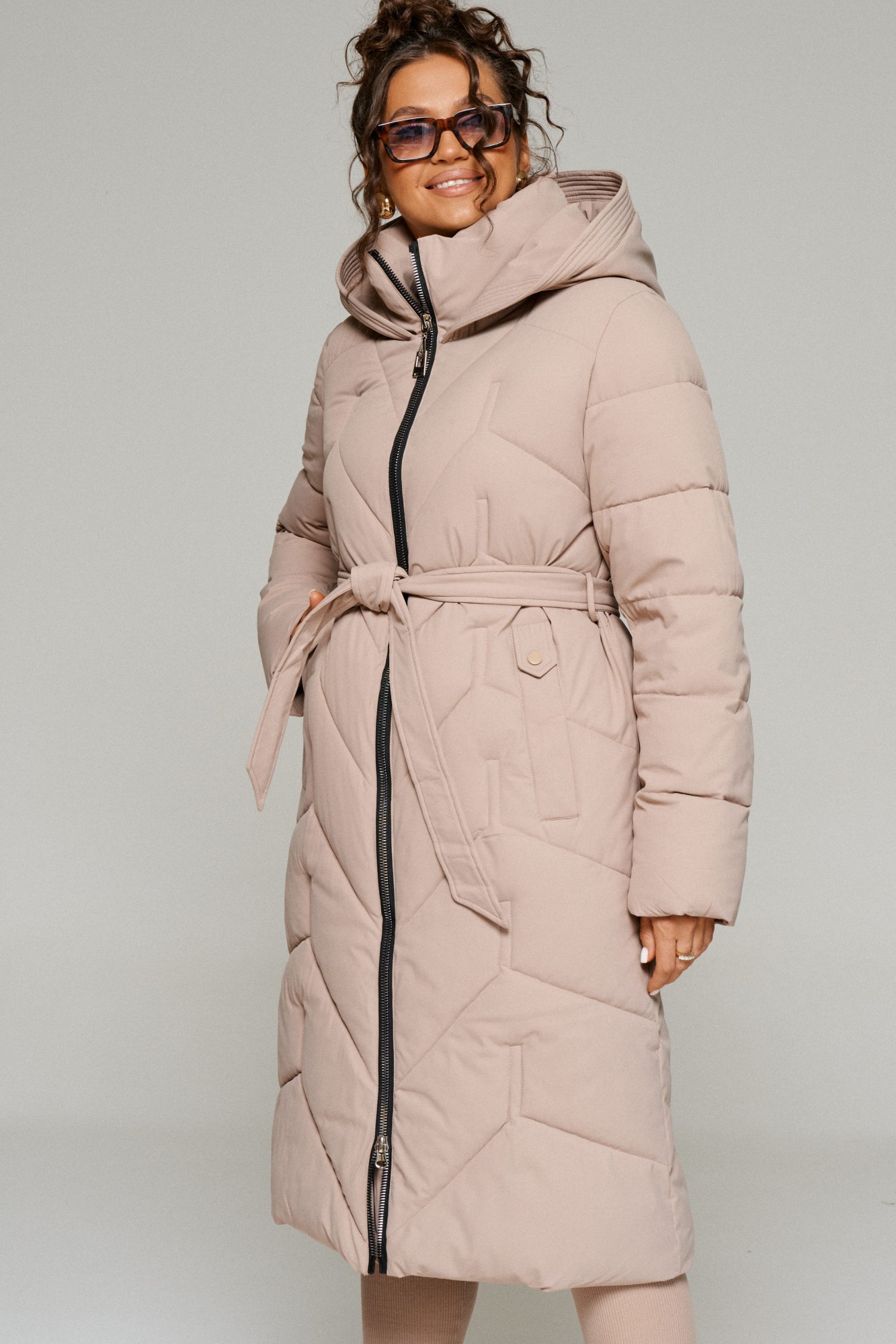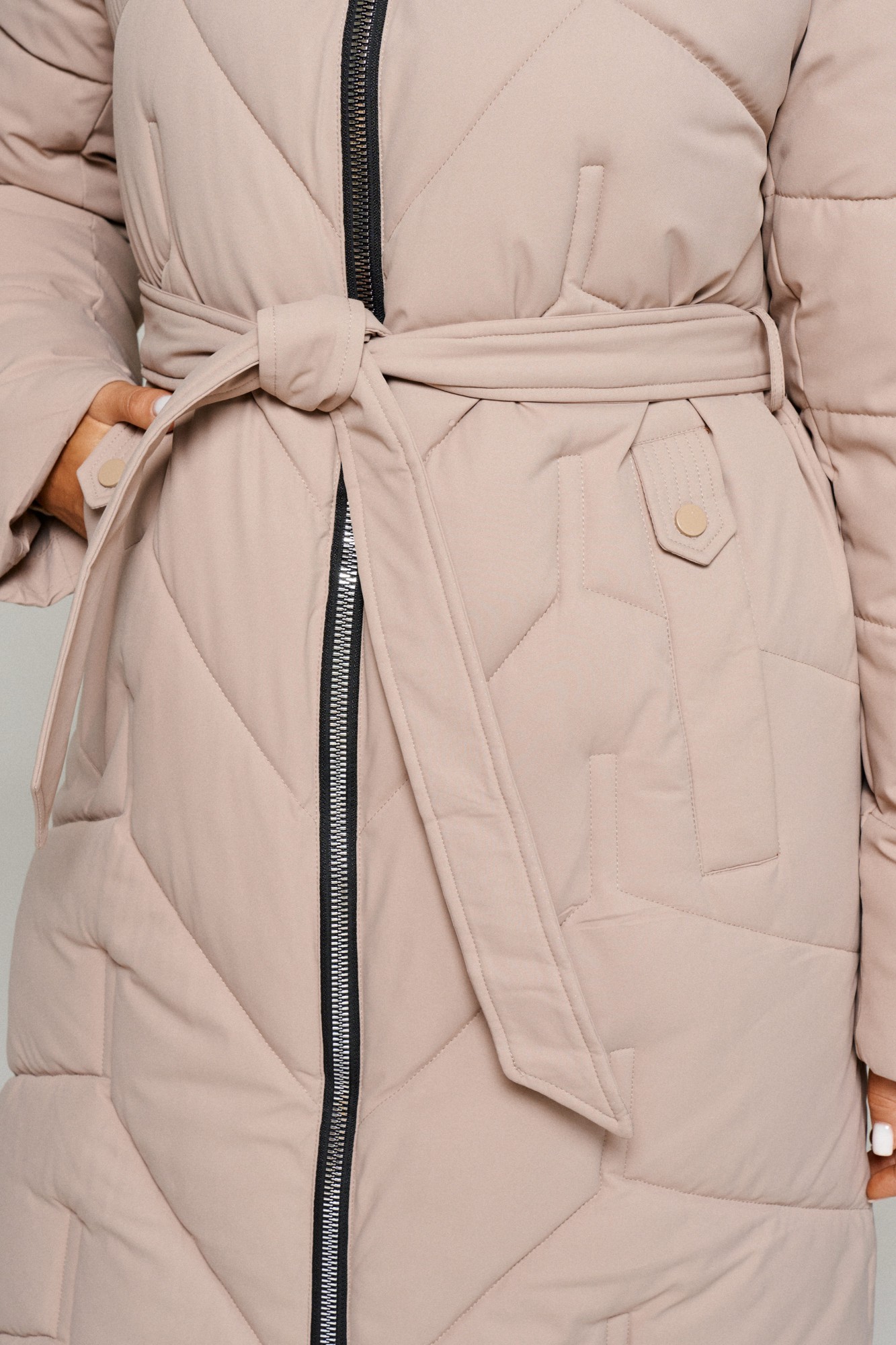 Зимнее, стеганое пальто прямого силуэта для тех, кто любит простоту и ничего лишнего. Это сочетание комфорта, современных материалов и безупречного кроя. Лёгкое, удобное и уютное пальто подходит на все случаи жизни. Сдержанное, расслабленное, не сковывающее движений, универсального цвета. Это пальто отлично впишется в повседневные образы. Пальто выполнено из стёганной, достаточно прочной и приятной на ощупь влагостойкой, полиэфирной ткани; на синтетической подкладке. Утеплитель из холлофайбера 250 г/м.кв., подходит для холодной осени и зимы. Изделие рассчитано на температурный режим от -10 до -25 градусов. Модель прямого силуэта, базового кроя; предназначена для повседневного использования. Передняя часть цельнокроеная, с двумя прорезными карманами с декоративной листочкой. Застежка центральная на декоративную молнию с ветрозащитной планкой внутри. Длина молнии от верхнего края воротника до нижнего края изделия. Спинка цельнокроеная. Рукав длинный, двухшовный, втачной. Внутри рукава предусмотрена дополнительная вставка в виде трикотажной манжеты. Воротник – стойка, шириной ок.10 см., объёмный. Капюшон притачной по линии горловины. Низ изделия ровный. Подкладка гладкая, имеет дополнительный внутренний карман. В качестве дополнительного элемента к изделию прилагается пояс – завязка.