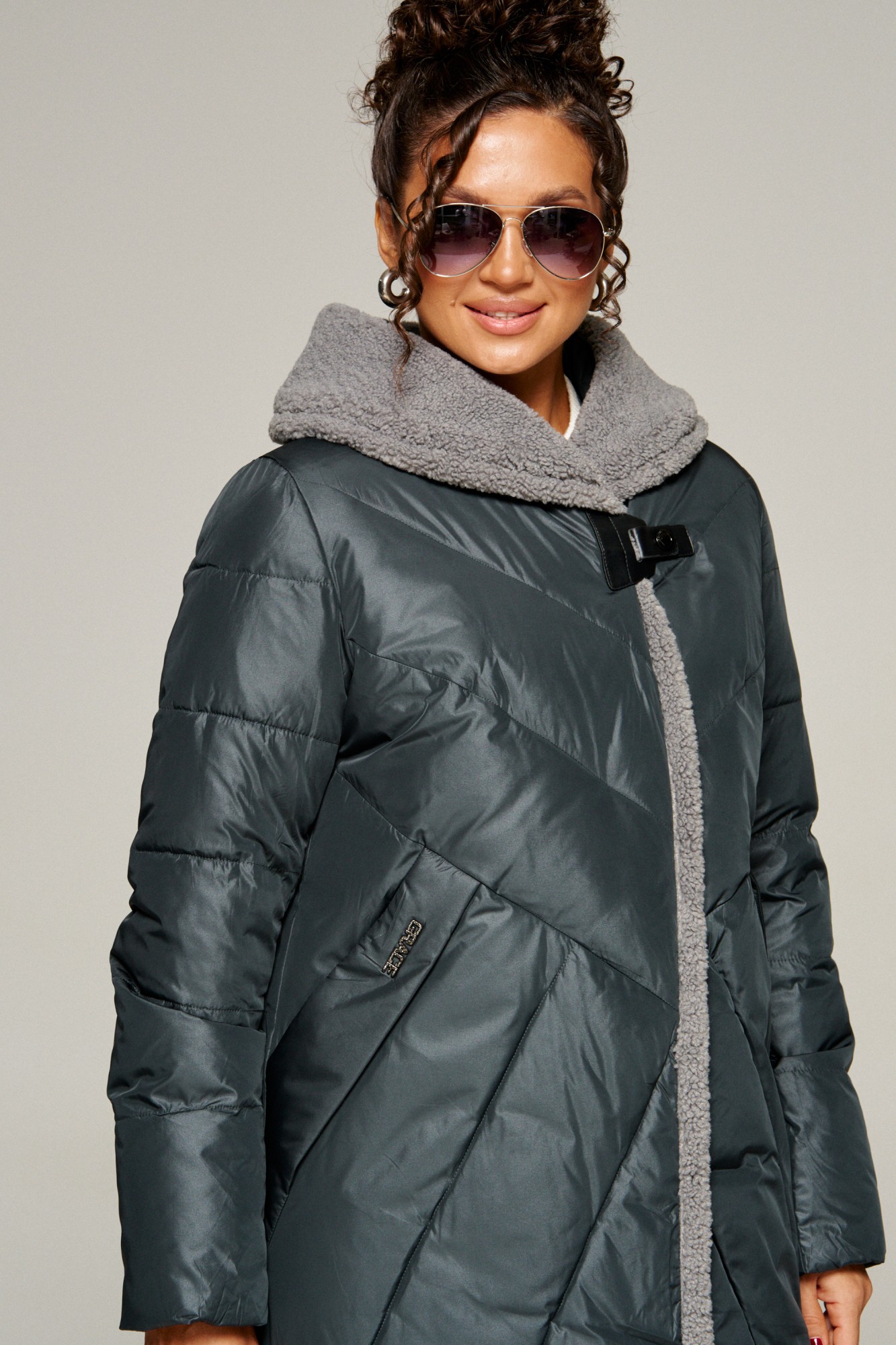 Застежка центральная на двустороннюю молнию от верха до низа и кнопки. Под капюшоном спереди настрочен дополнительный элемент застежки из экокожи.
