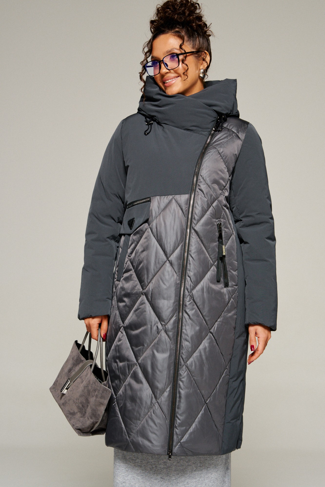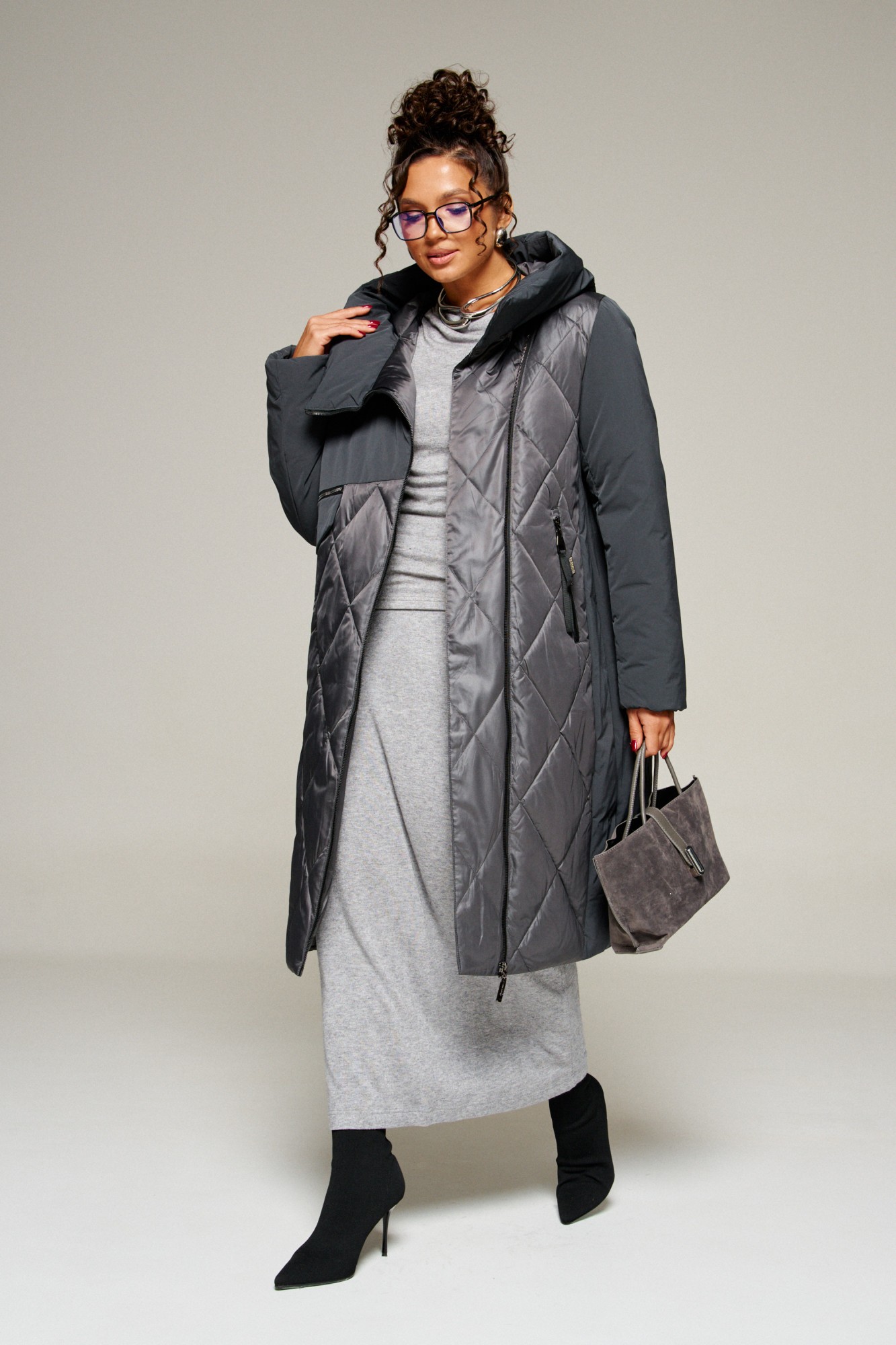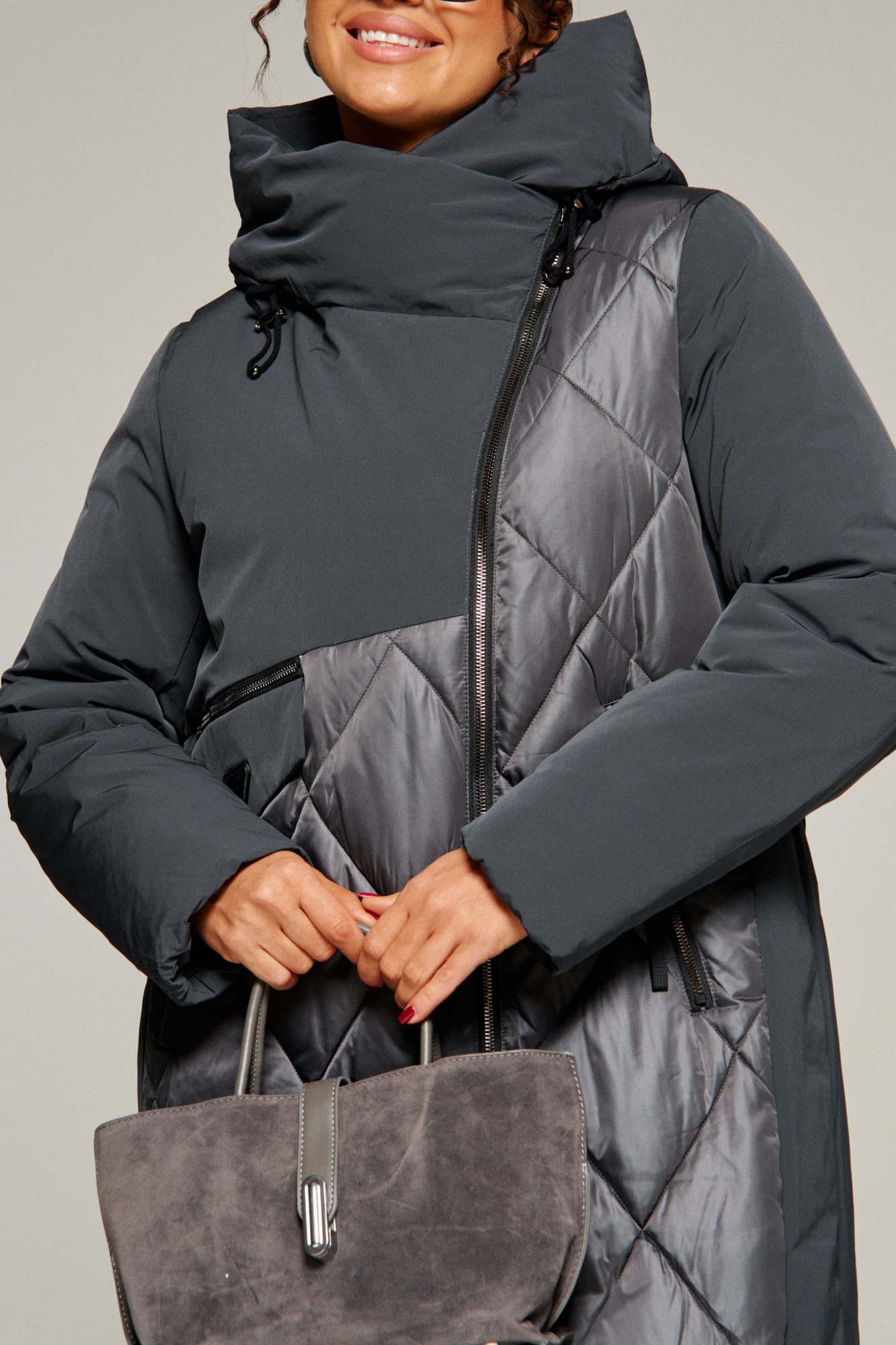 Перед асимметричный. С правой стороны расположены кокетка и вертикальный подрез от неё. В кокетку вставлена декоративная молния и клапан с пришивным отделочным элементом. На центральной правой части переда расположен боковой прорезной карман с обтачкой. С левой стороны – два вертикальных рельефа: от плеча (в который вставлена часть молнии) и от проймы, а также боковой прорезной карман на молнии с декоративным фиксатором. Центральные части переда выполнены из отделочной стеганой ткани с блеском аналогичного оттенка с цветом изделия.