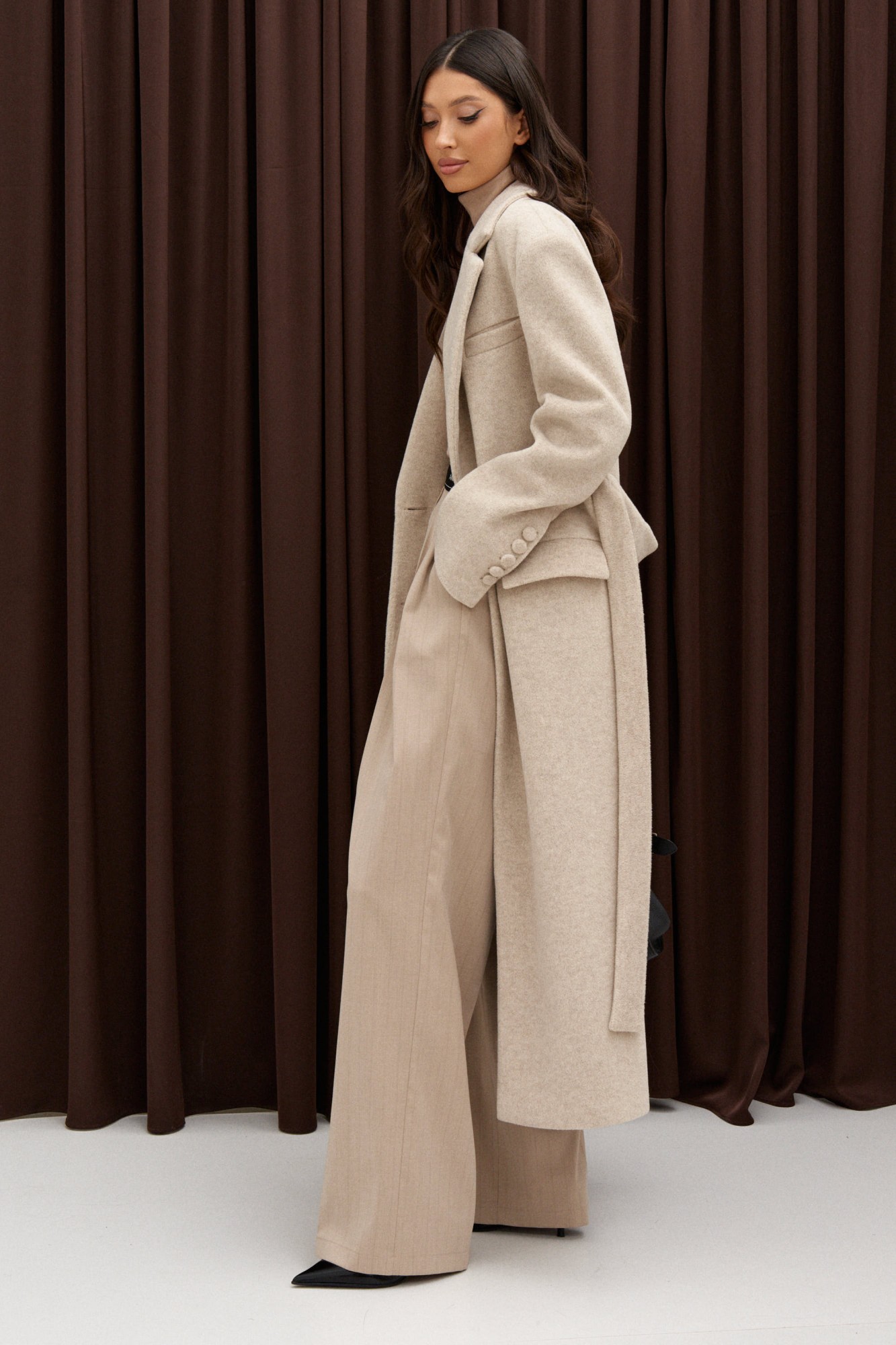 Стильное пальто прямого кроя выполнено из фактурного полотна светло-бежевого цвета. Характеристики: прямой крой, подкладка, подплечники, отложной воротник с остроугольным лацканом, застежка центральная на петли пуговицы, по линии талии шлевки, в комплекте пояс из ткани основного изделия, рукав втачной, по низу рукава нашиты пуговички, по переду прорезные карманы с клапаном, в среднем шве заднего полотна изделия разрез 58 см.