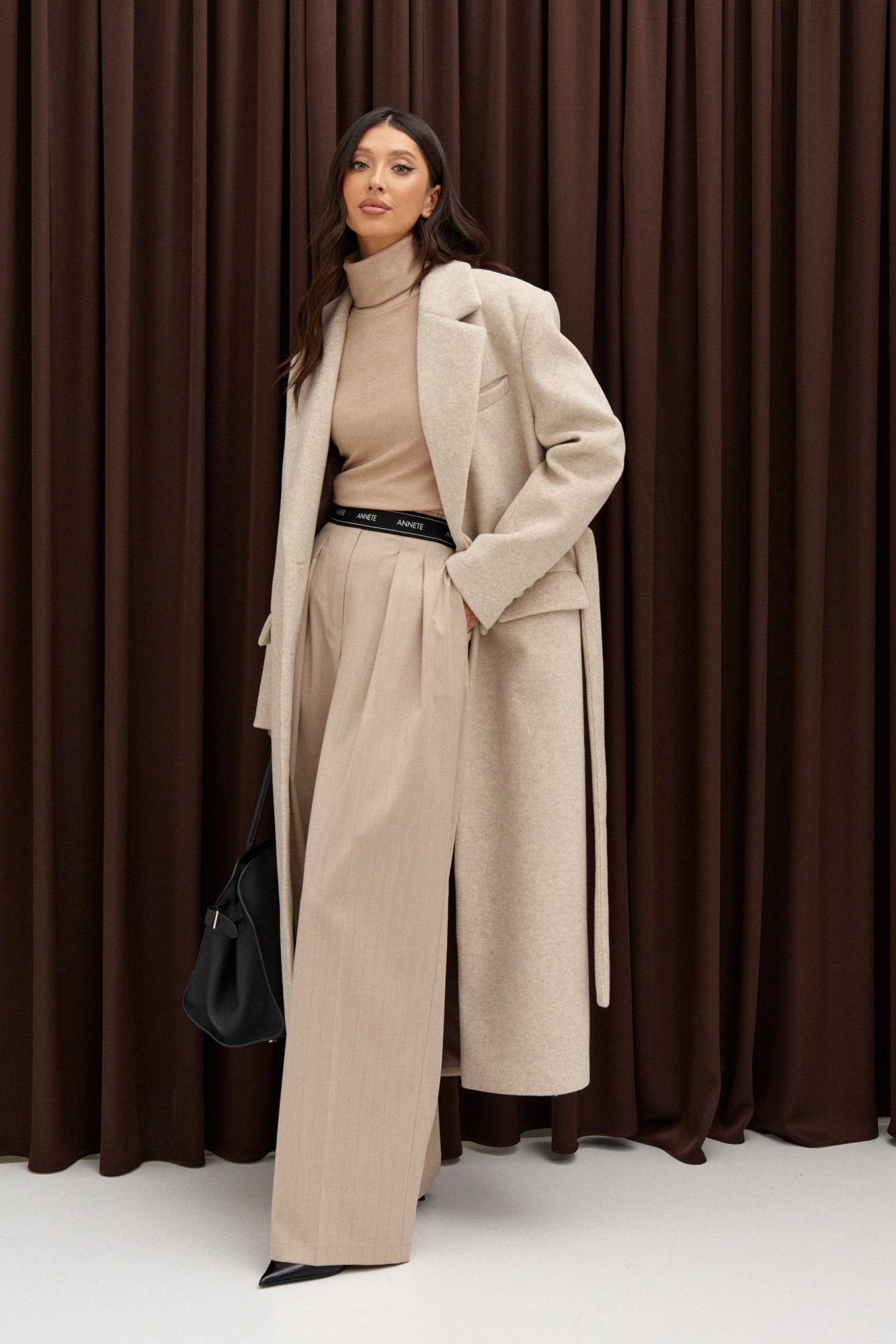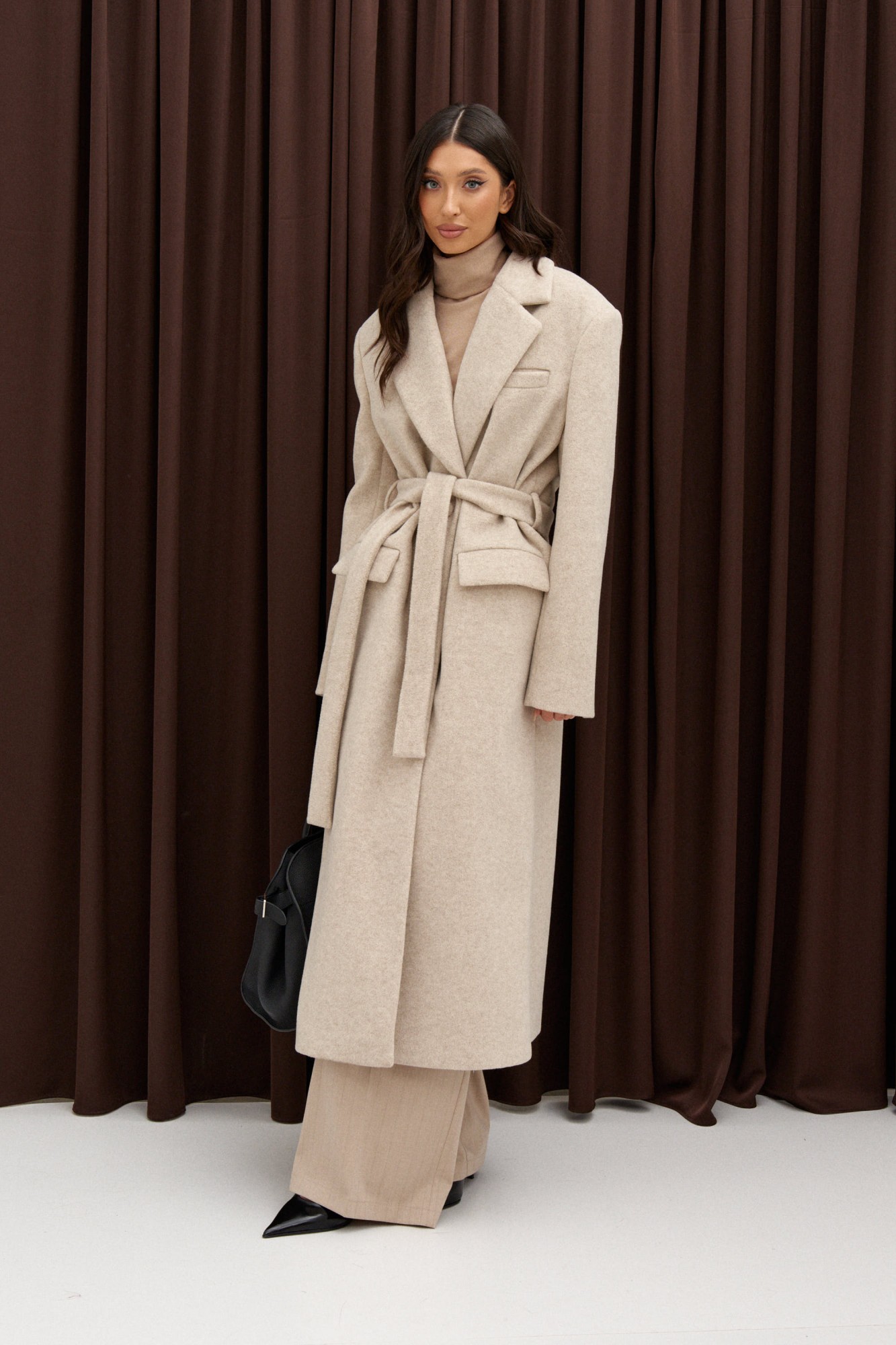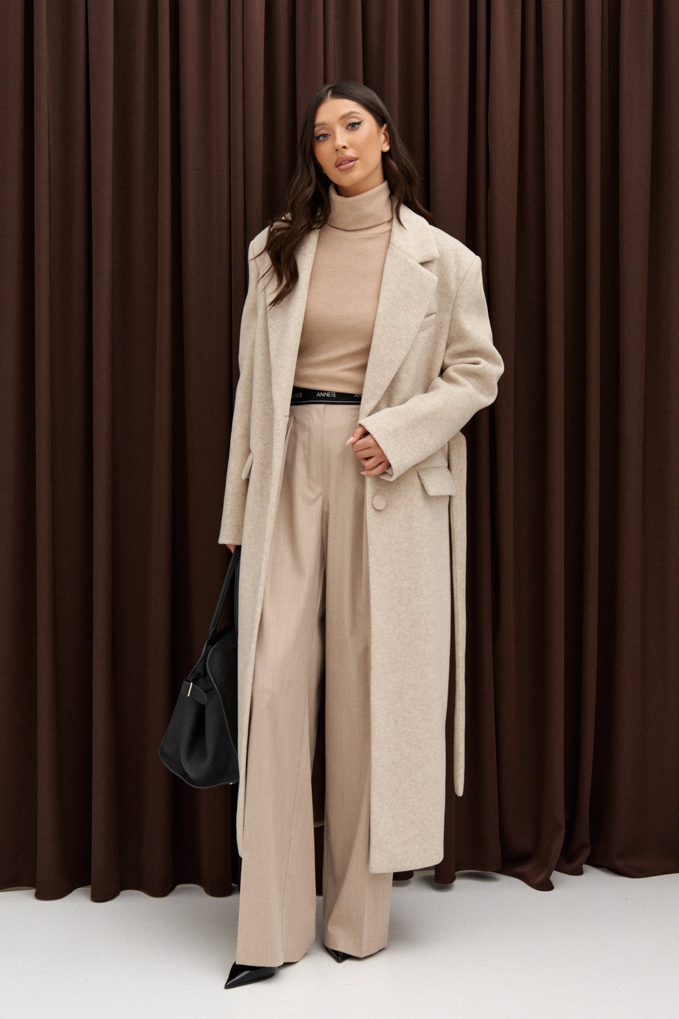 Стильное пальто прямого кроя выполнено из фактурного полотна светло-бежевого цвета. Характеристики: прямой крой, подкладка, подплечники, отложной воротник с остроугольным лацканом, застежка центральная на петли пуговицы, по линии талии шлевки, в комплекте пояс из ткани основного изделия, рукав втачной, по низу рукава нашиты пуговички, по переду прорезные карманы с клапаном, в среднем шве заднего полотна изделия разрез 58 см.
