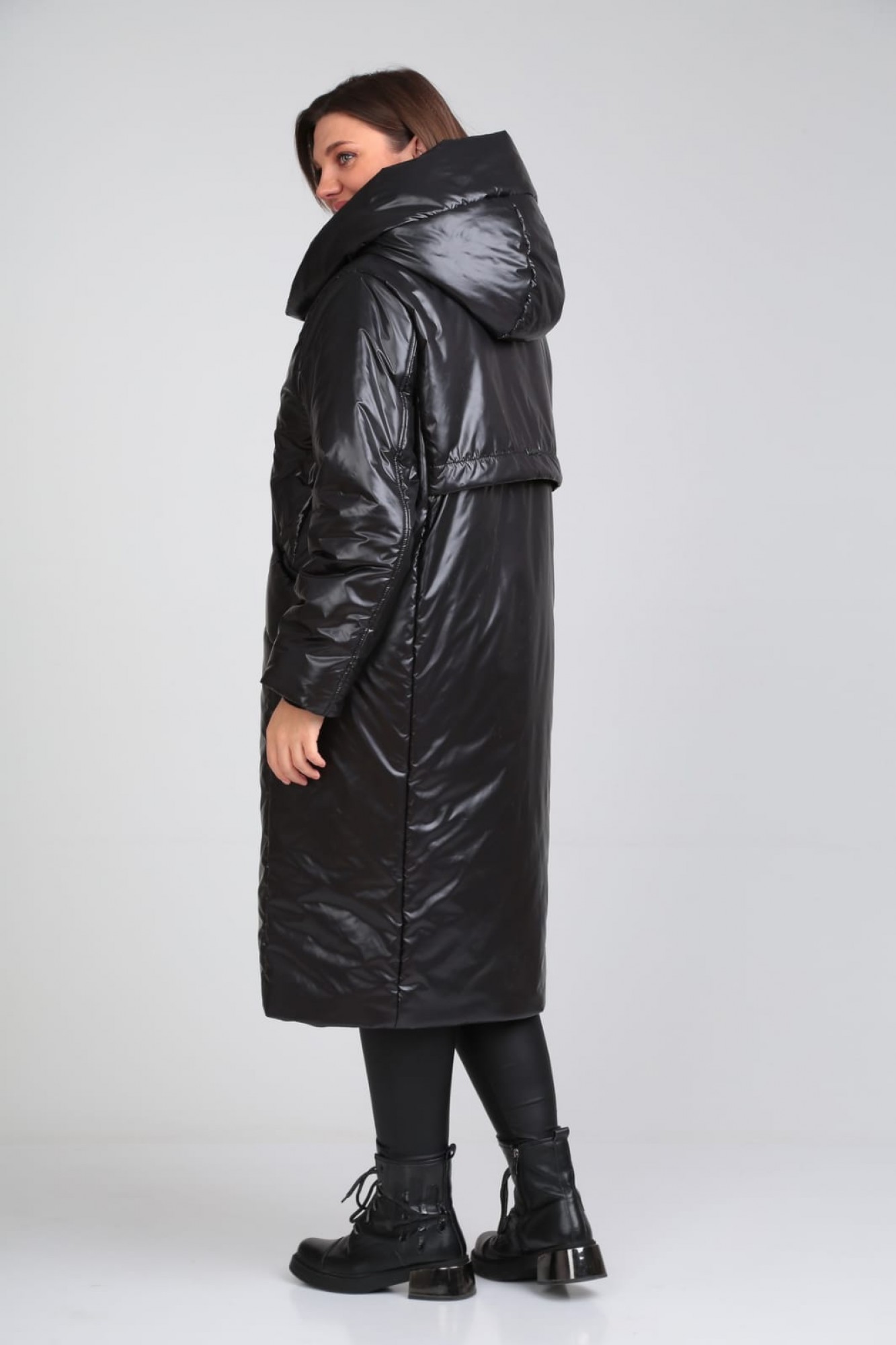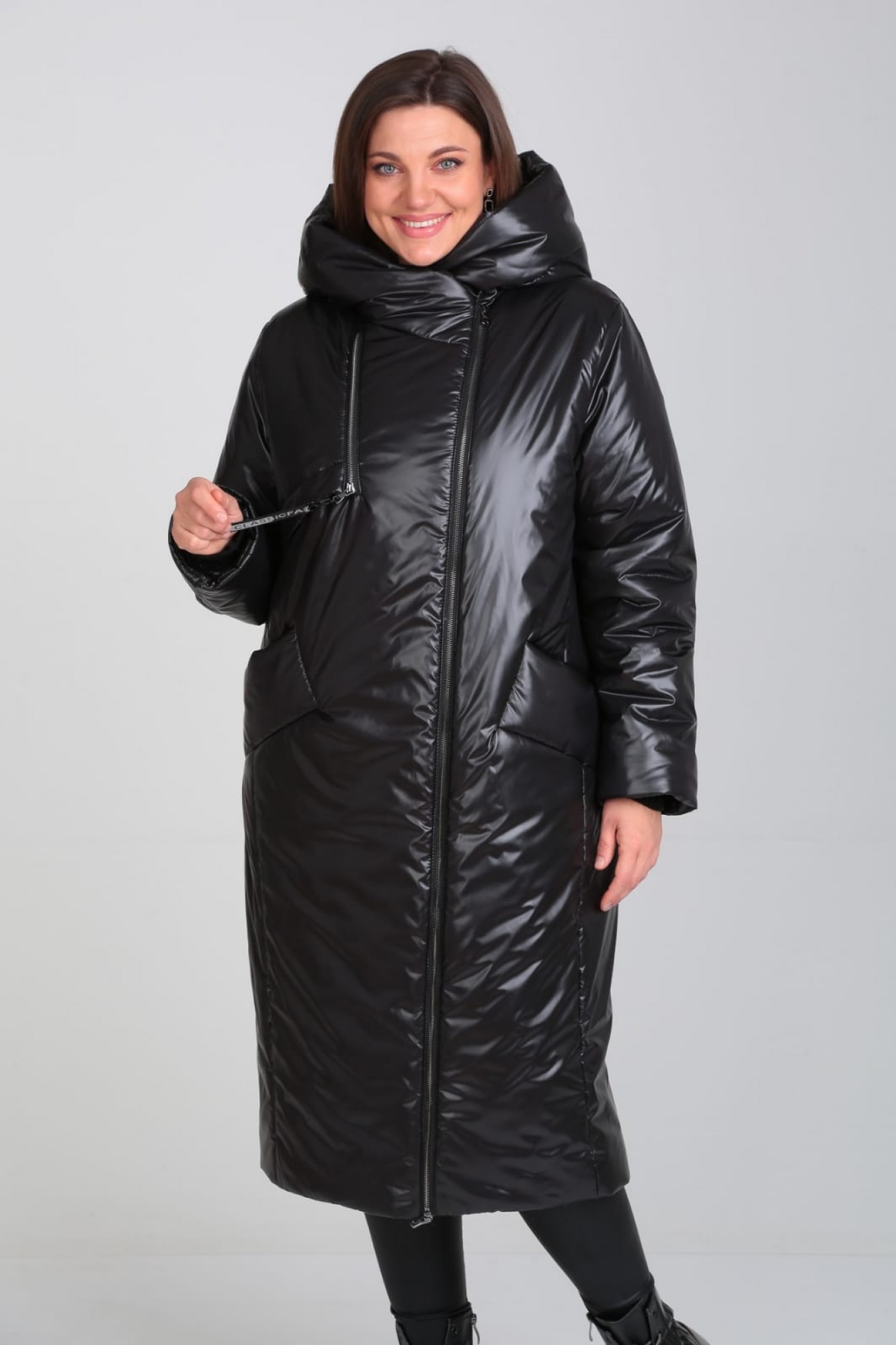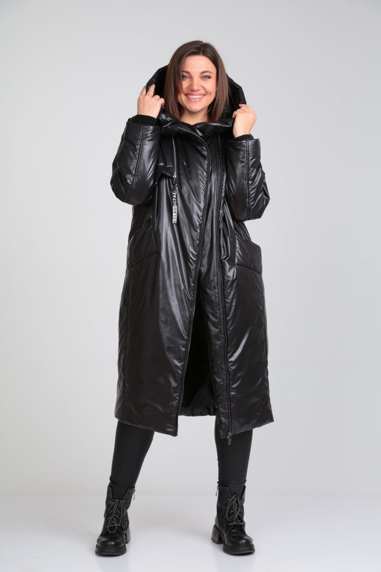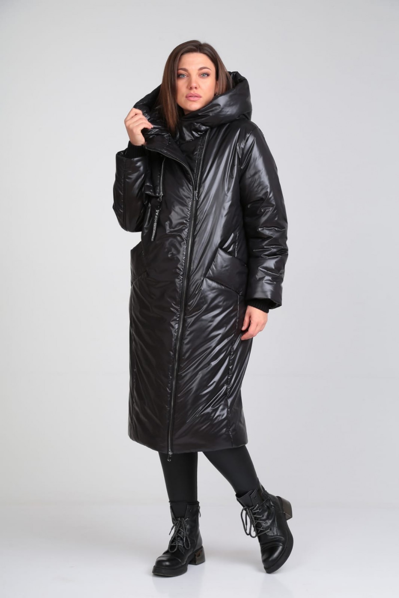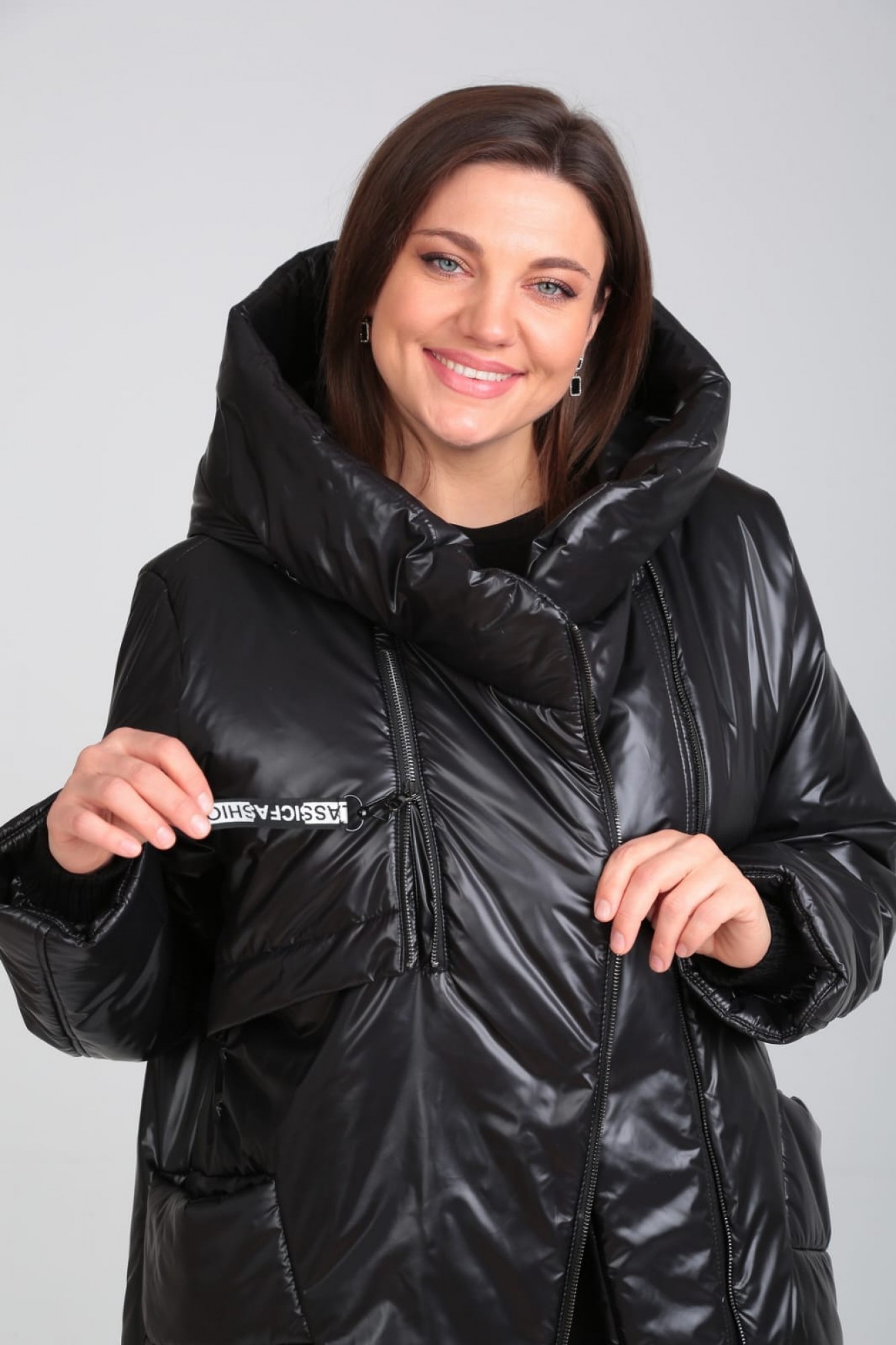 Пальто женское утеплённое с ассиметричной застёжкоймолния от горловины до низа. Перед с плечевой застёжкой по правой полочке, пристёгнутый на короткую молнию с карабином и украшением. Карманы боковые прорезные с листочкой. Спинка с отлетной кокеткой. Пальто с отрезными бочками. Воротник капюшон с кулисой и шнуром по средней части для коррекции объёма. Рукав втачной 2-х шовный с трикотажным довязом выглядывающим из под низа рукава. Температурный режим до -15 градусов.