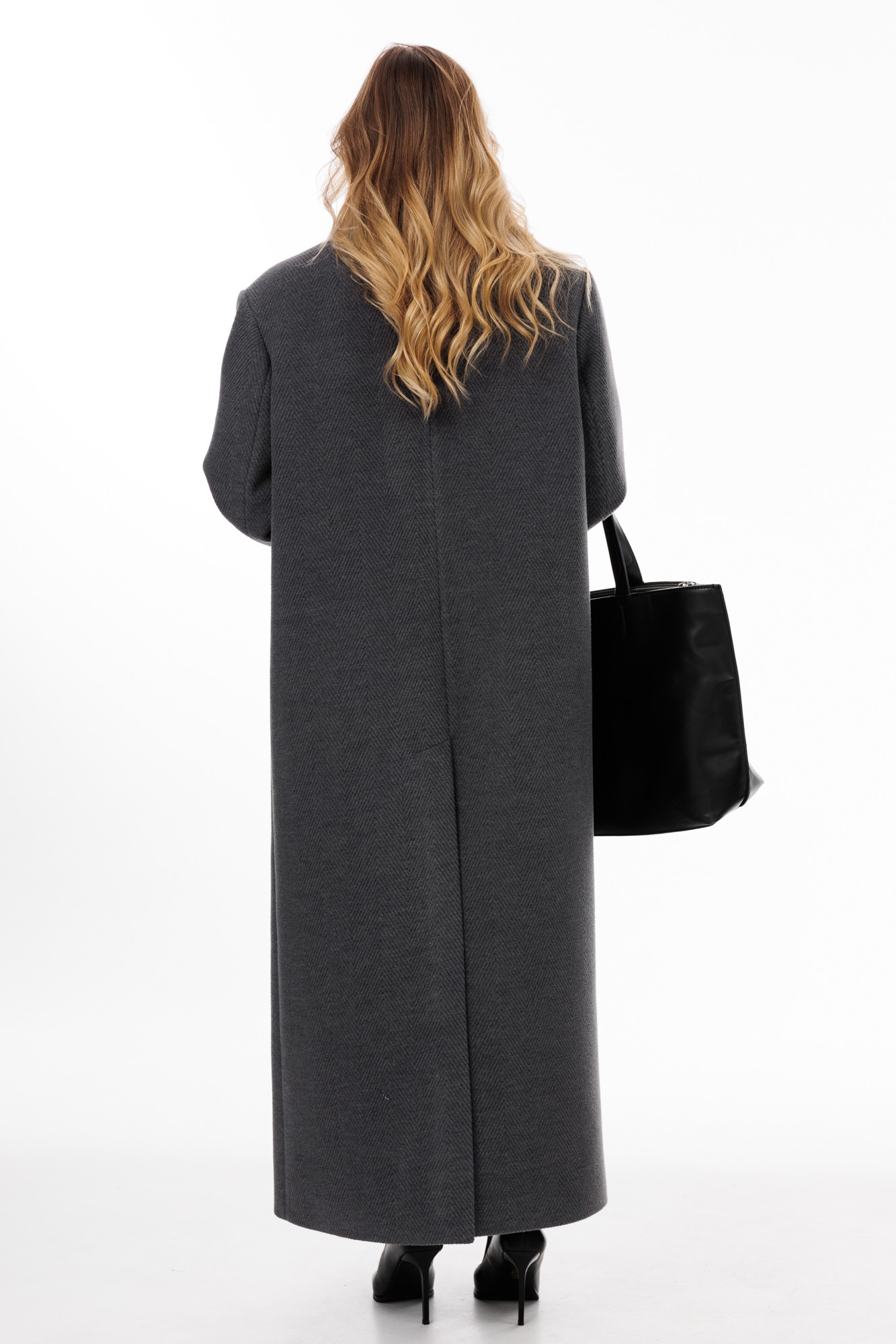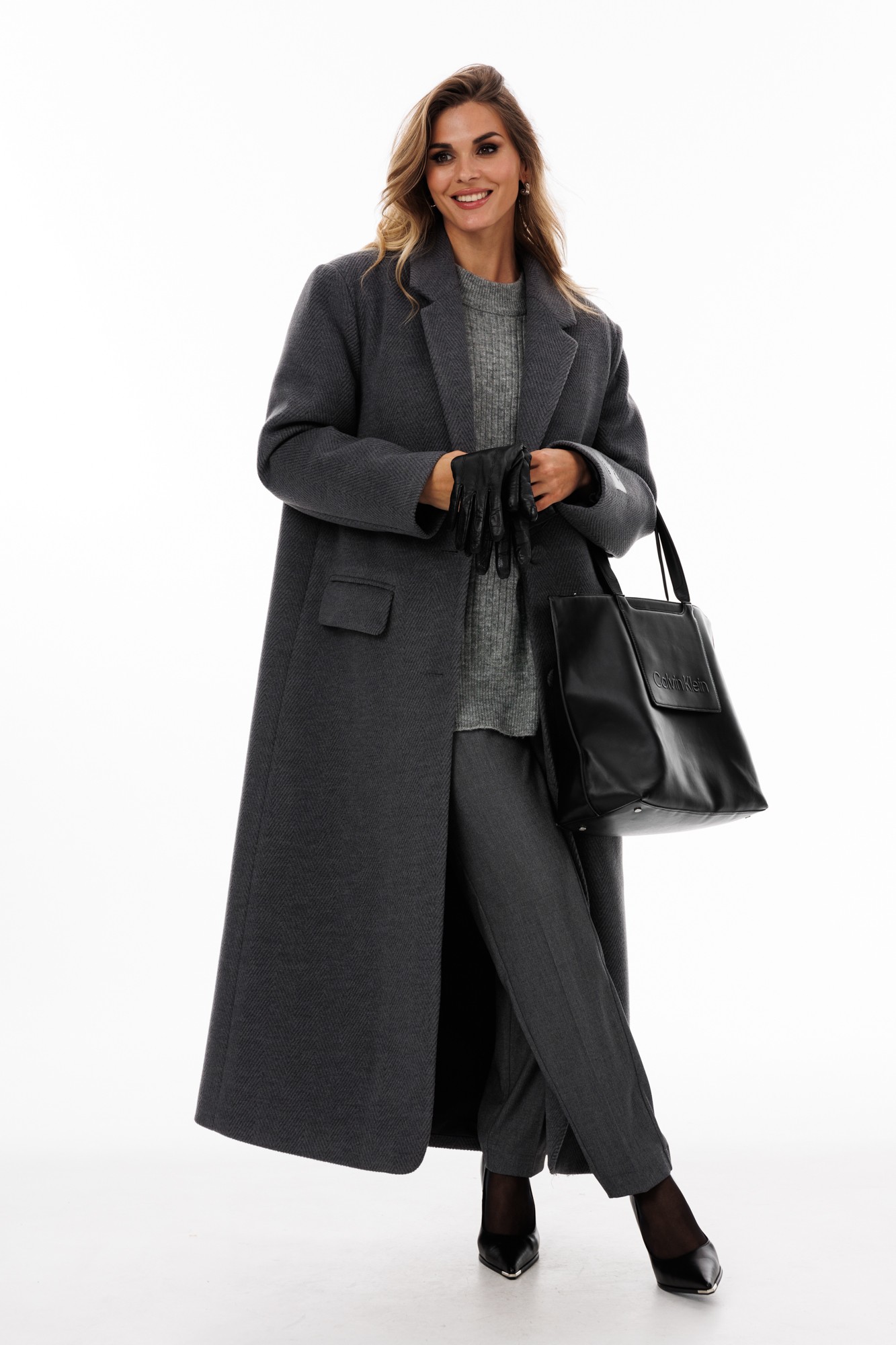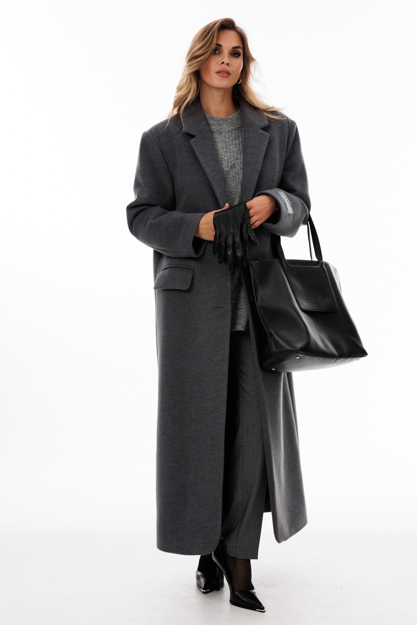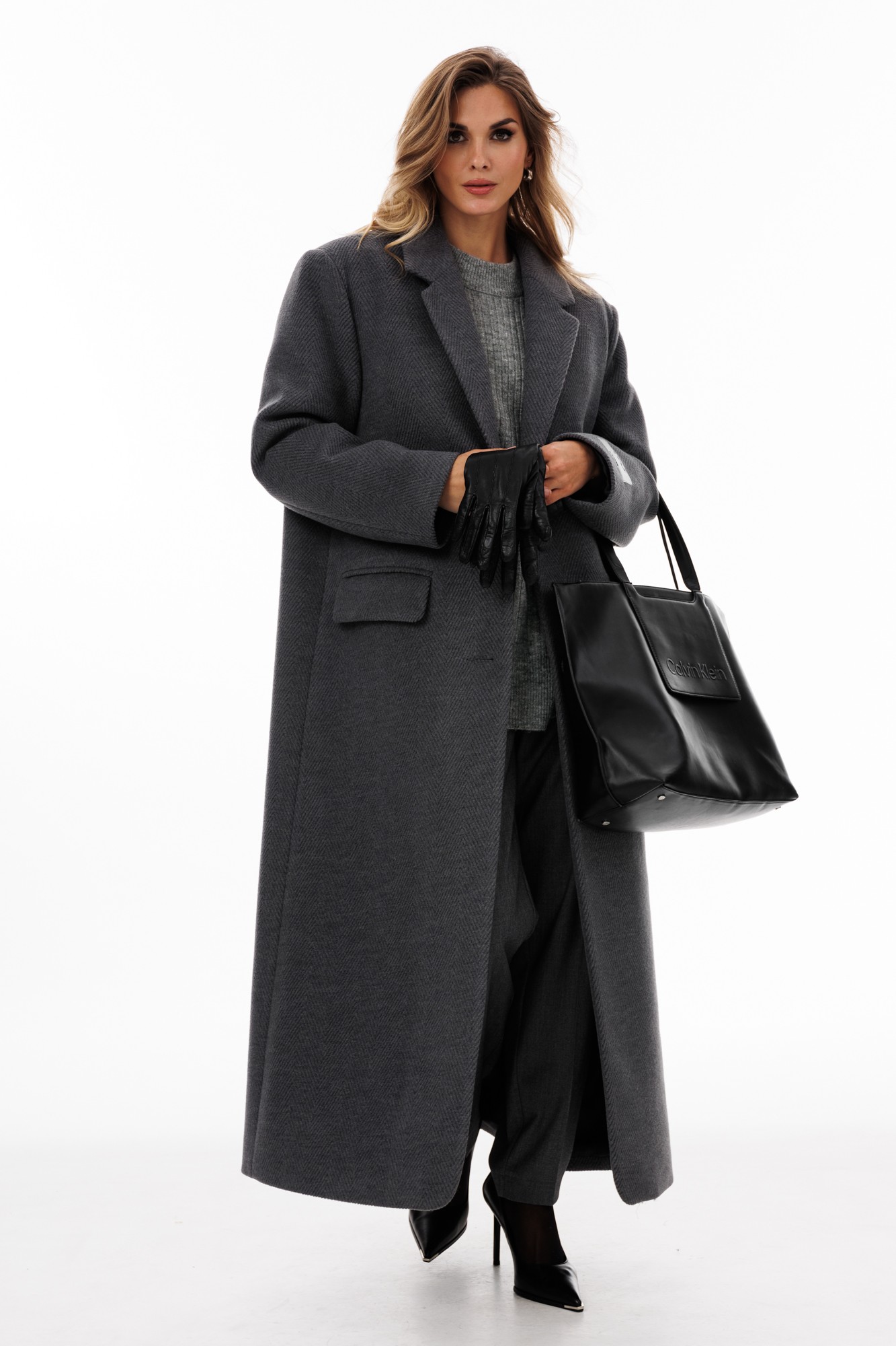 Пальто выполнено из пальтовой ткани в рубчик. Пальто прямого силуэта, длиной до линии щиколотки. Спереди застежка на две пуговицы, горизонтальные прорезные карманы. Спинка со средним швом со шпицей по низу. Воротник пиджачного типа. Плечевой шов удлинен. Рукав втачной, двухшовный. Пальто на притачной по низу подкладке. Пальто декорировано по рукаву нашивкой из натуральной кожи.
