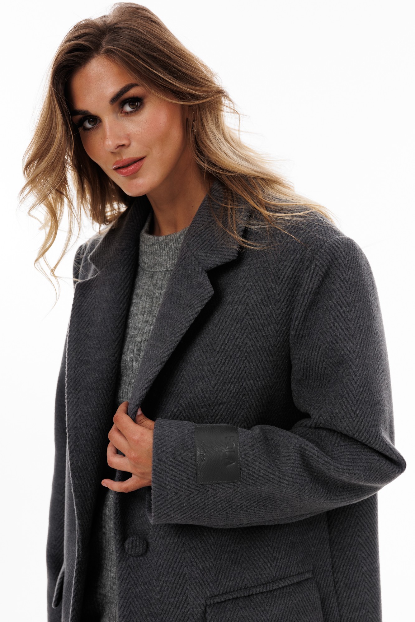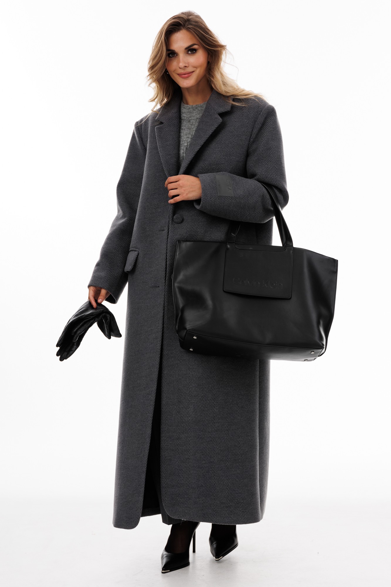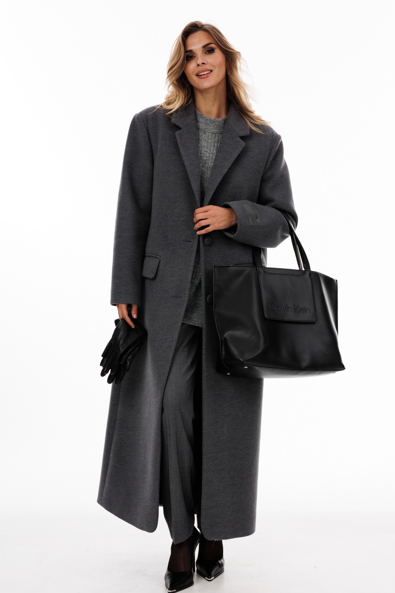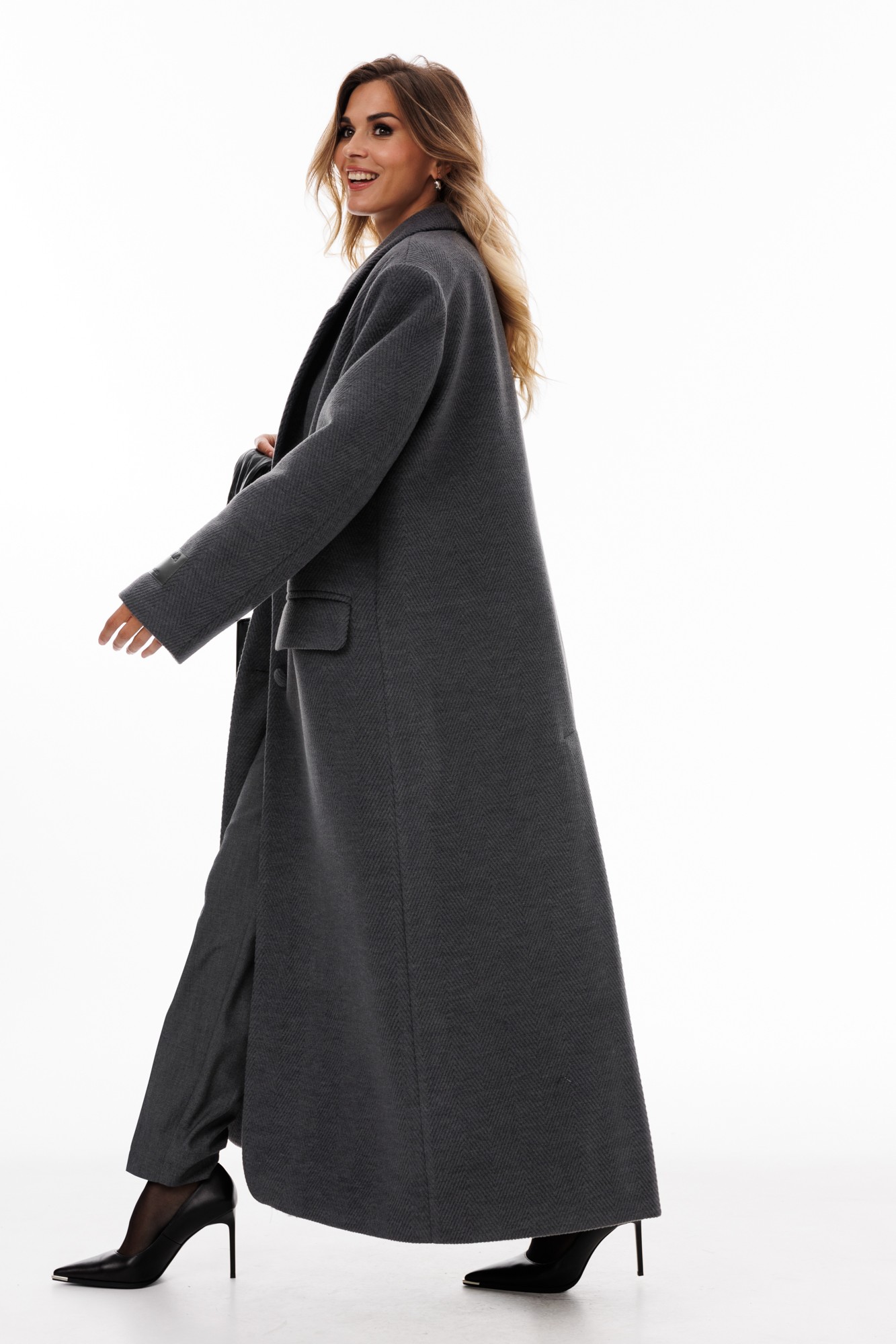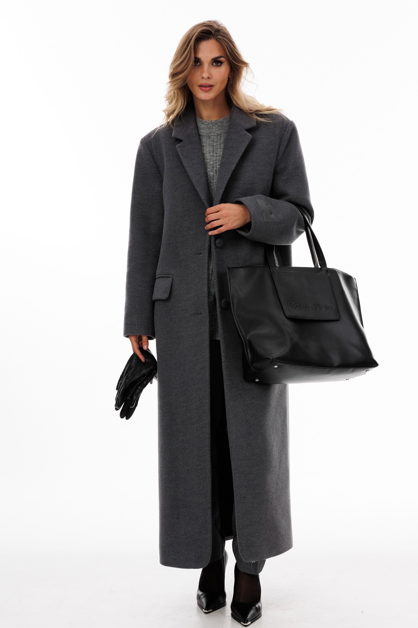 Пальто выполнено из пальтовой ткани в рубчик. Пальто прямого силуэта, длиной до линии щиколотки. Спереди застежка на две пуговицы, горизонтальные прорезные карманы. Спинка со средним швом со шпицей по низу. Воротник пиджачного типа. Плечевой шов удлинен. Рукав втачной, двухшовный. Пальто на притачной по низу подкладке. Пальто декорировано по рукаву нашивкой из натуральной кожи.