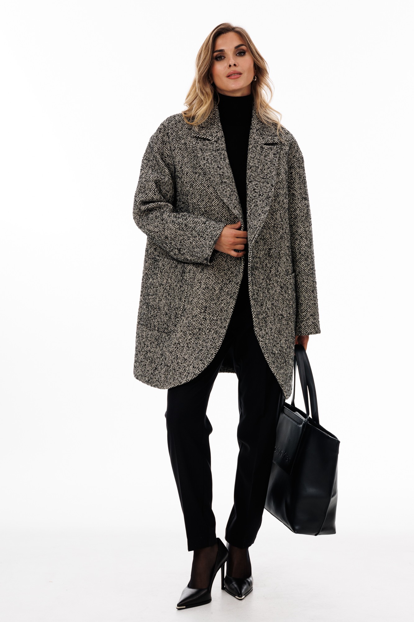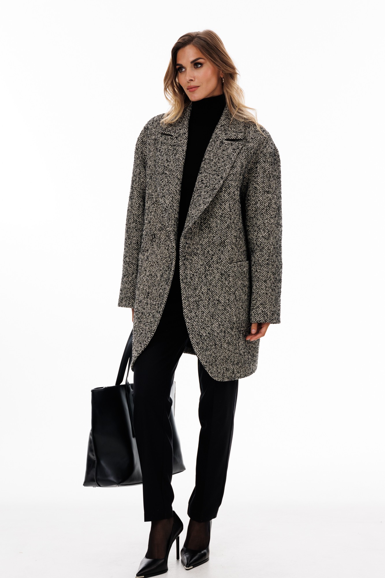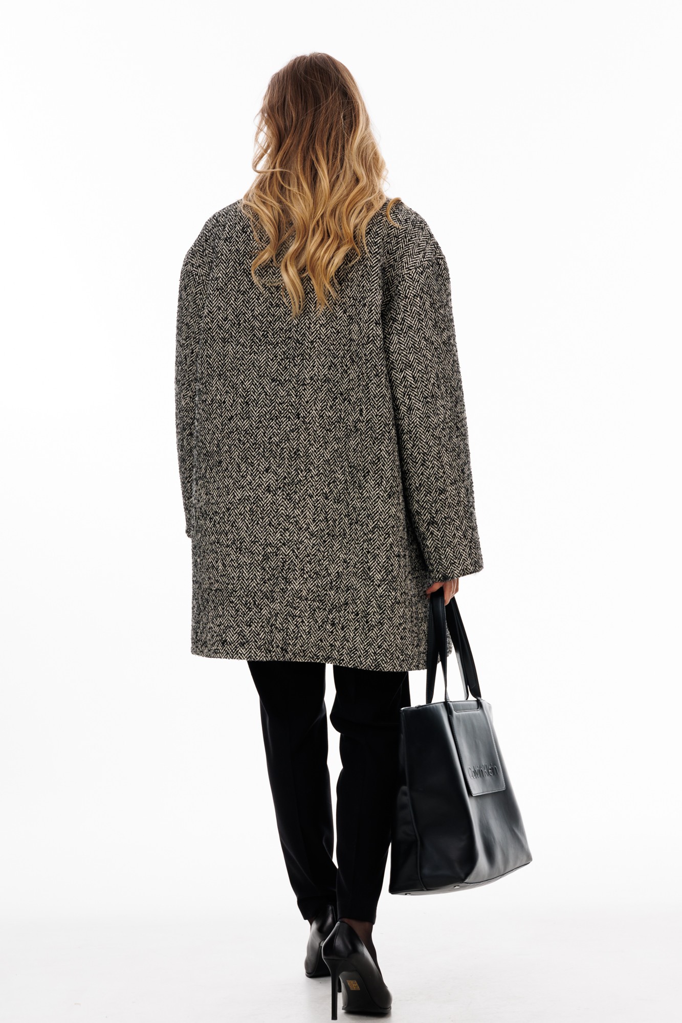 Полупальто выполнено из пальтовой ткани, меланж с рисунком елочка. Спереди накладные карманы, двубортная застежка. На спинке средний шов. Воротник пиджачного типа. Плечевой шов удлинен. Рукав рубашечного покроя, одношовный с локтевой вытачкой. Полупальто на притачной по низу подкладке.