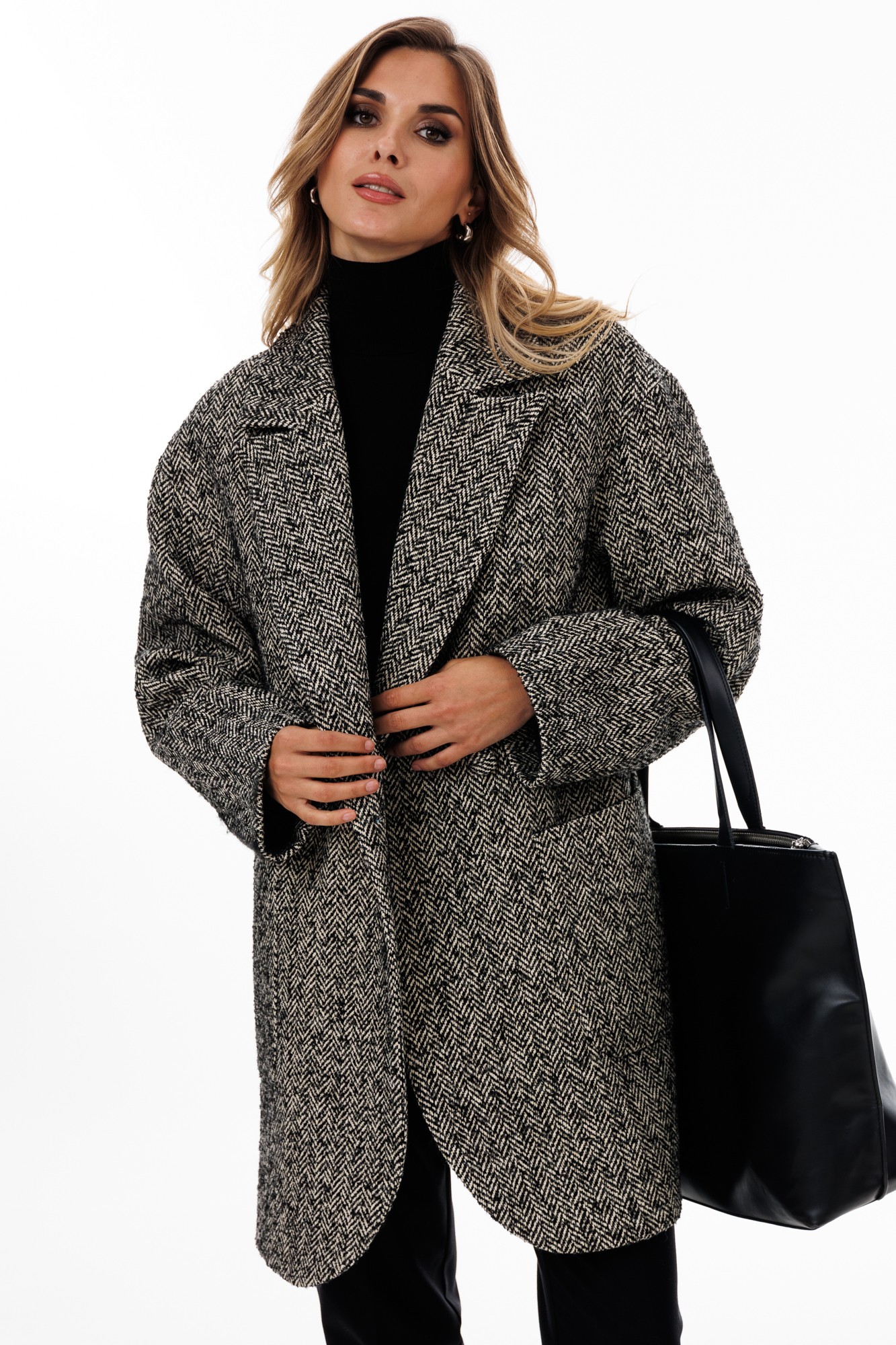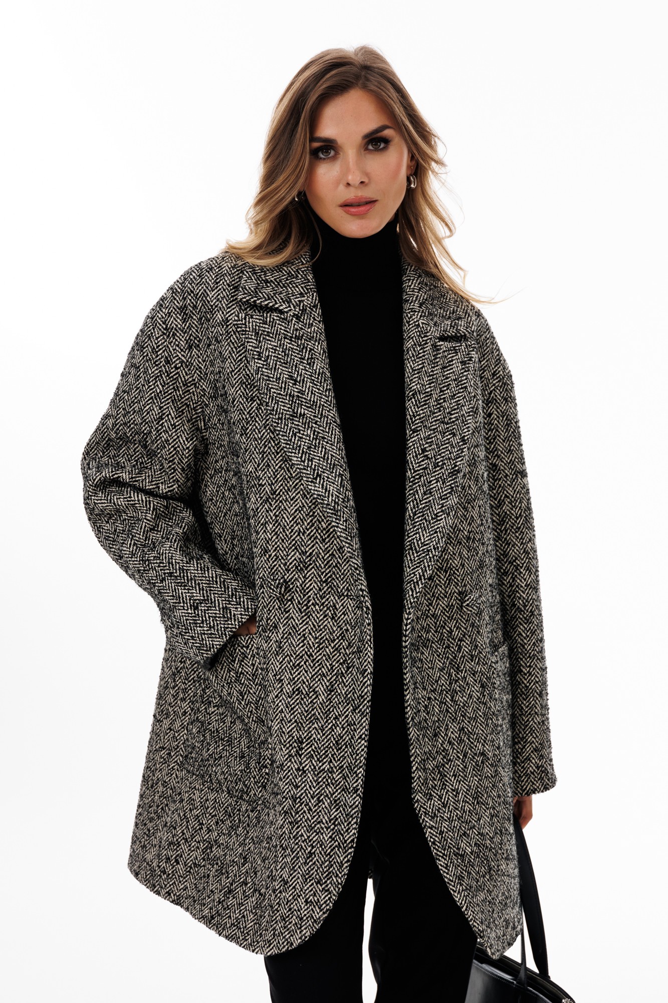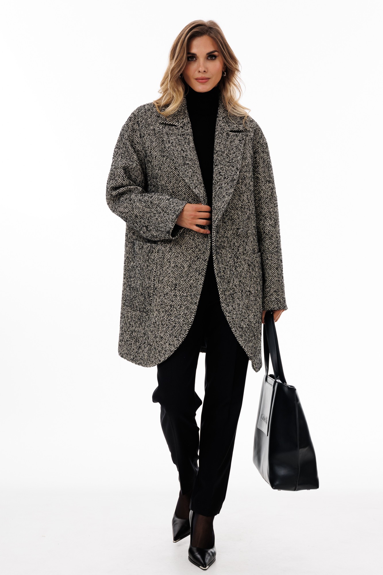 Полупальто выполнено из пальтовой ткани, меланж с рисунком елочка. Спереди накладные карманы, двубортная застежка. На спинке средний шов. Воротник пиджачного типа. Плечевой шов удлинен. Рукав рубашечного покроя, одношовный с локтевой вытачкой. Полупальто на притачной по низу подкладке.