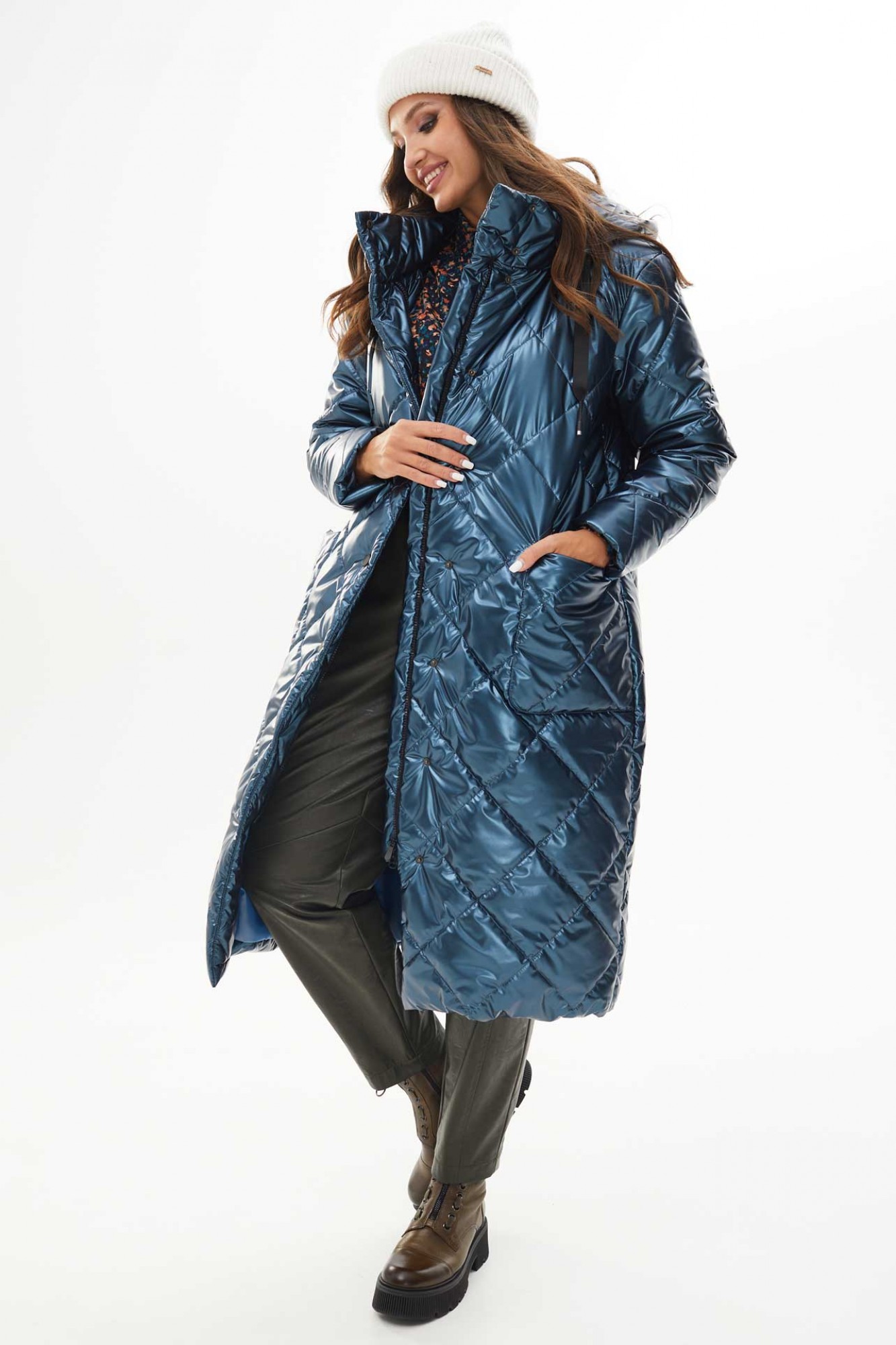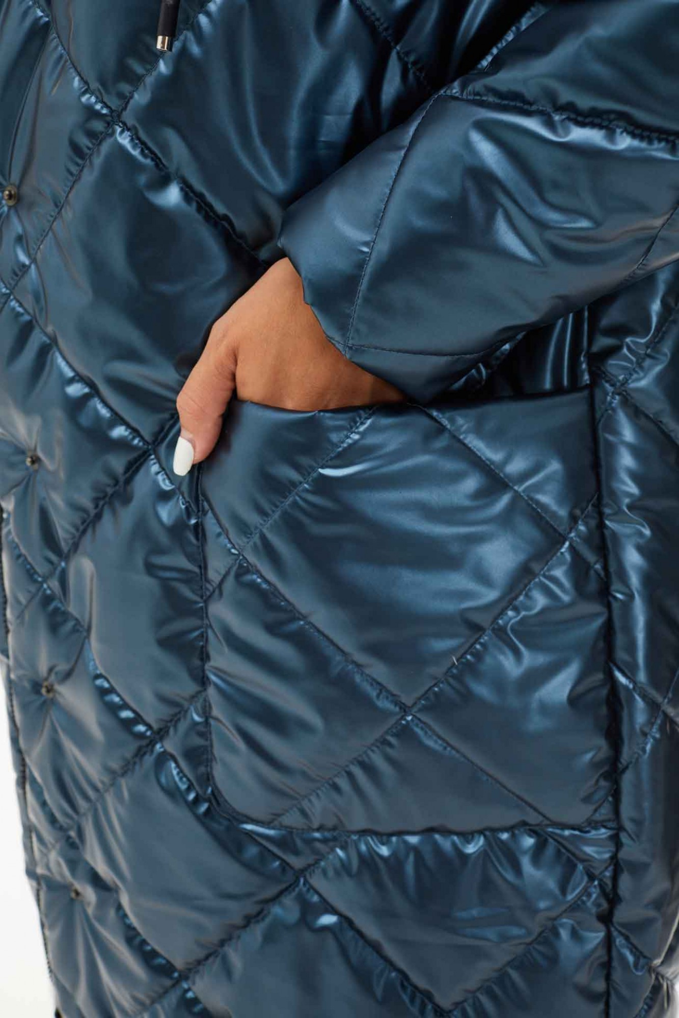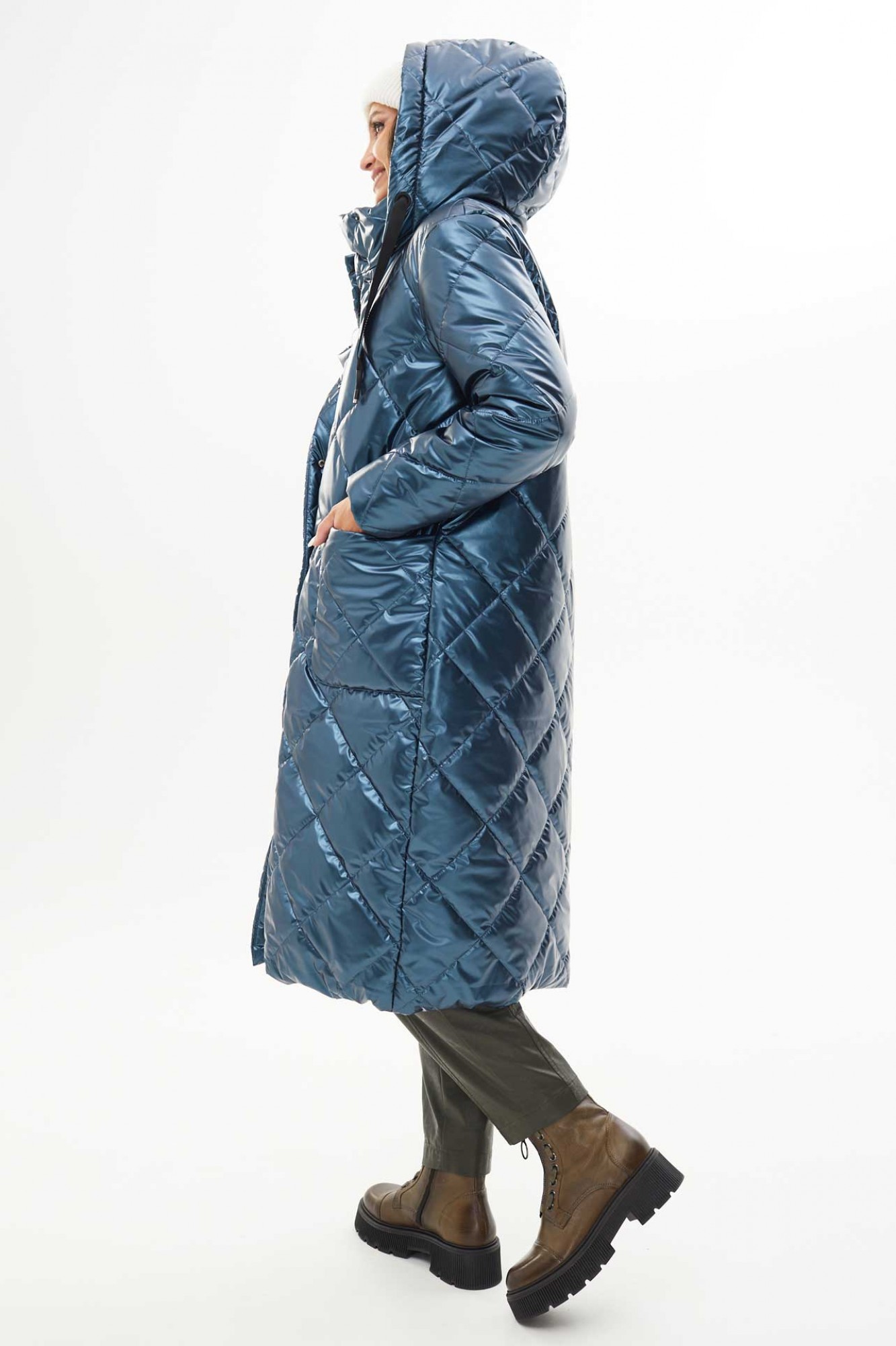 Пальто женское утеплённое осень-зима прямого силуэта с отстёгивающимся капюшоном, выполнено из ткани лаке на утеплителе изософт. По переду большие накладные карманы и застёжка на металлические кнопки. Низ пальто стягивается на шнур. Воротник стойка. Рукава одно шовные втачные. Подкладка простёгана с утеплителем изософт (250гр).