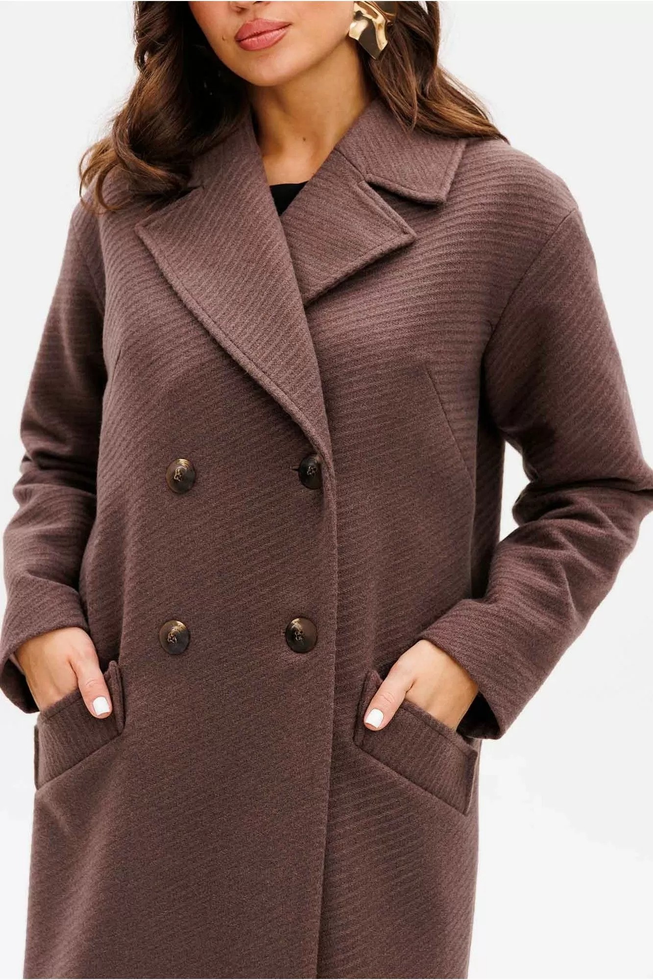 Пальто женское прямого силуэта, выполнено из пальтовой фактурной ткани. По переду нагрудные вытачки, застежка центральная двубортная на четыре прорезные петли и пуговицы, карманы прорезные с клапанами. Рукава двух шовные втачные со спущенным плечом. Центральный шов спинки заканчивается шпицей.