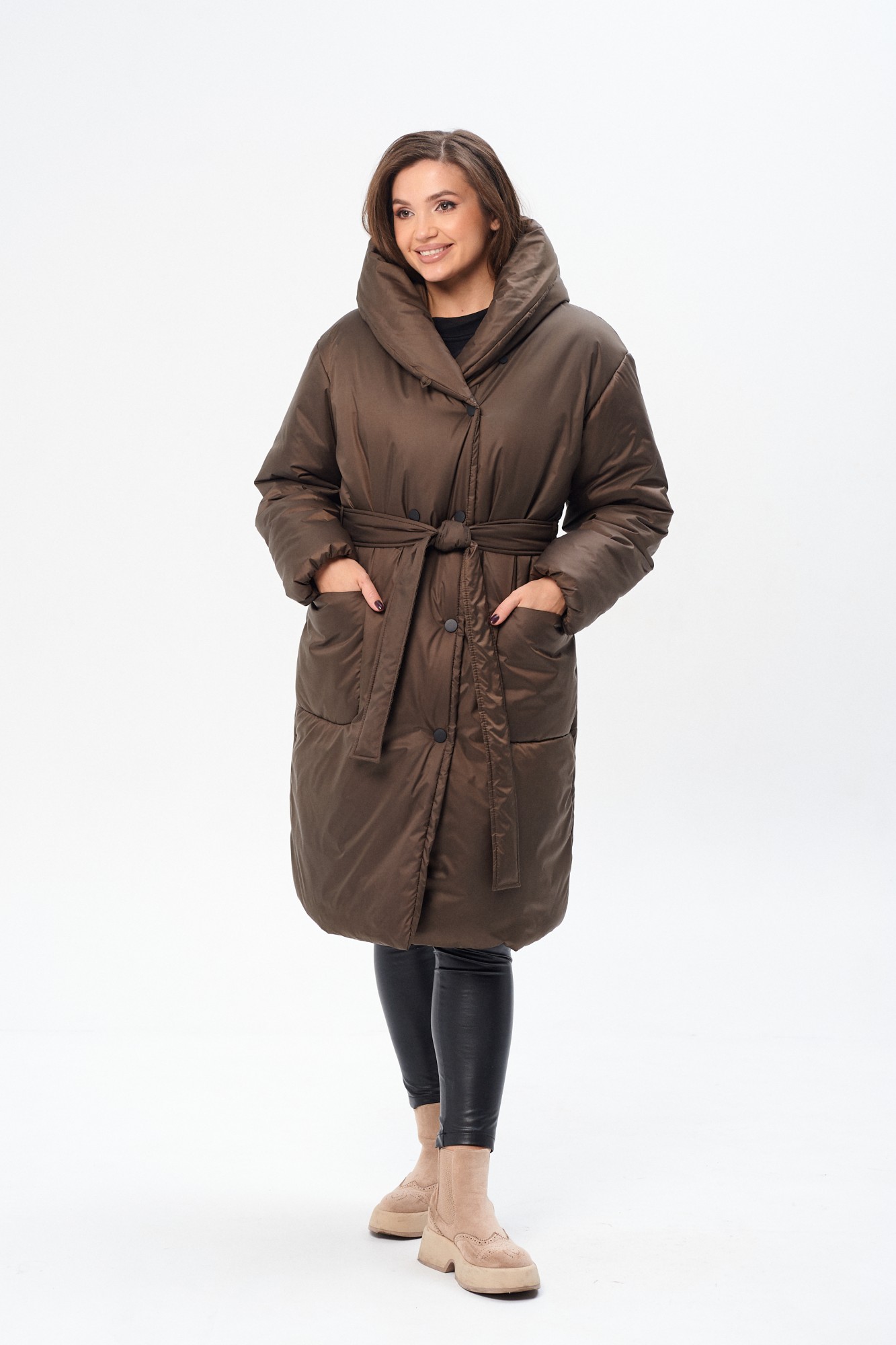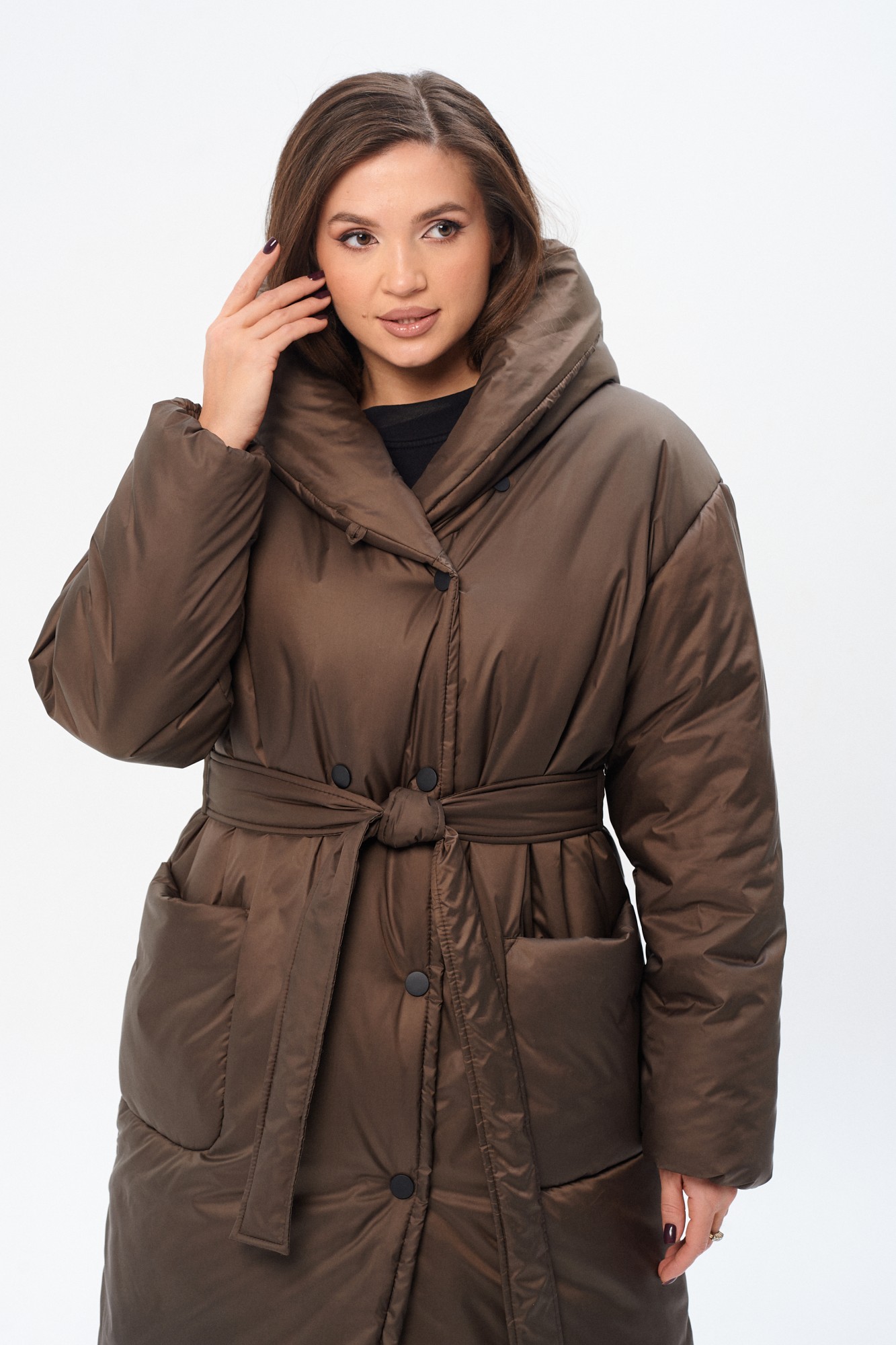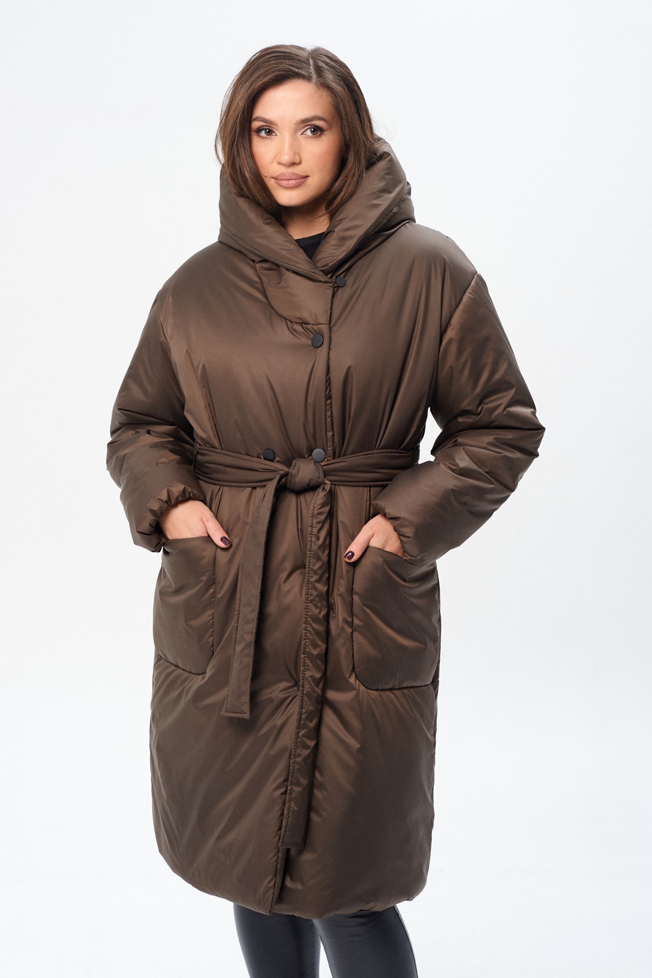Утепленное женское двубортное пальто свободного кроя c капюшоном и поясом. Утеплитель микрофайбер (300г/м2), изделие предназначено для эксплуатации в осенне-зимний период с температурой воздуха до -20 градусов по Цельсию (указанная температура комфорта может зависеть от индивидуальной восприимчивости к холоду). Сезон зима. На полочке накладные закругленные карманы. Рукав прямой, линия плеча, спущенная. По переду застежка на металлические кнопки. Изделие из ткани с водоотталкивающим эффектом.