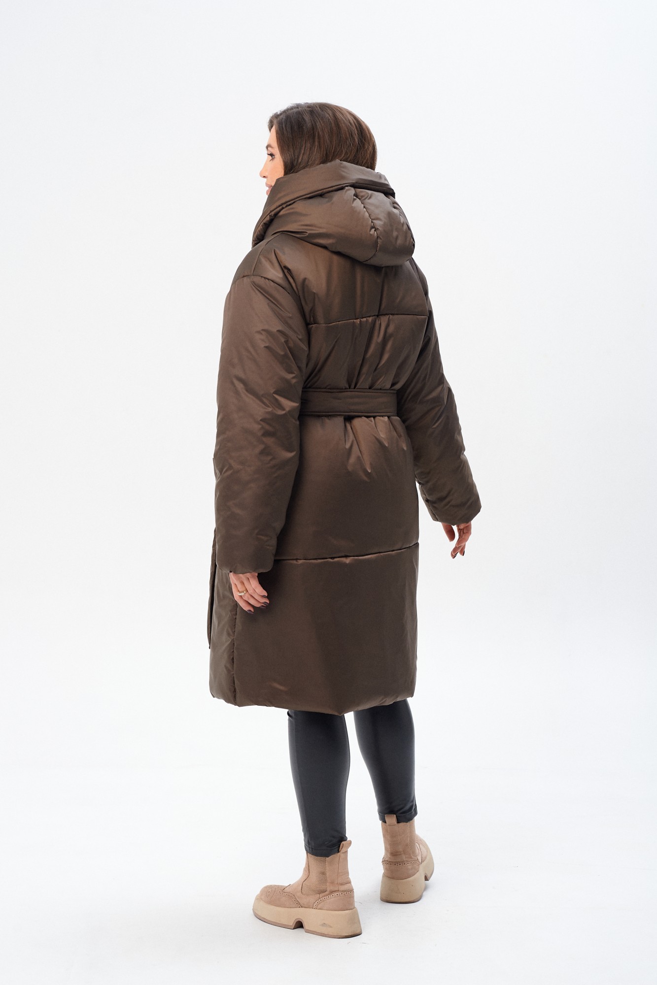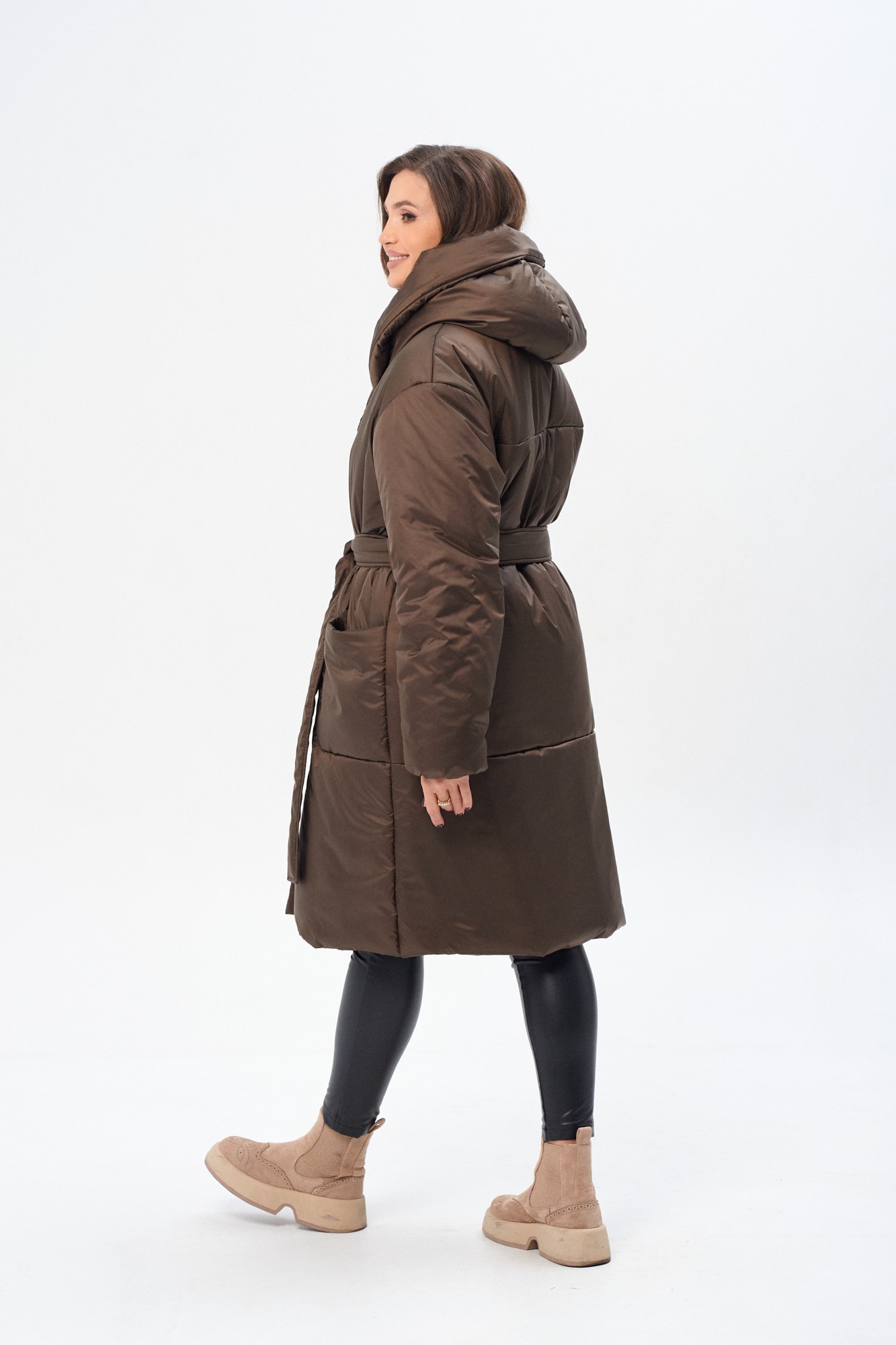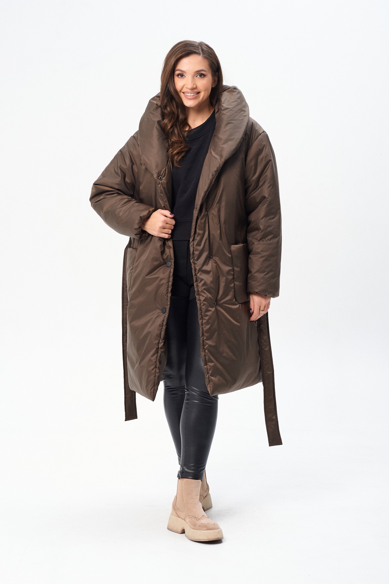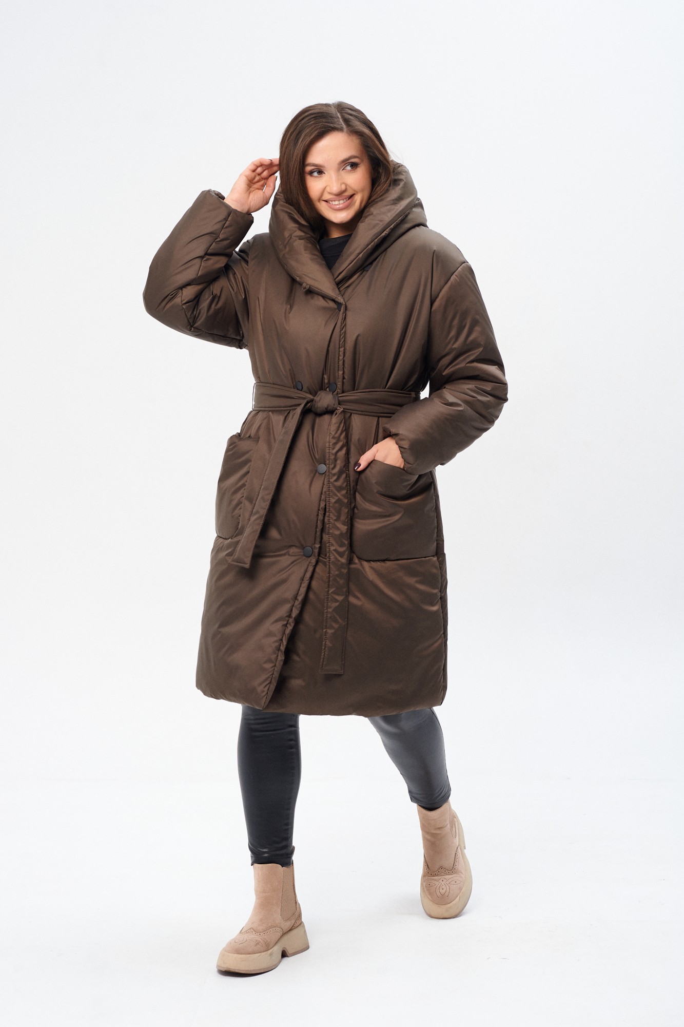 Утепленное женское двубортное пальто свободного кроя c капюшоном и поясом. Утеплитель микрофайбер (300г/м2), изделие предназначено для эксплуатации в осенне-зимний период с температурой воздуха до -20 градусов по Цельсию (указанная температура комфорта может зависеть от индивидуальной восприимчивости к холоду). Сезон зима. На полочке накладные закругленные карманы. Рукав прямой, линия плеча, спущенная. По переду застежка на металлические кнопки. Изделие из ткани с водоотталкивающим эффектом.