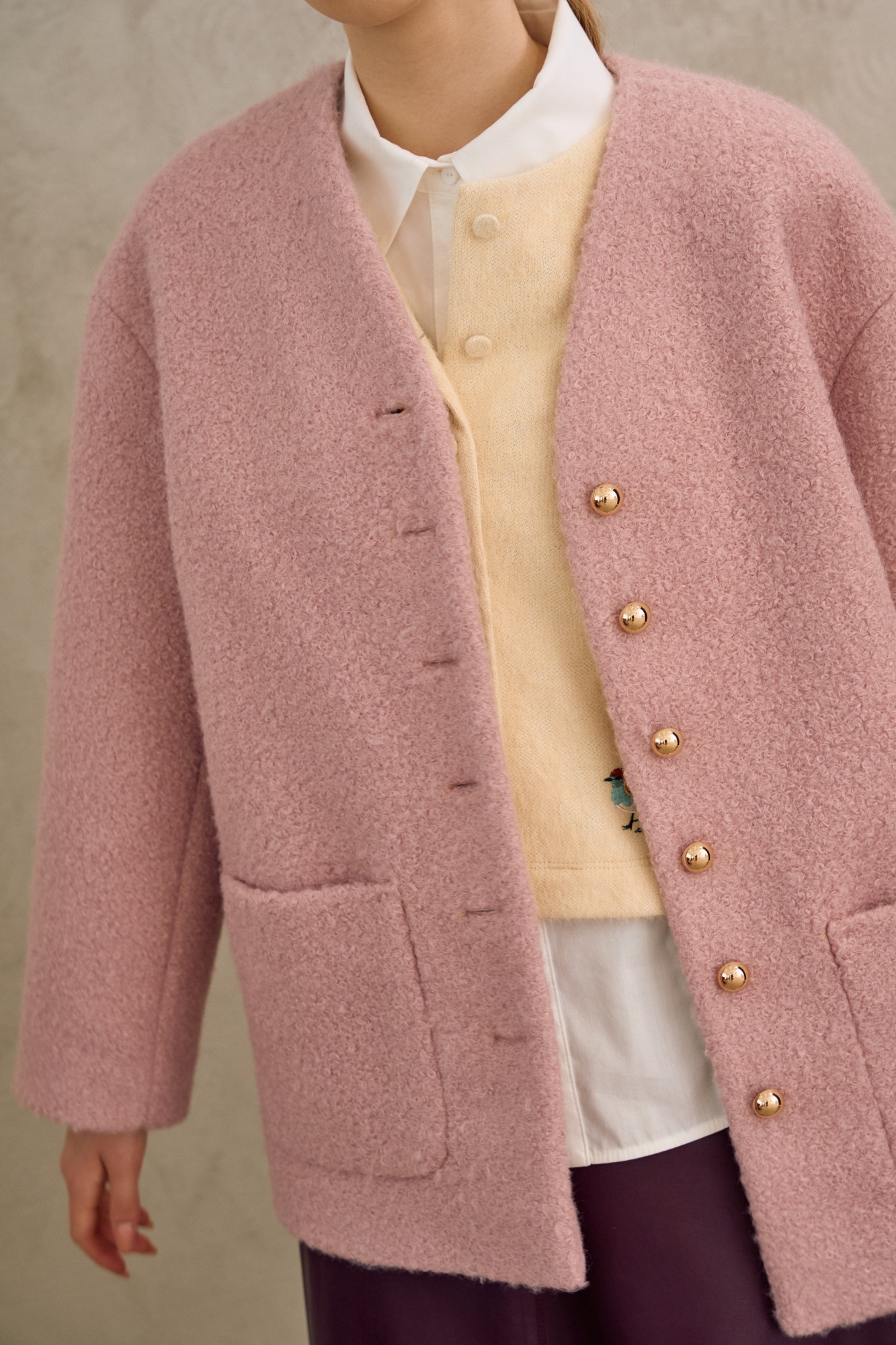 Полупальто свободного кроя, прямого силуэта на подкладке. Линия плеча спущена. Рукав длинный, по шлице рукава пришит ряд металлических пуговиц. Y-образный вырез горловины. Застежка на петли и пуговицы. По переду накладные карманы.