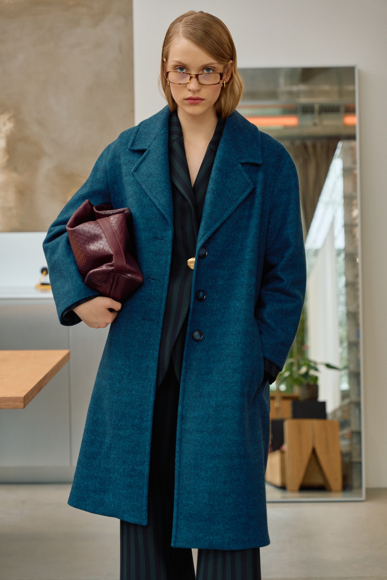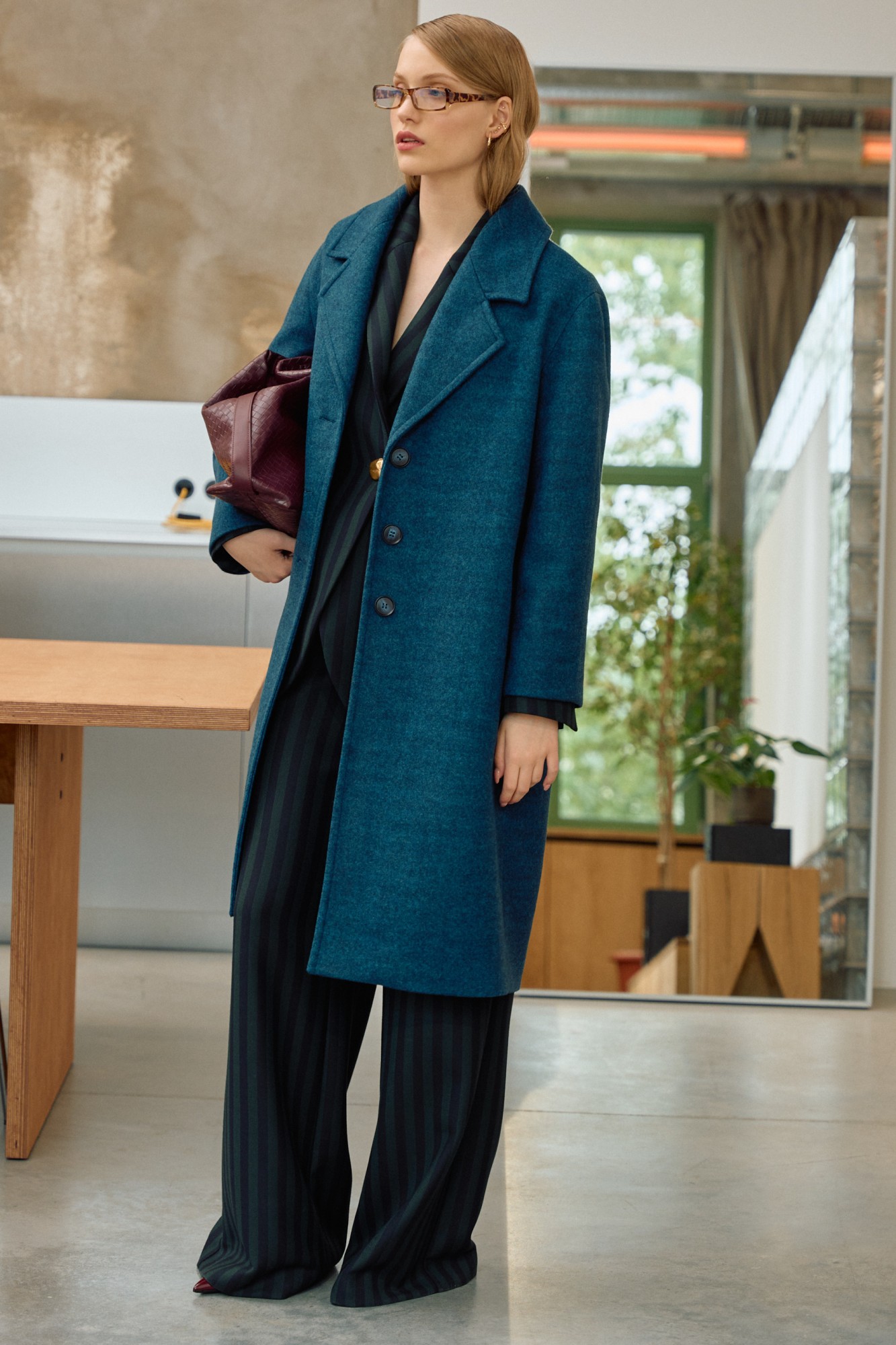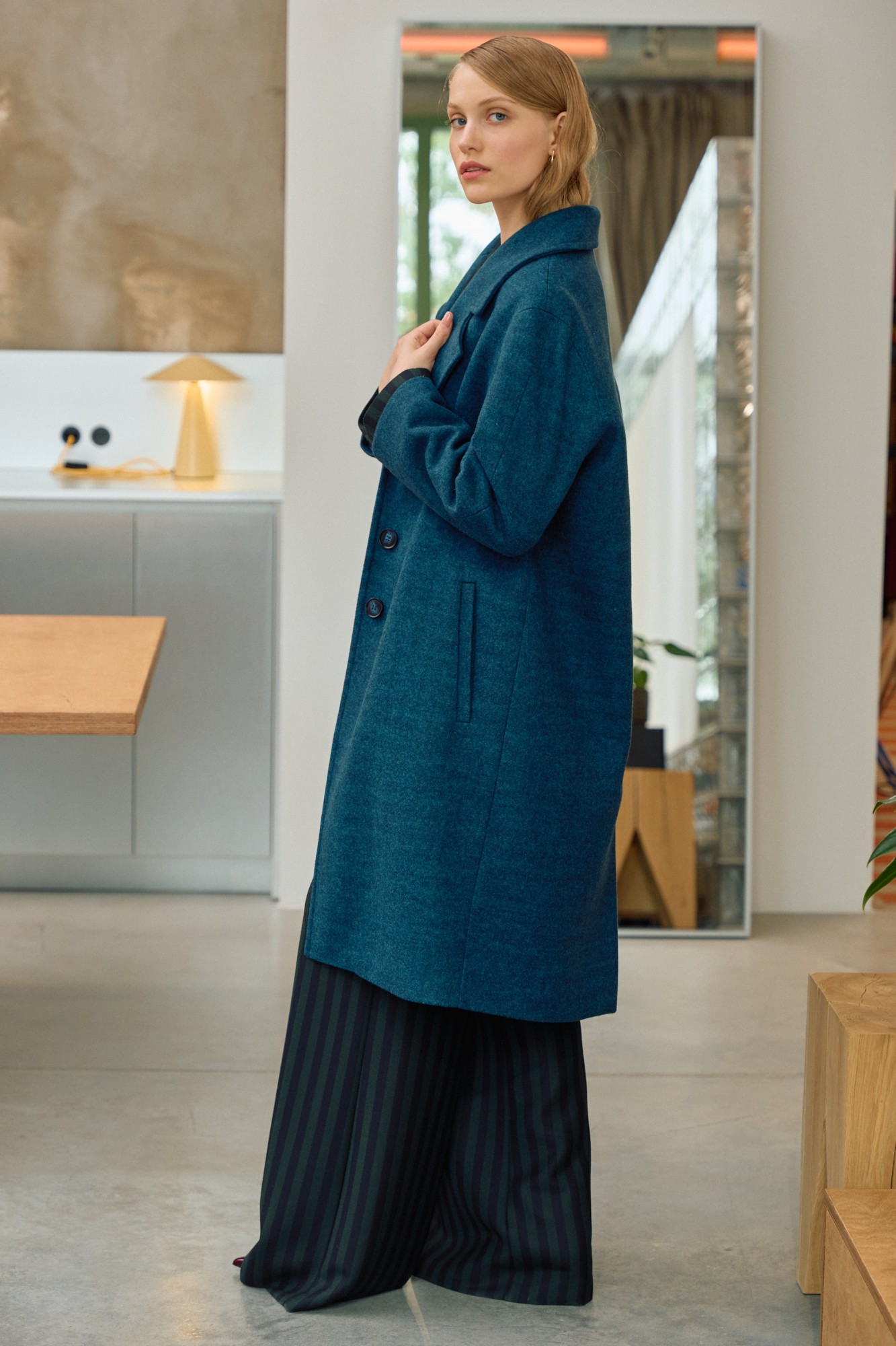 Пальто свободного кроя на подкладке. Линия плеча спущена, рукав длинный. Воротник пиджачного типа, застежка центральная на петли и пуговицы, в боковых швах карманы.