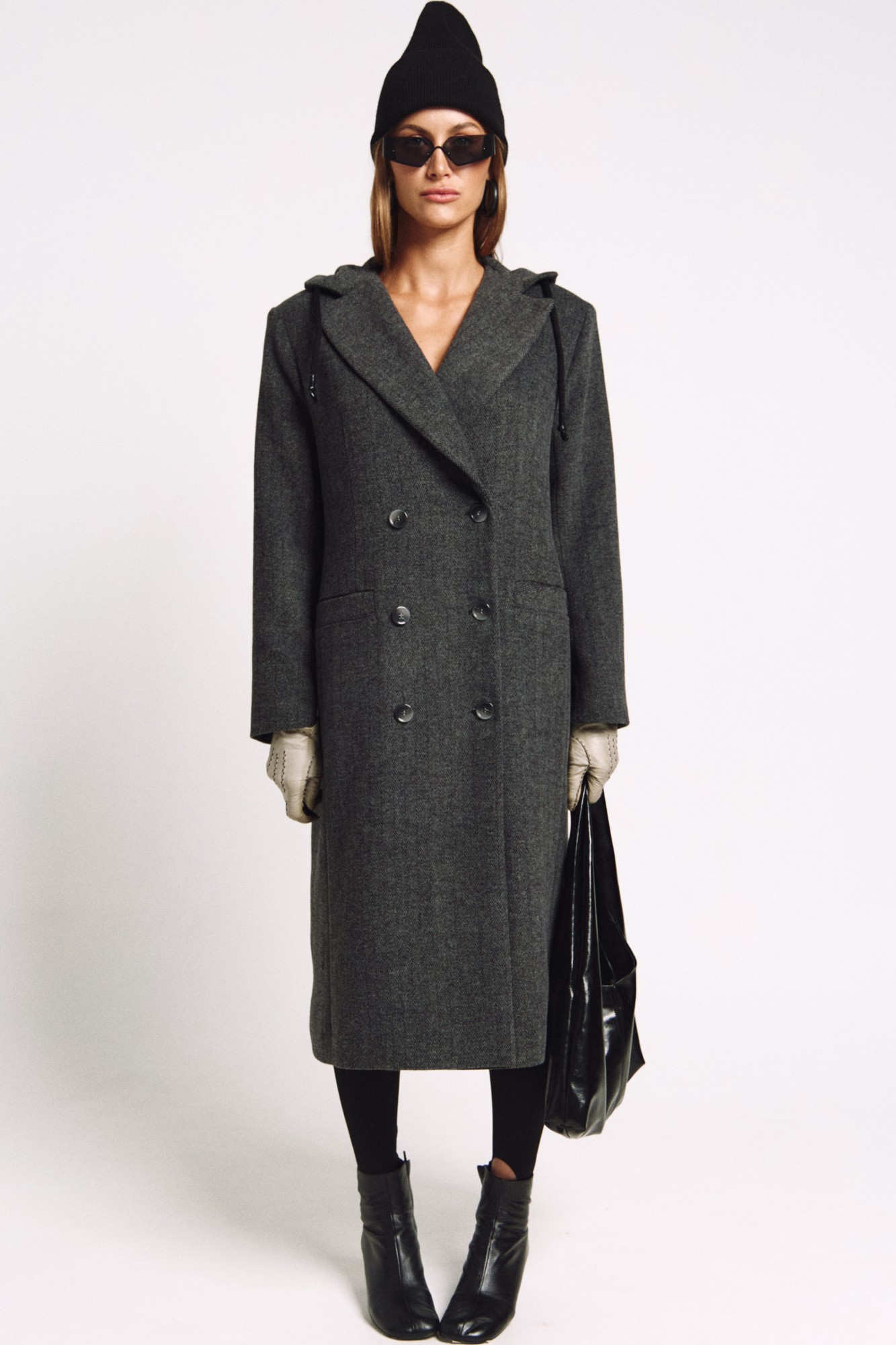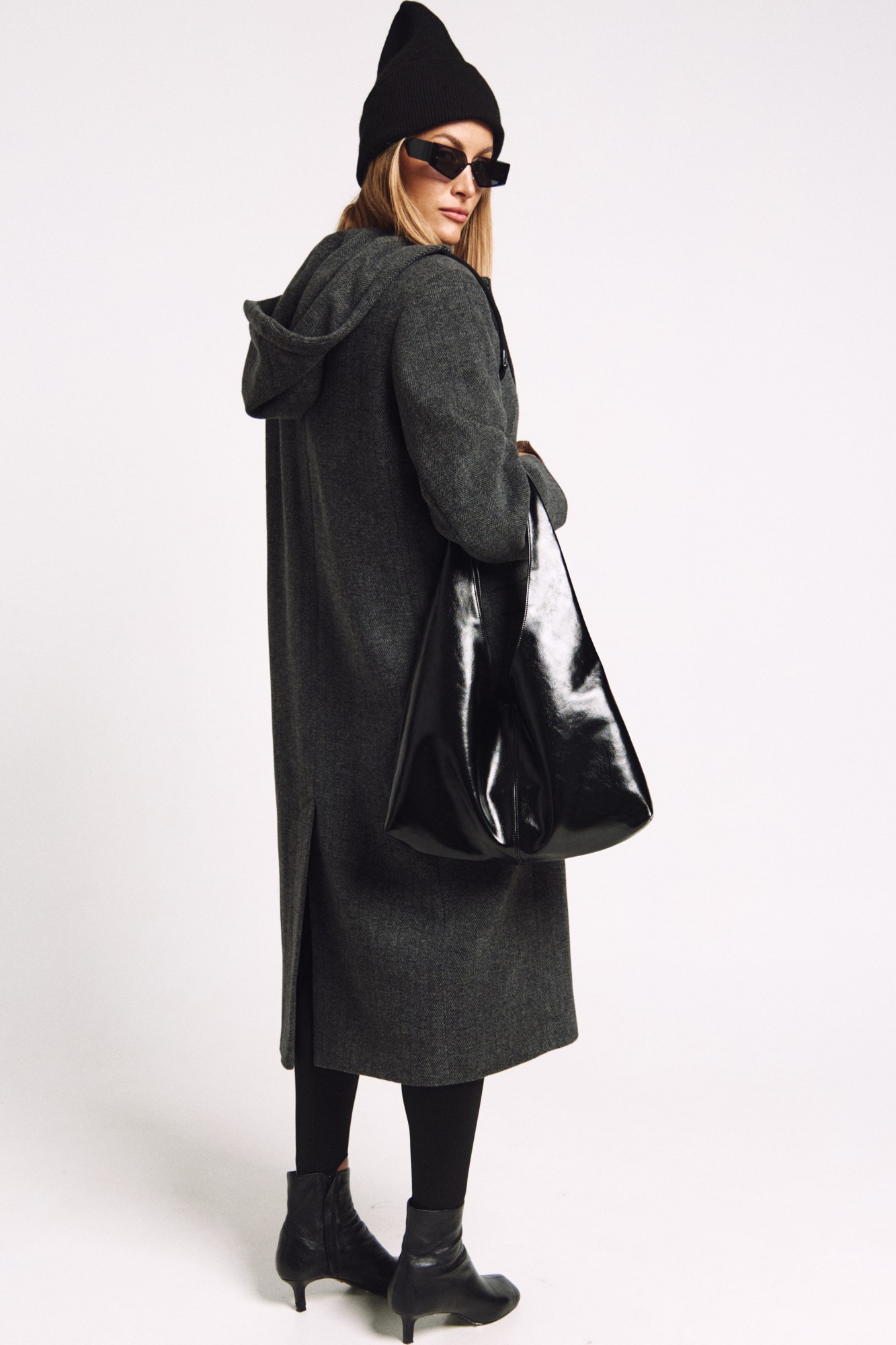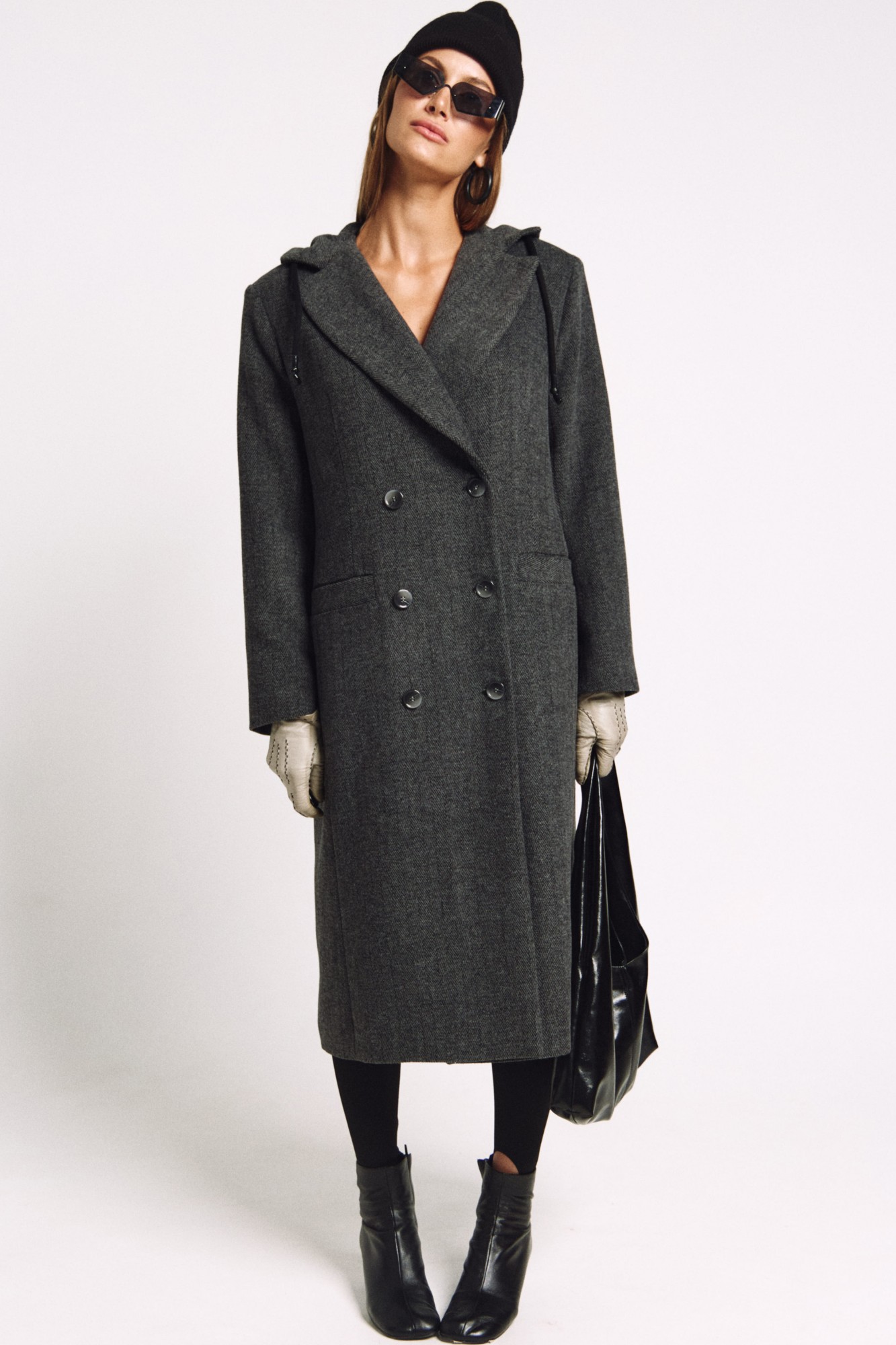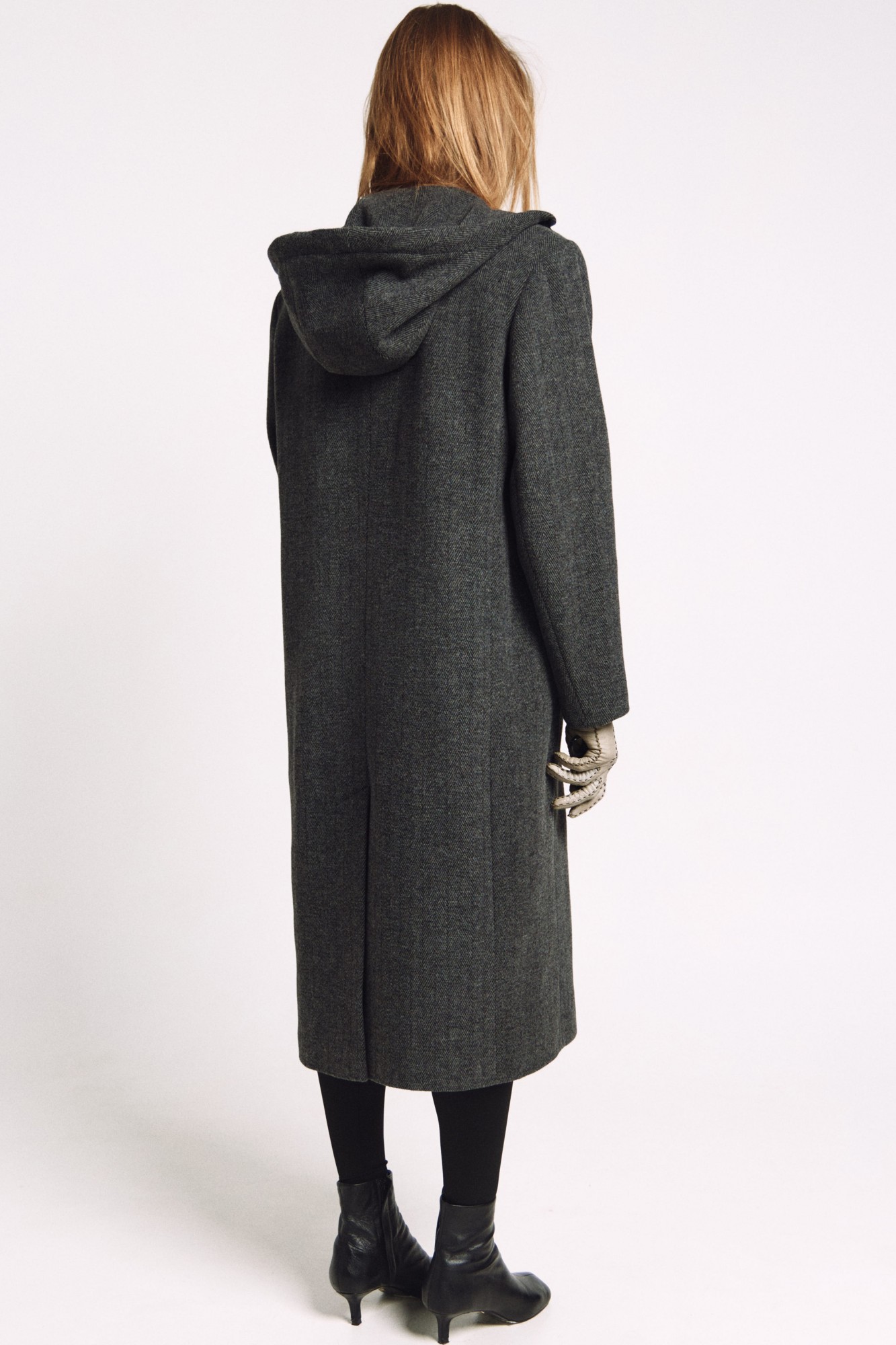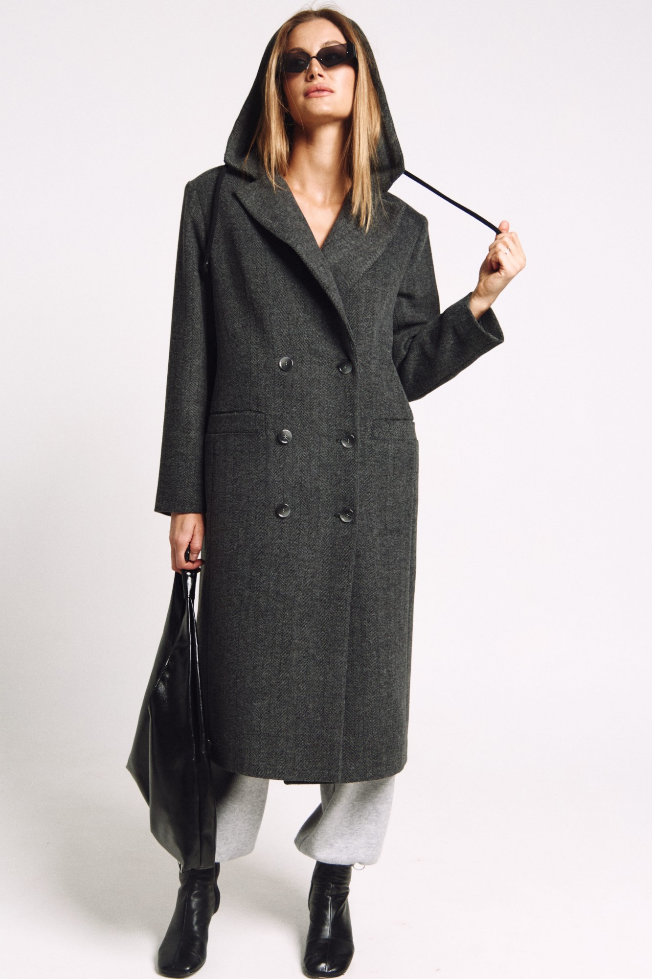 Жакет из пальтовой ткани, удлиненный, на подкладке. Капюшон конструктивно из верхней части воротника.