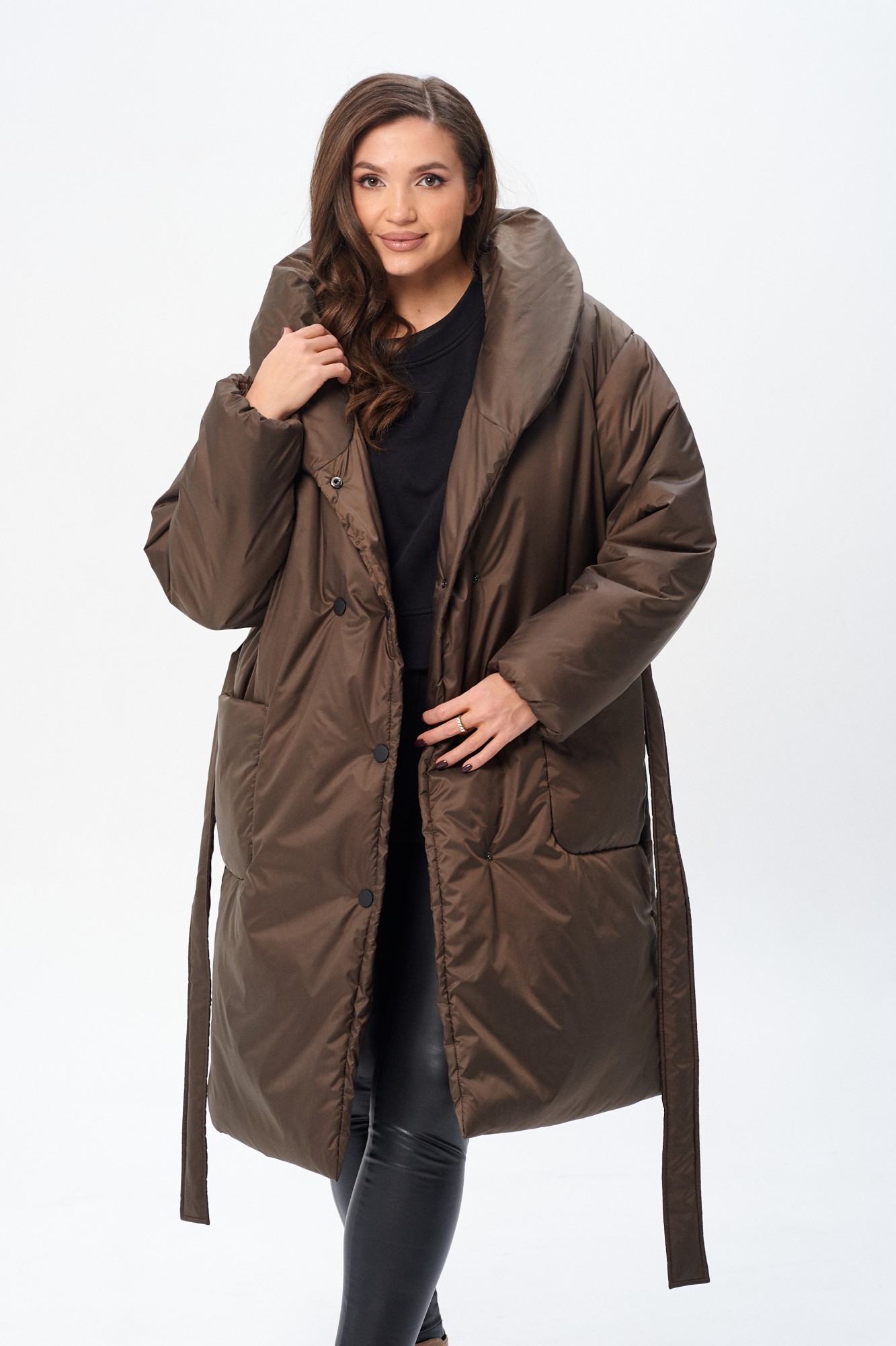 Утепленное женское двубортное пальто свободного кроя c капюшоном и поясом. Утеплитель микрофайбер (300г/м2), изделие предназначено для эксплуатации в осенне-зимний период с температурой воздуха до -20 градусов по Цельсию (указанная температура комфорта может зависеть от индивидуальной восприимчивости к холоду). Сезон зима. На полочке накладные закругленные карманы. Рукав прямой, линия плеча, спущенная. По переду застежка на металлические кнопки. Изделие из ткани с водоотталкивающим эффектом.