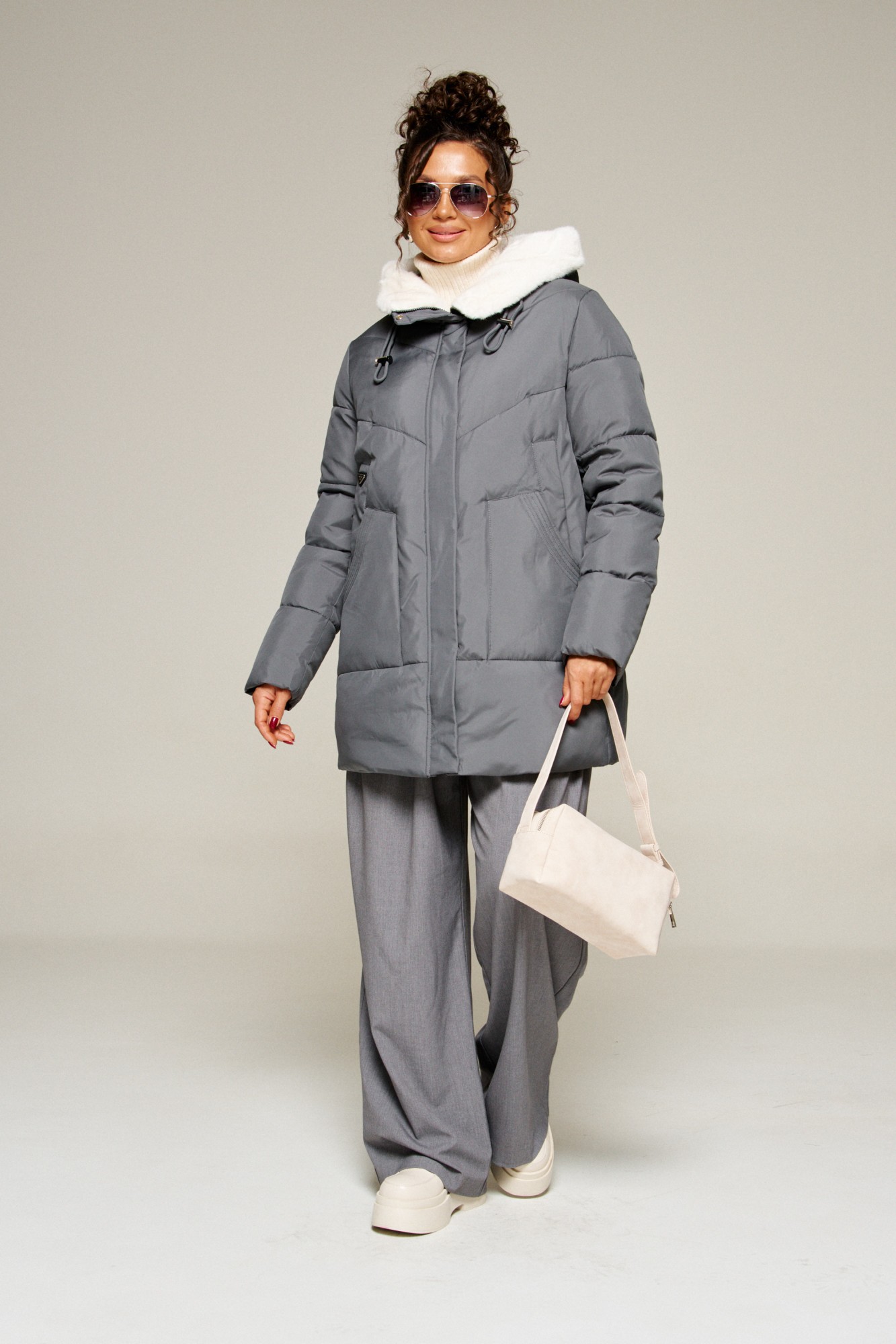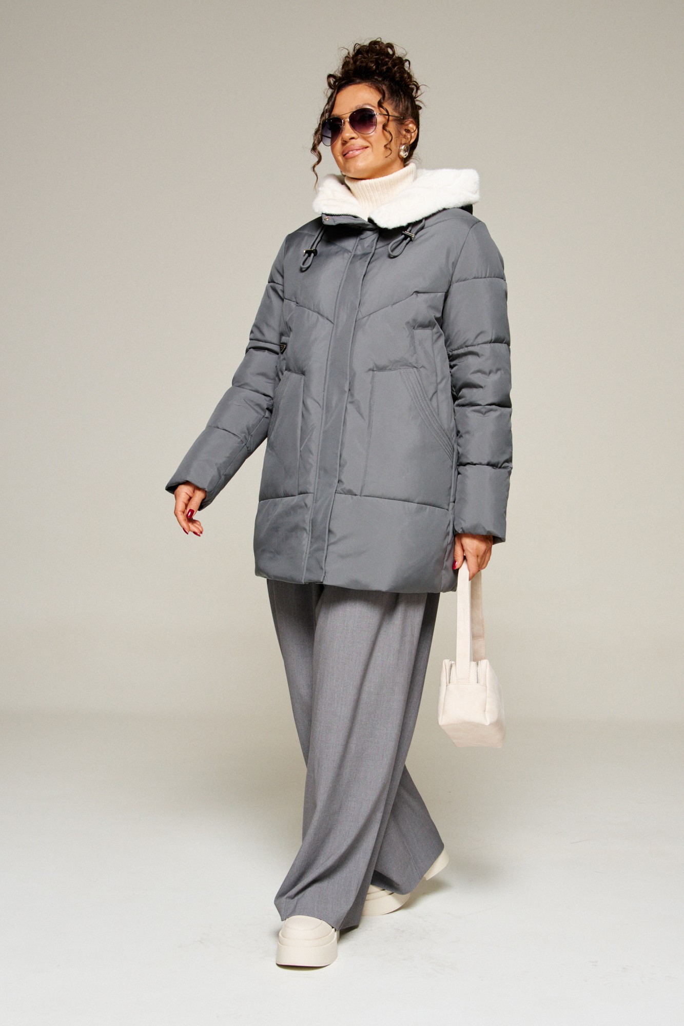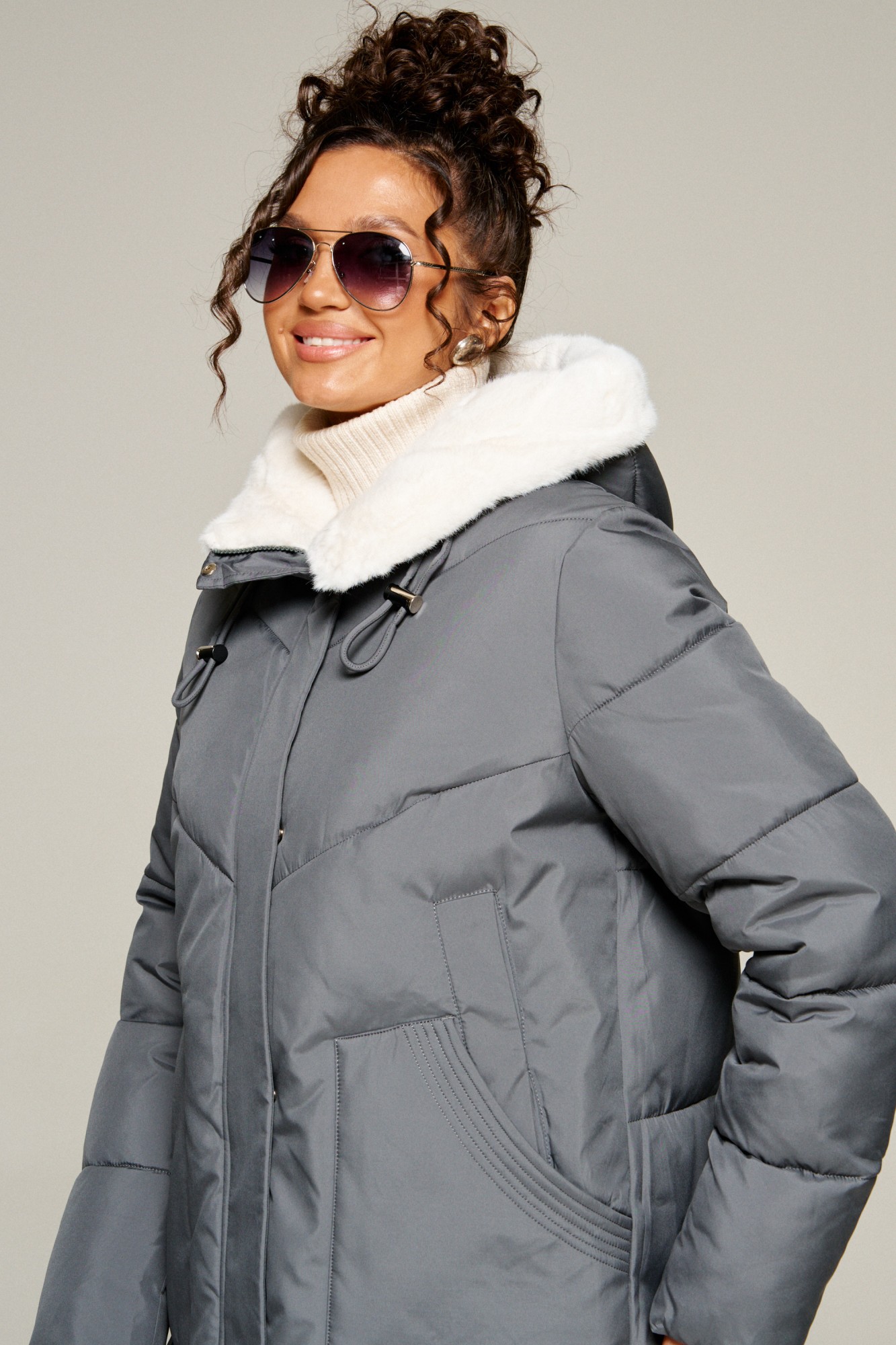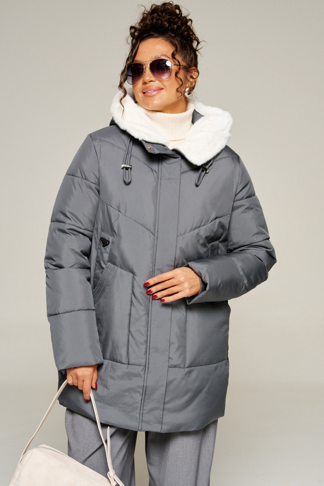 Капюшон с застежкой спереди умеренного объема. По периметру капюшона с внутренней стороны выполнена оторочка из искусственного меха, которая выполняет декоративную и защитную функции, создавая дополнительное тепло и защиту от ветра и холода.