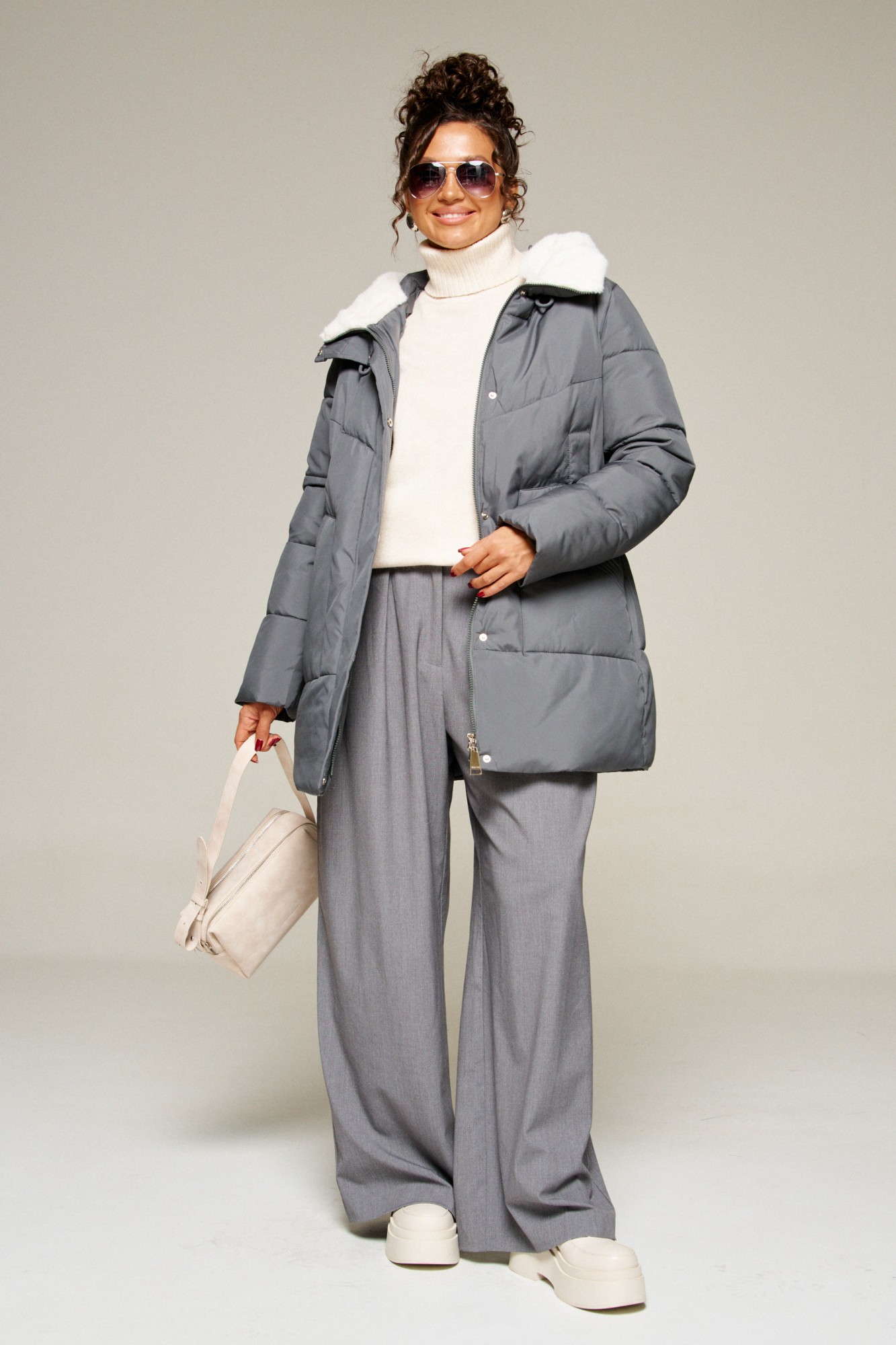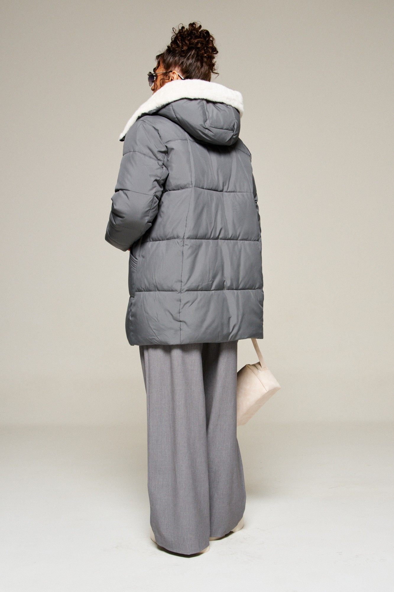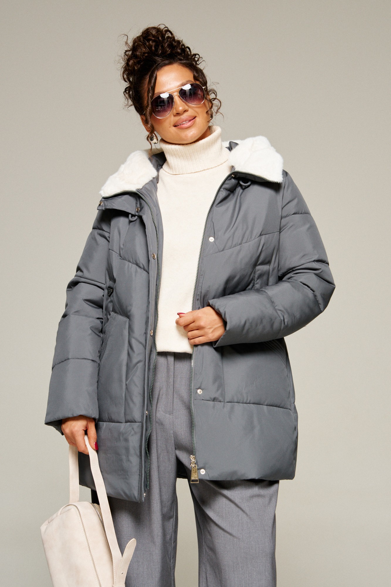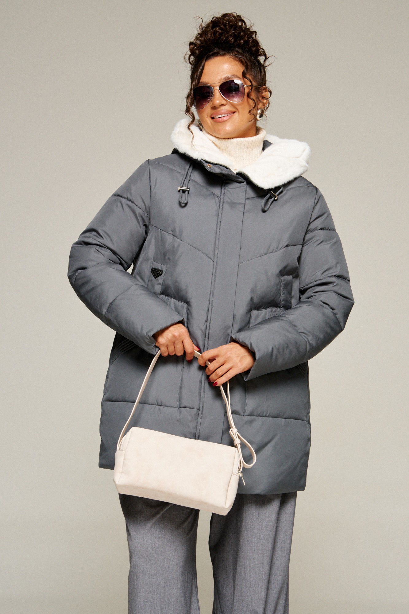 Капюшон с застежкой спереди умеренного объема. По периметру капюшона с внутренней стороны выполнена оторочка из искусственного меха, которая выполняет декоративную и защитную функции, создавая дополнительное тепло и защиту от ветра и холода.