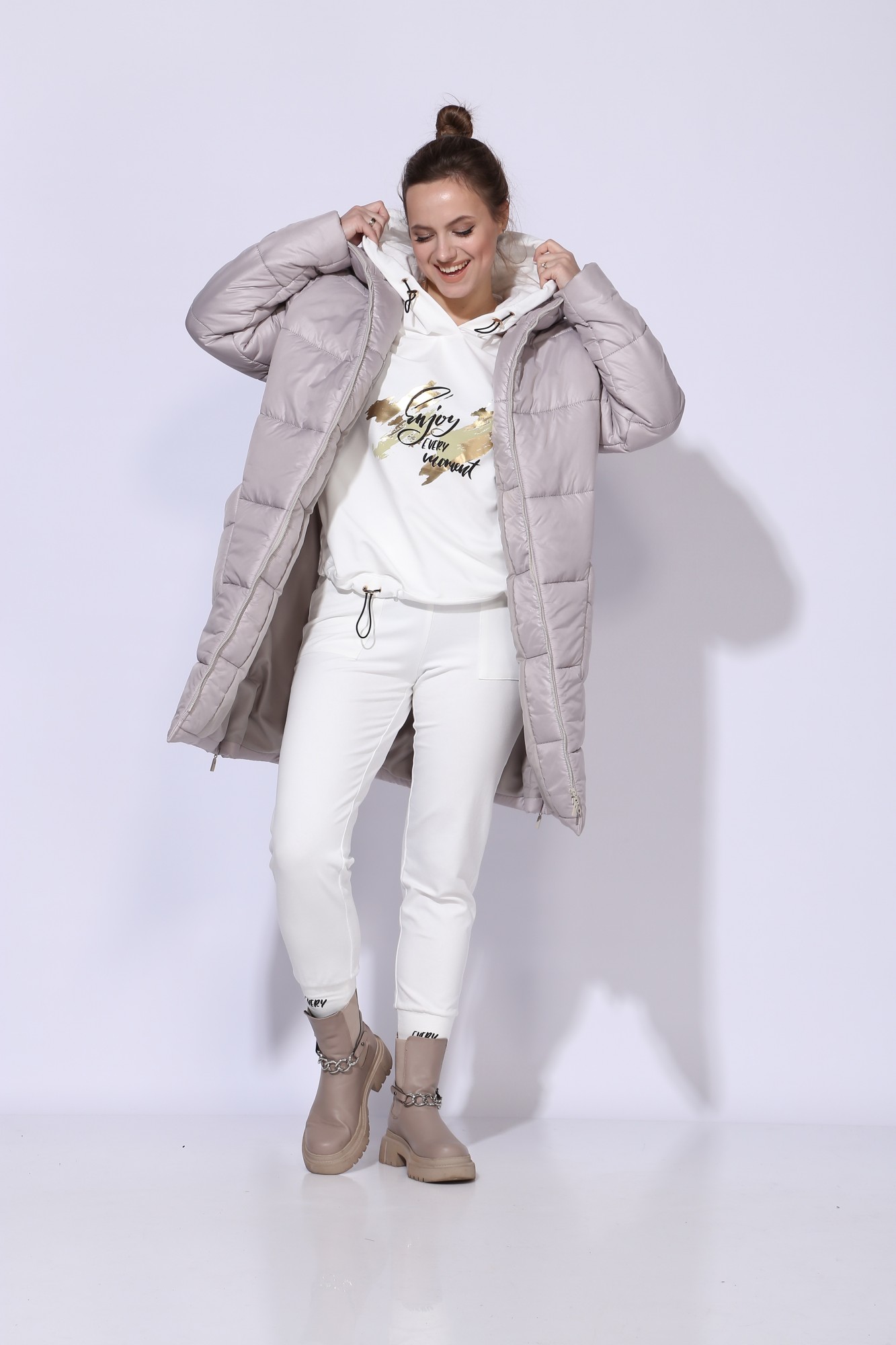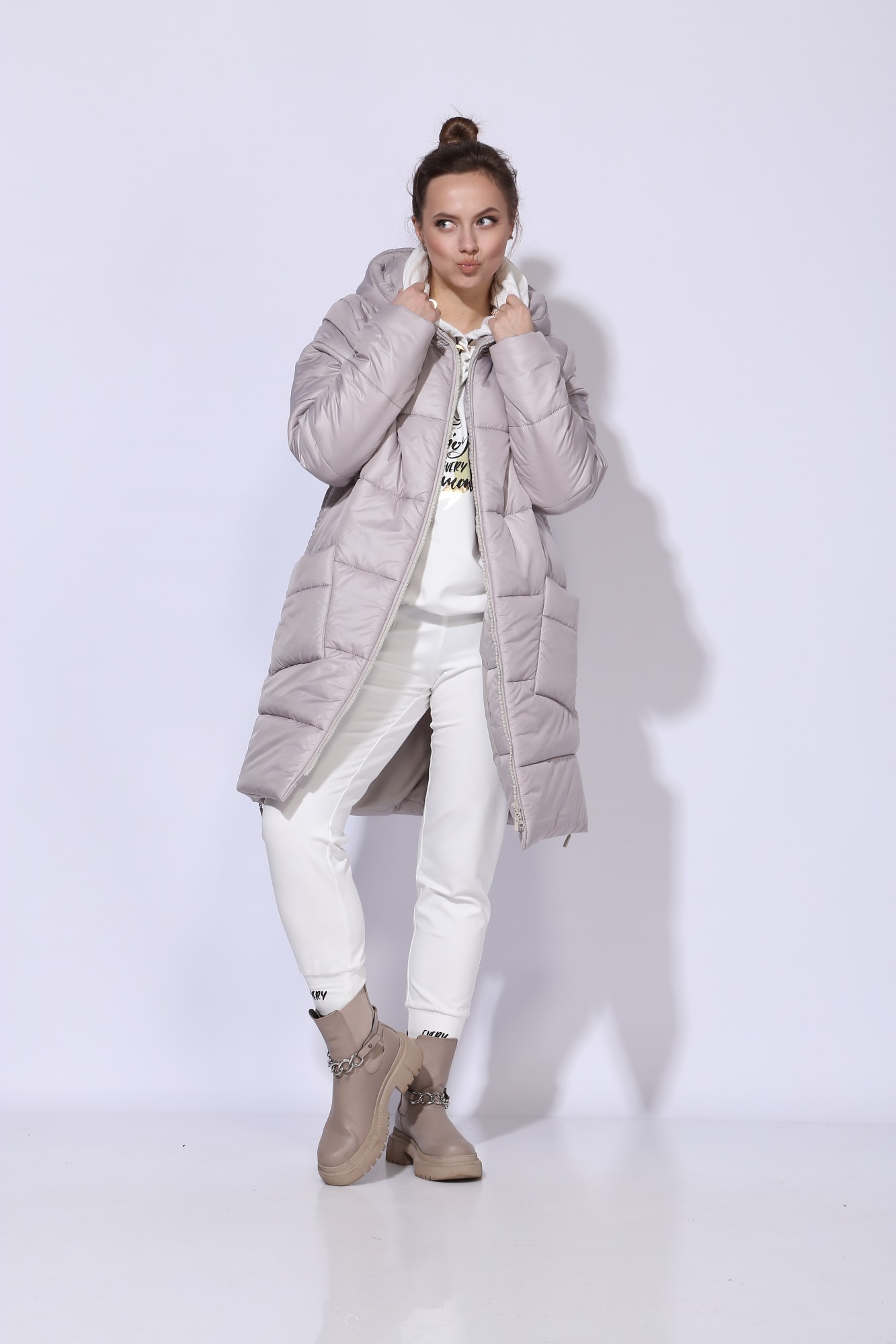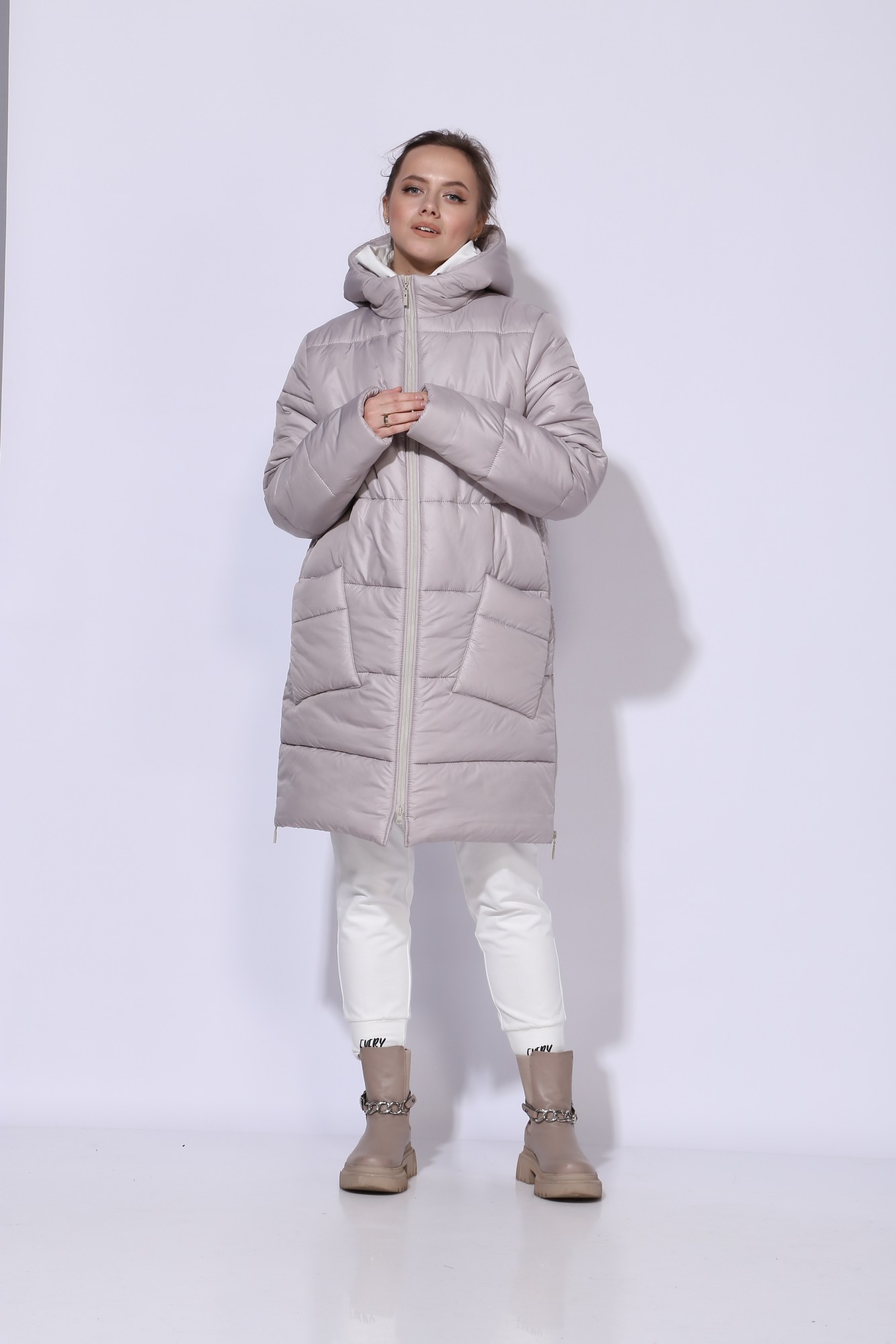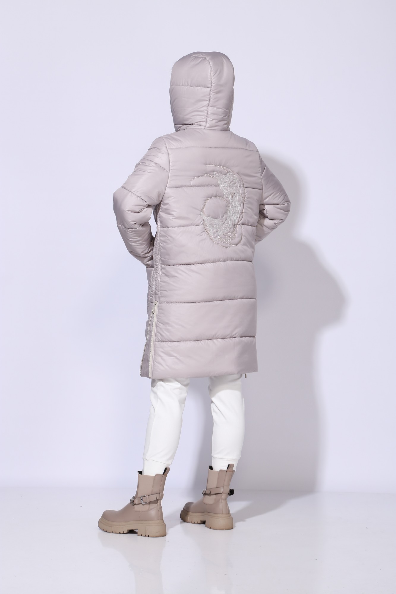 Стильное и комфортное пальто прямого силуэта с длинным рукавом, выполнено из плащевой стеганной ткани на утеплителе HOOPON. Пальто на подкладке. По переду наклонные накладные карманы. Застежка спереди на тесьму-молнию. Горловина оформлена капюшоном. По бокам снизу-молнии. На спинке дизайнерская вышивка.