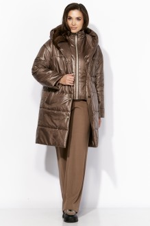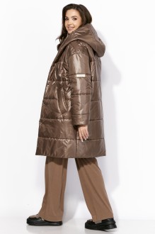 Пальто женское, прямого силуэта, с длинным рукавом. Длину рукава можно регулировать отложной манжетой. На левом рукаве отделочная нашивка. Рукав со спущенной линией плеча. По переду карманы "листочки" Горловина оформлена капюшоном, с отрезными бортами. Застежка центральная , однобортная, на кнопки. По переду, втачная деталь с воротником стойка, имитация жилетки, с застежкой на тесьму "молния" Спинка без особенностей. Пальто на подкладке. Синтепон VS-200.