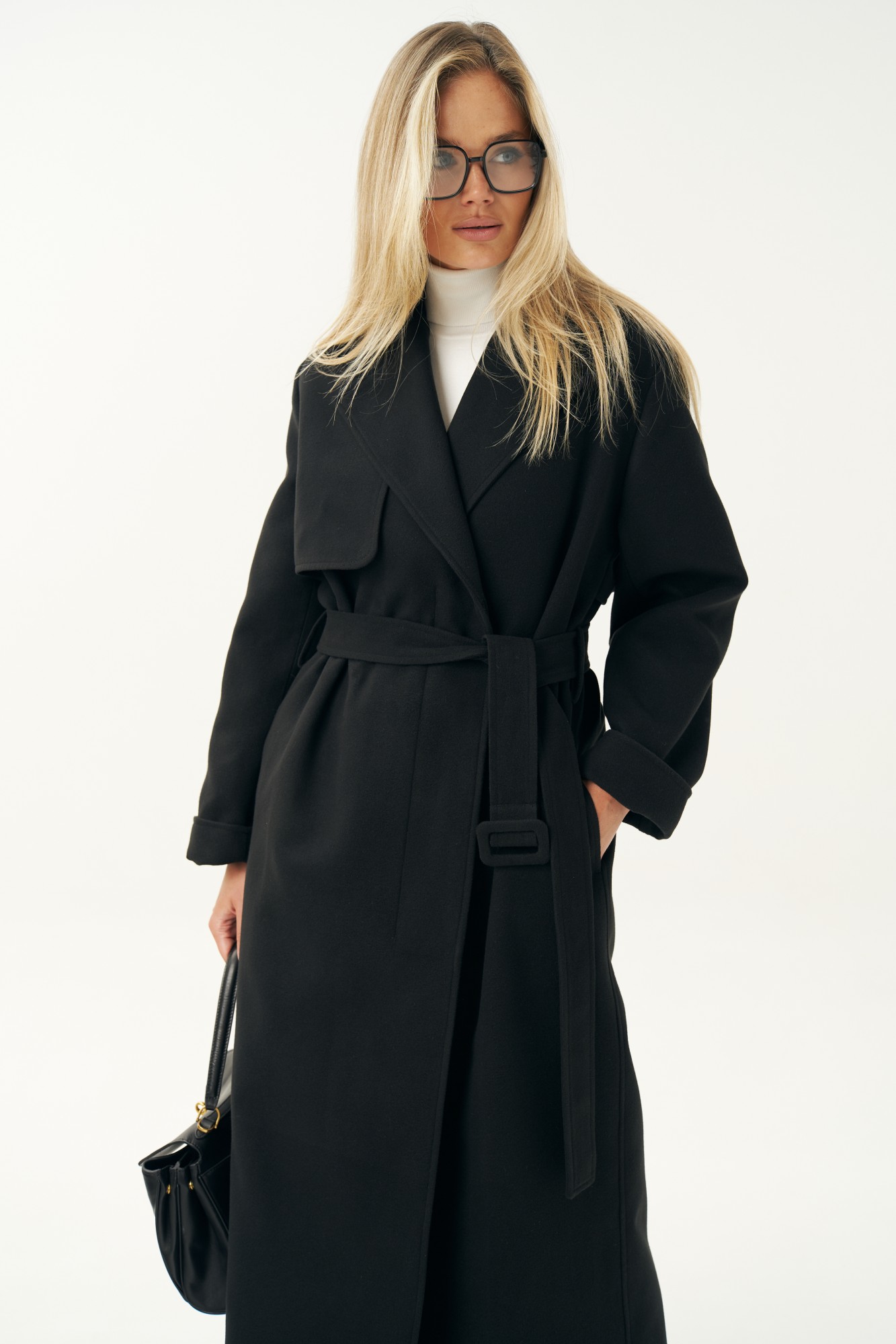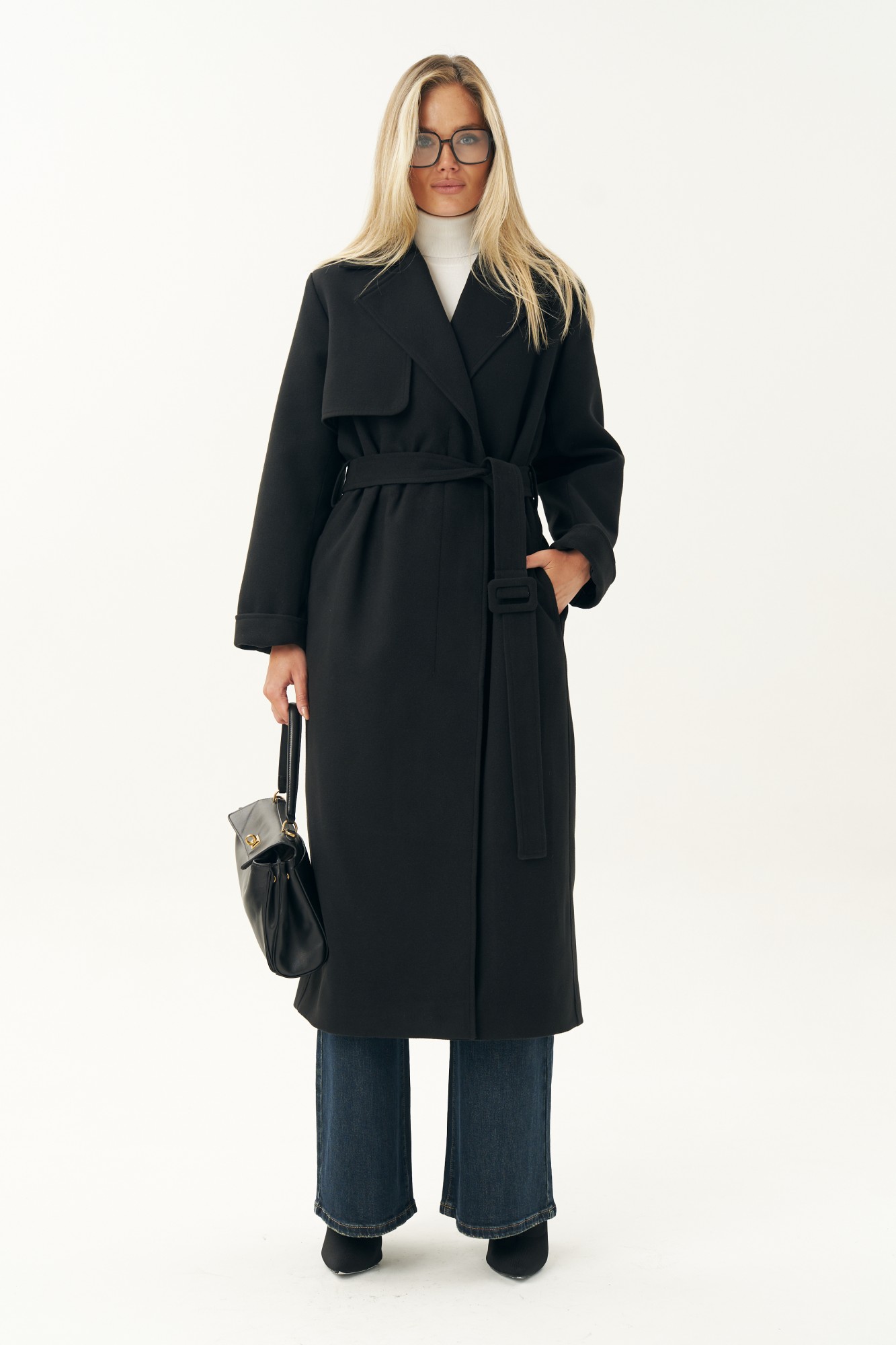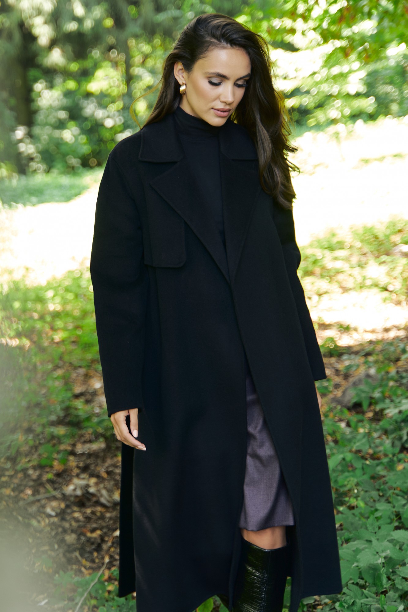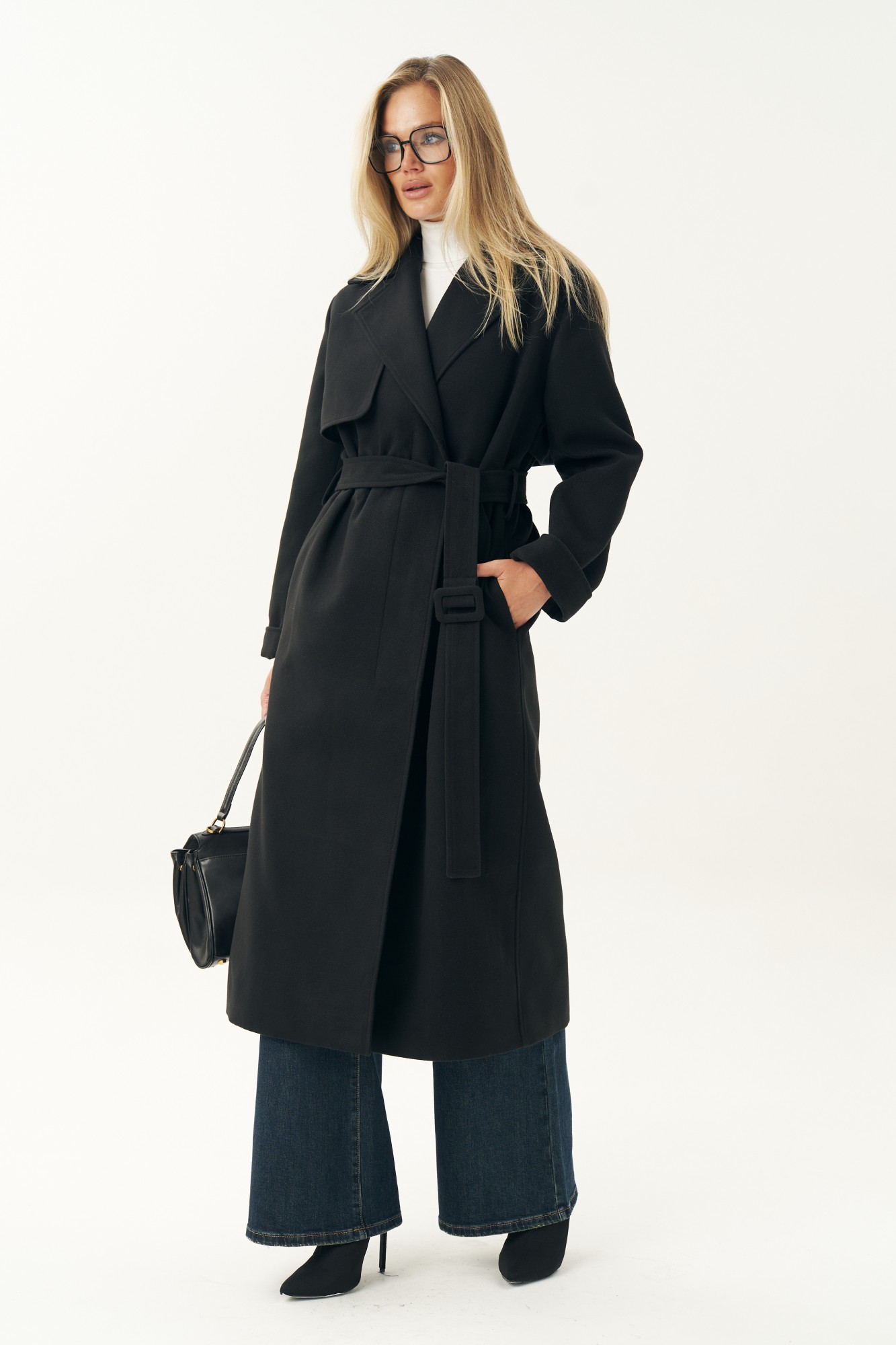Пальто женское выполнено в классическом черном цвете, что делает его универсальной основой любого гардероба. Оно легко сочетается с деловой одеждой, повседневными образами и даже с вечерними нарядами. Черное пальто всегда было и остается символом утонченности. Пальто женское, прямого силуэта, из пальтовой ткани, на подкладке, со смещенной относительно центра переда застежкой на 3 пуговицы, (размер и цвет фурнитуры может незначительно отличаться от фото), предназначено для повседневной носки. Пальто со съемным поясом с пряжкой. Правая часть переда с отлетной кокеткой. Спинка со средним швом, шпицей и с отлетной кокеткой. Боковые швы с карманами и с надстрочными шлевками по линии талии. Горловина оформлена широким воротником пиджачного типа. Правый борт переда с потайной суппатной застежкой на 3 петли. Рукава втачные, двухшовные, с широким припуском подгиба низа, позволяющим завернуть низ рукава наверх как отложную манжету.