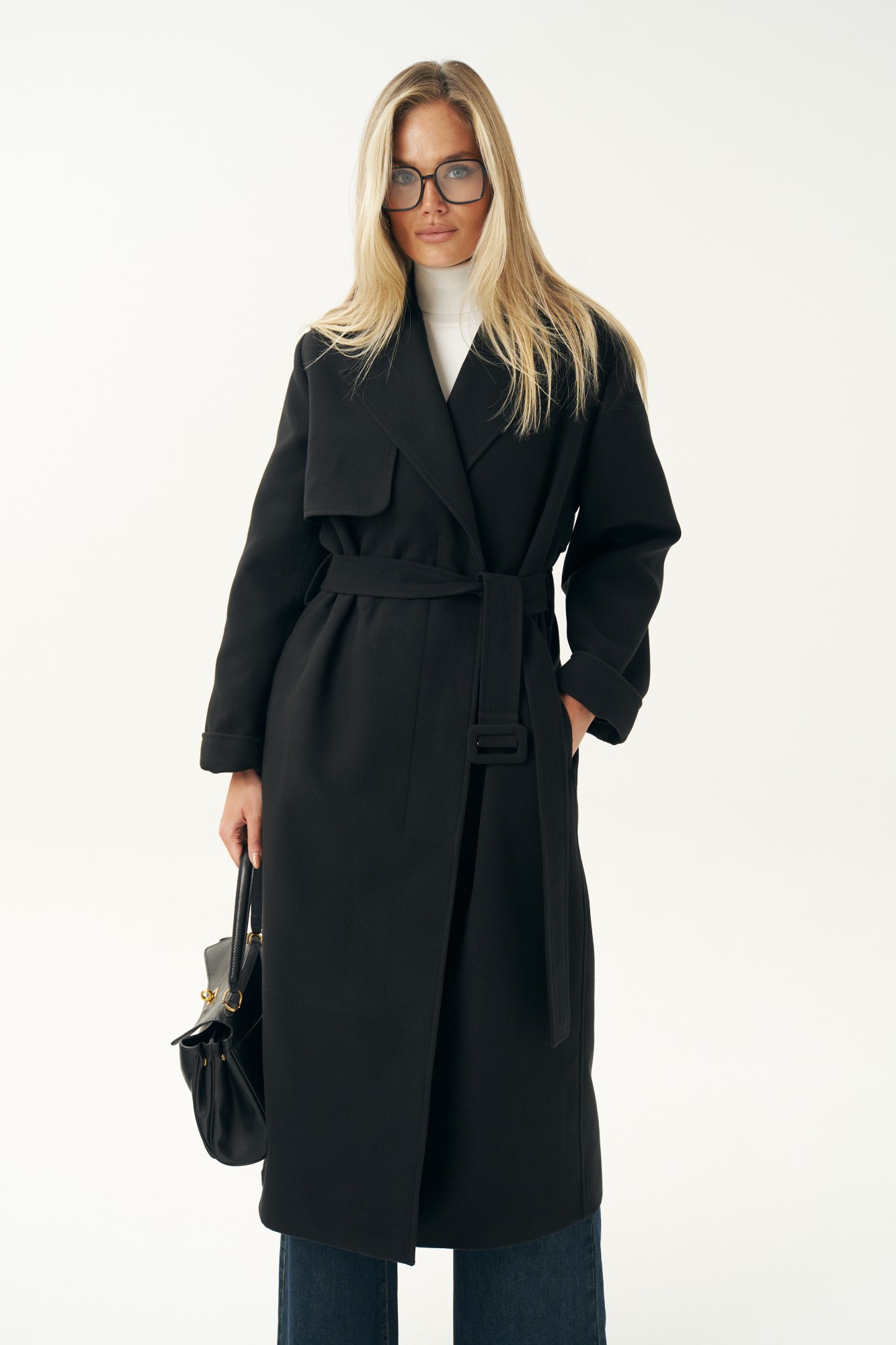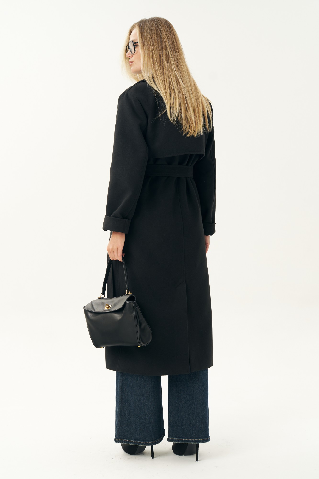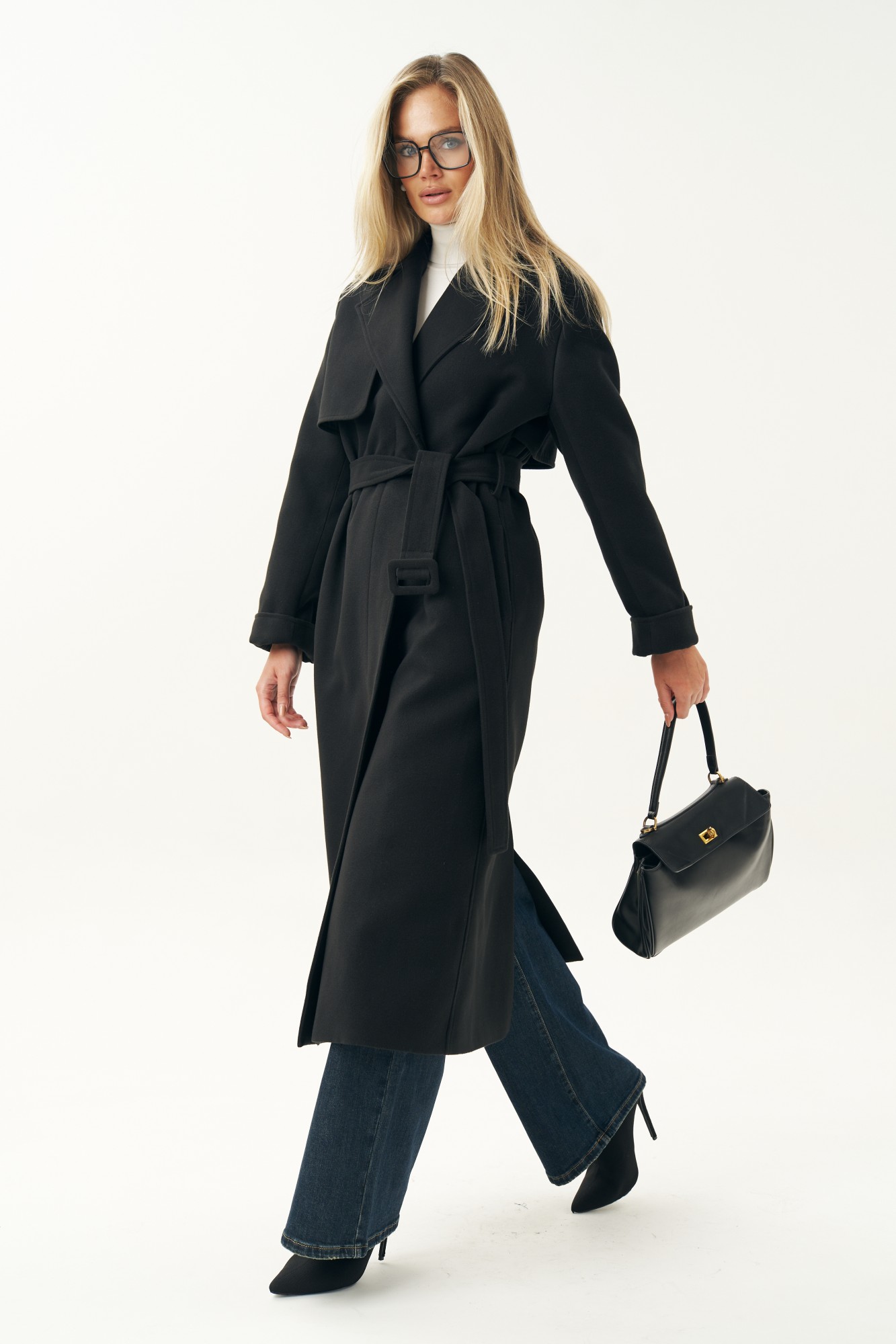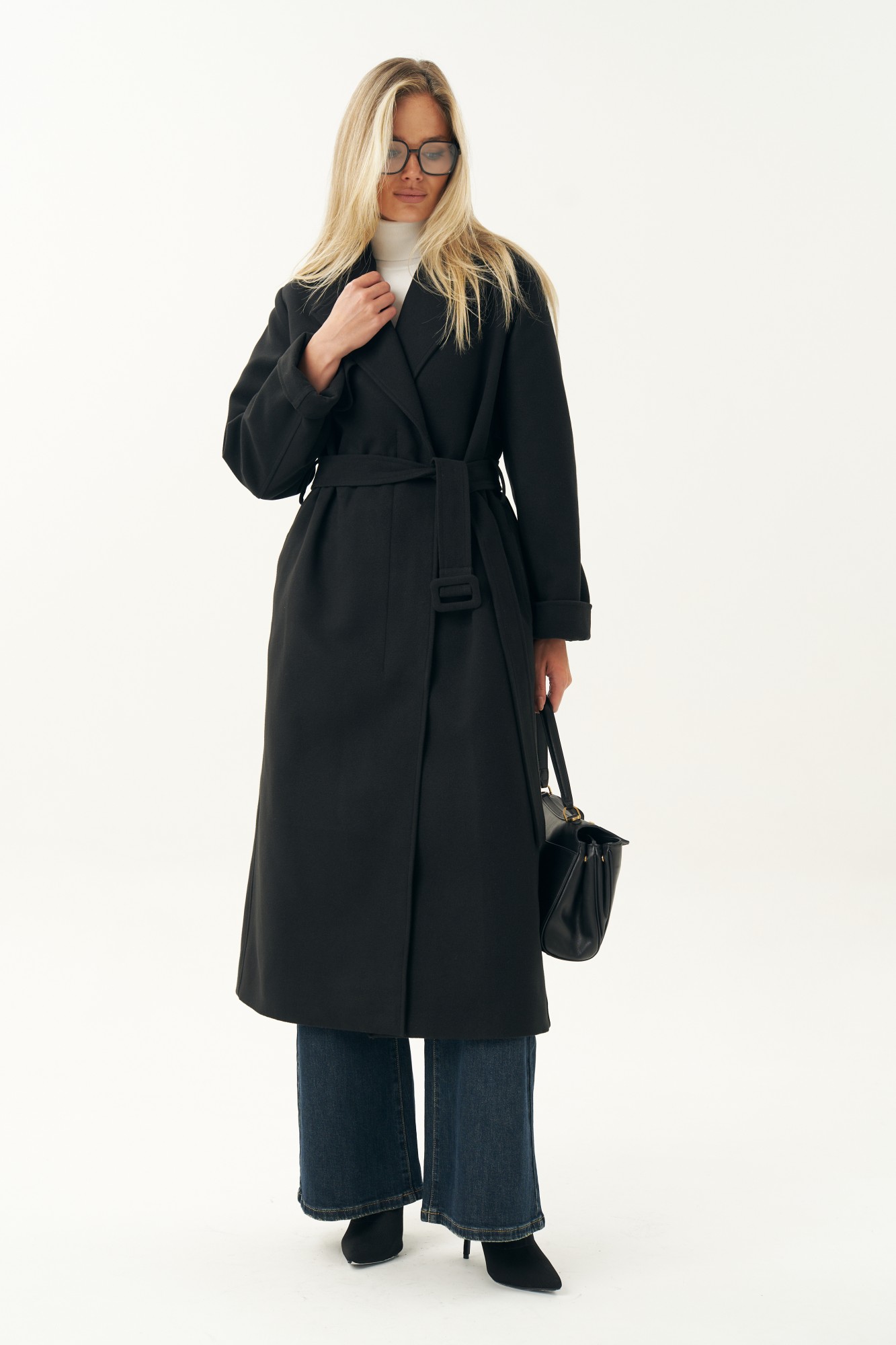 Пальто женское выполнено в классическом черном цвете, что делает его универсальной основой любого гардероба. Оно легко сочетается с деловой одеждой, повседневными образами и даже с вечерними нарядами. Черное пальто всегда было и остается символом утонченности. Пальто женское, прямого силуэта, из пальтовой ткани, на подкладке, со смещенной относительно центра переда застежкой на 3 пуговицы, (размер и цвет фурнитуры может незначительно отличаться от фото), предназначено для повседневной носки. Пальто со съемным поясом с пряжкой. Правая часть переда с отлетной кокеткой. Спинка со средним швом, шпицей и с отлетной кокеткой. Боковые швы с карманами и с надстрочными шлевками по линии талии. Горловина оформлена широким воротником пиджачного типа. Правый борт переда с потайной суппатной застежкой на 3 петли. Рукава втачные, двухшовные, с широким припуском подгиба низа, позволяющим завернуть низ рукава наверх как отложную манжету.