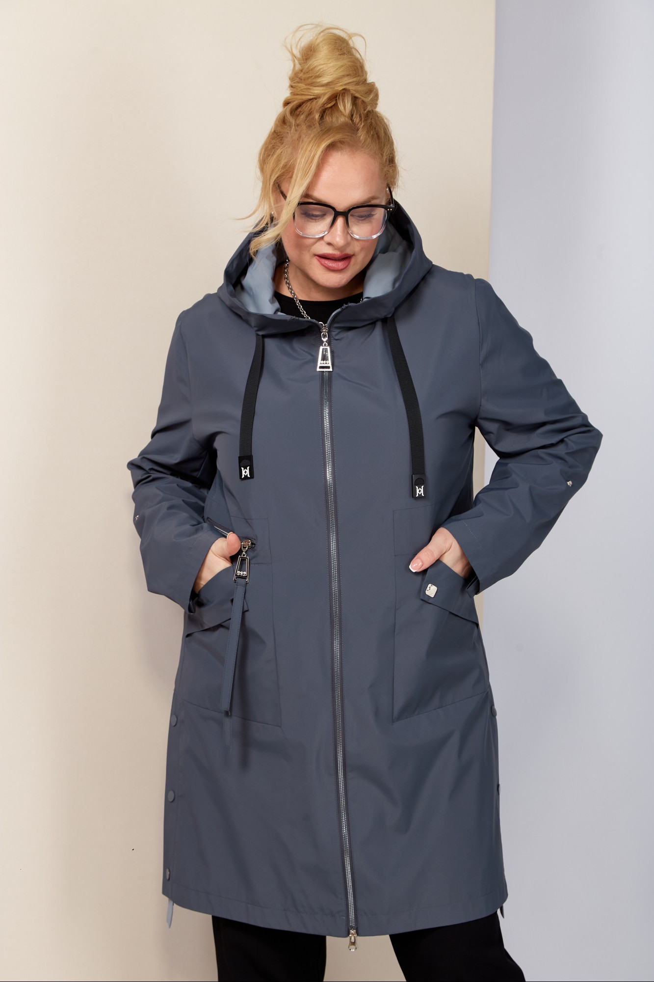 Легкий, элегантный весенний плащ. Это универсальная вещь, которая подходит для любого сезона и погоды. Изготовлен из плащевой мягкой ткани, без утеплителя, на подкладке. Капюшон изделия втачной, регулируется декоративной шнуром. Застежка центральная на молнии (двухбегунковая). По переду расположены глубокие накладные карманы на внутренних магнитах, с правой стороны верхний действующий карман прорезного типа на молнии. Рукав втачной длинный с патой на кпопку. Низ боковых швов с разрезами на кнопках. Спинка с рельефными швами.