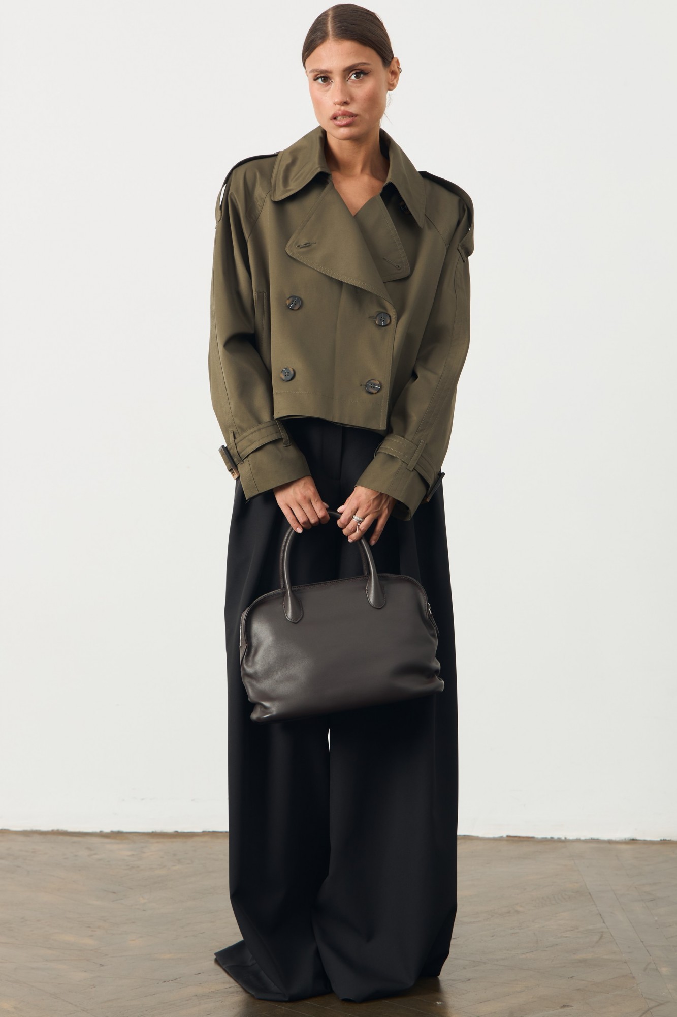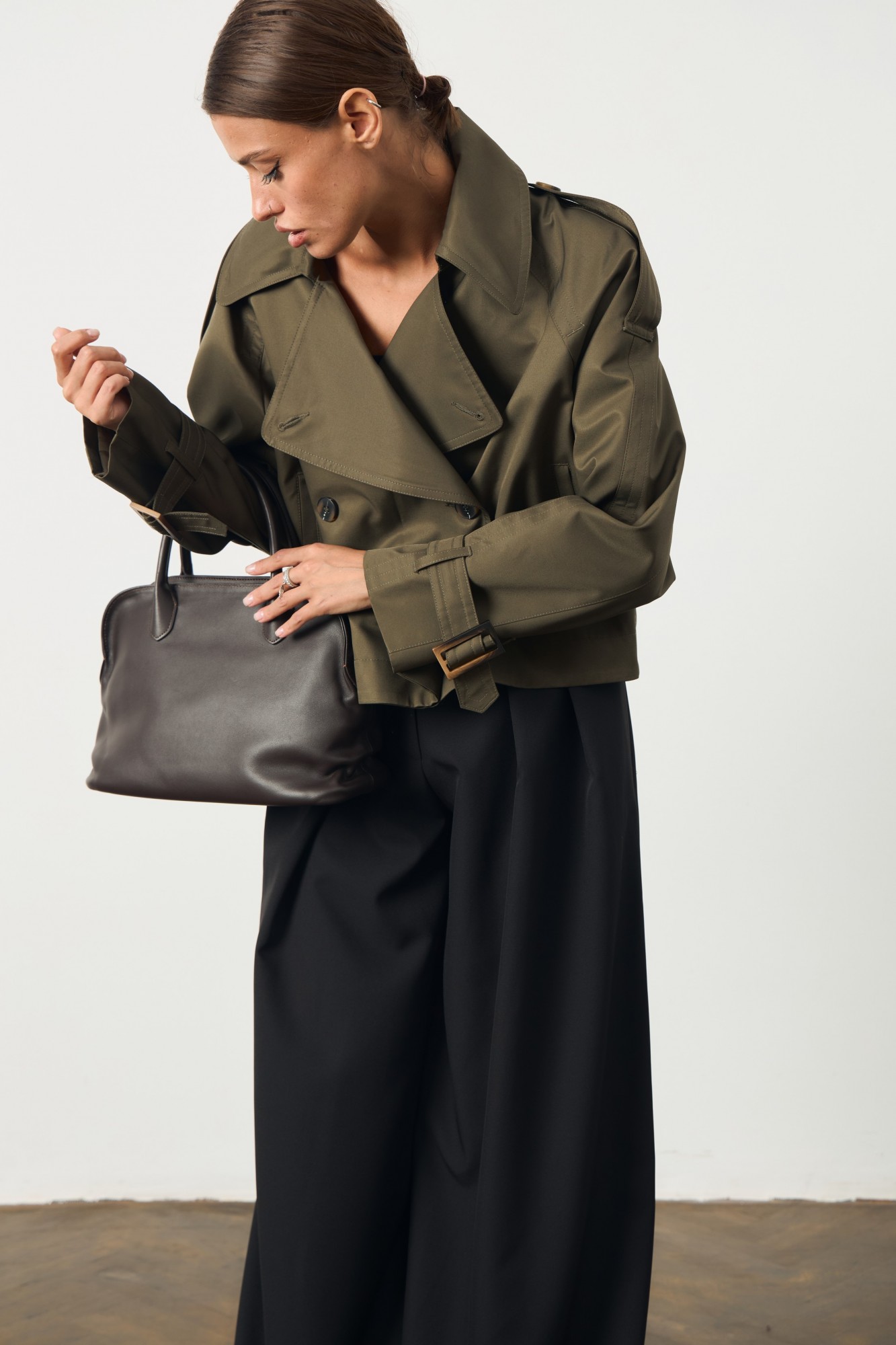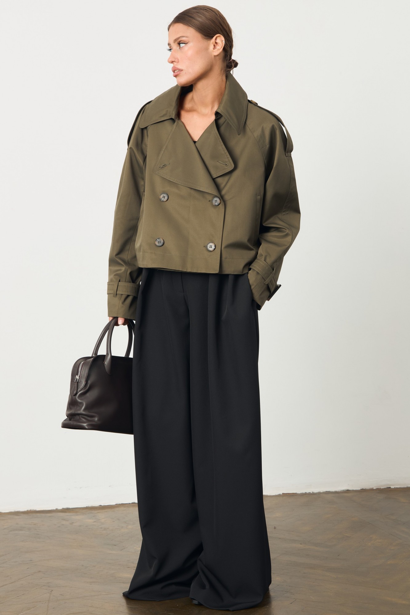 Укороченный тренч из плащевой ткани. По переду застежка на пуговицы. Спущенная линия плеча, по низу рукава манжета с патой.