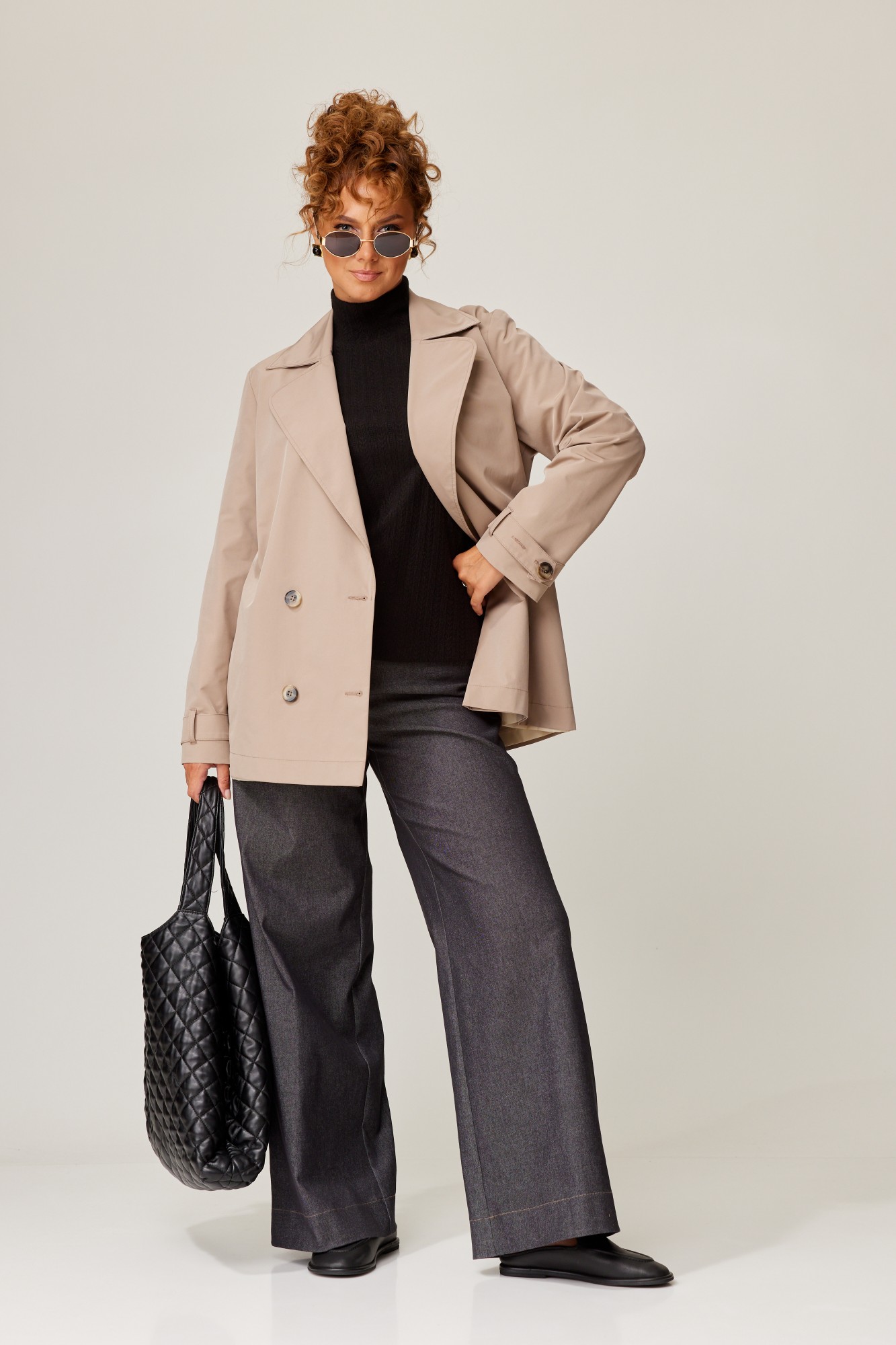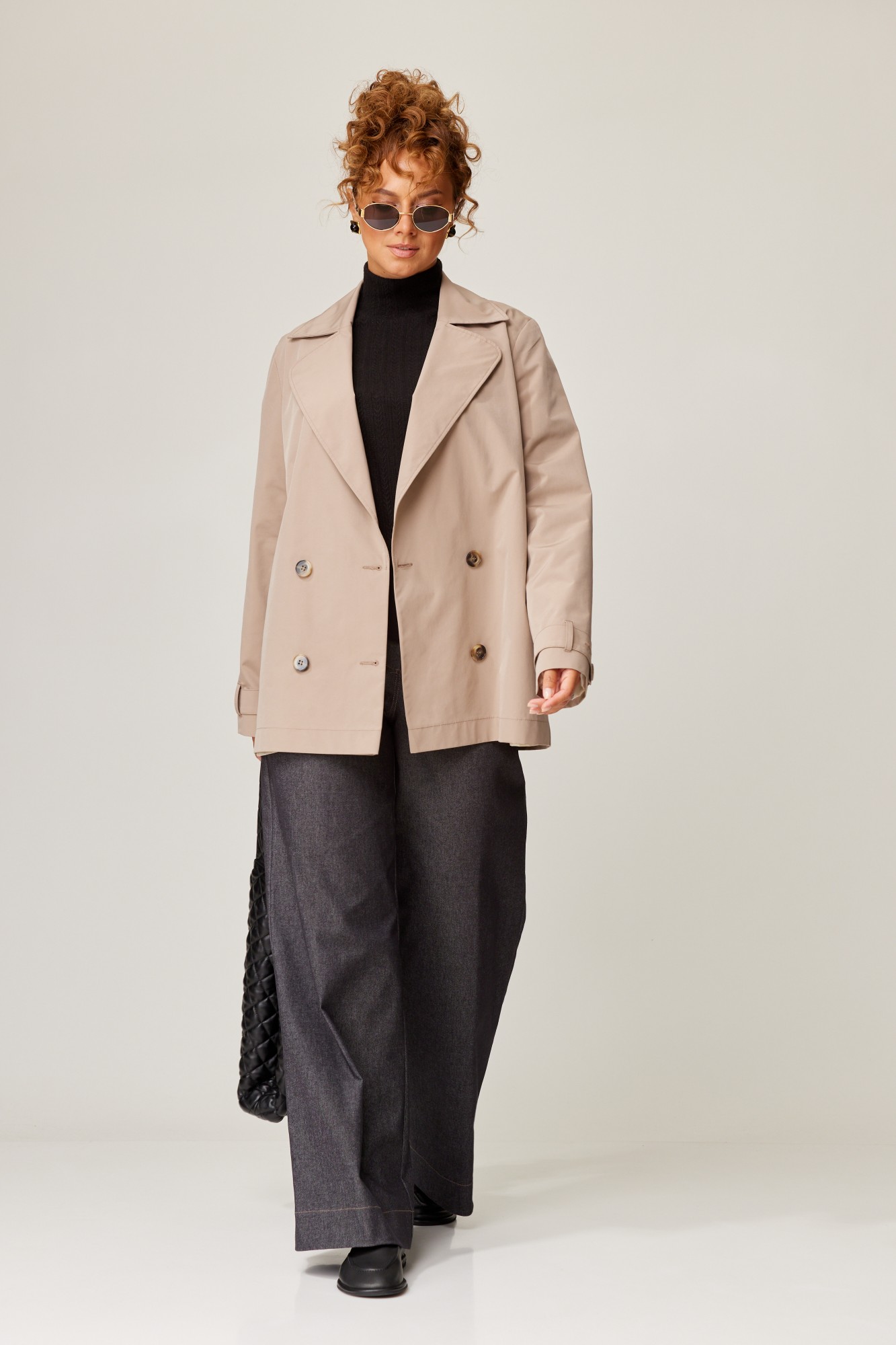 Тренч свободного прямого силуэта из плащевой ткани. Перед с нагрудной вытачкой заведённой под лацкан. Спинка со средним швом. Застежка двубортная на 4 пуговицы. В боковых швах карманы. Рукав одношовный втачной. По низу рукава паты с застежкой на петлю и пуговицу. Паты протянуты в шлевки. Воротник пиджачного типа. К тренчу прилагается пояс из основной ткани. В боковых швах для него шлевки. Тренч на подкладке.