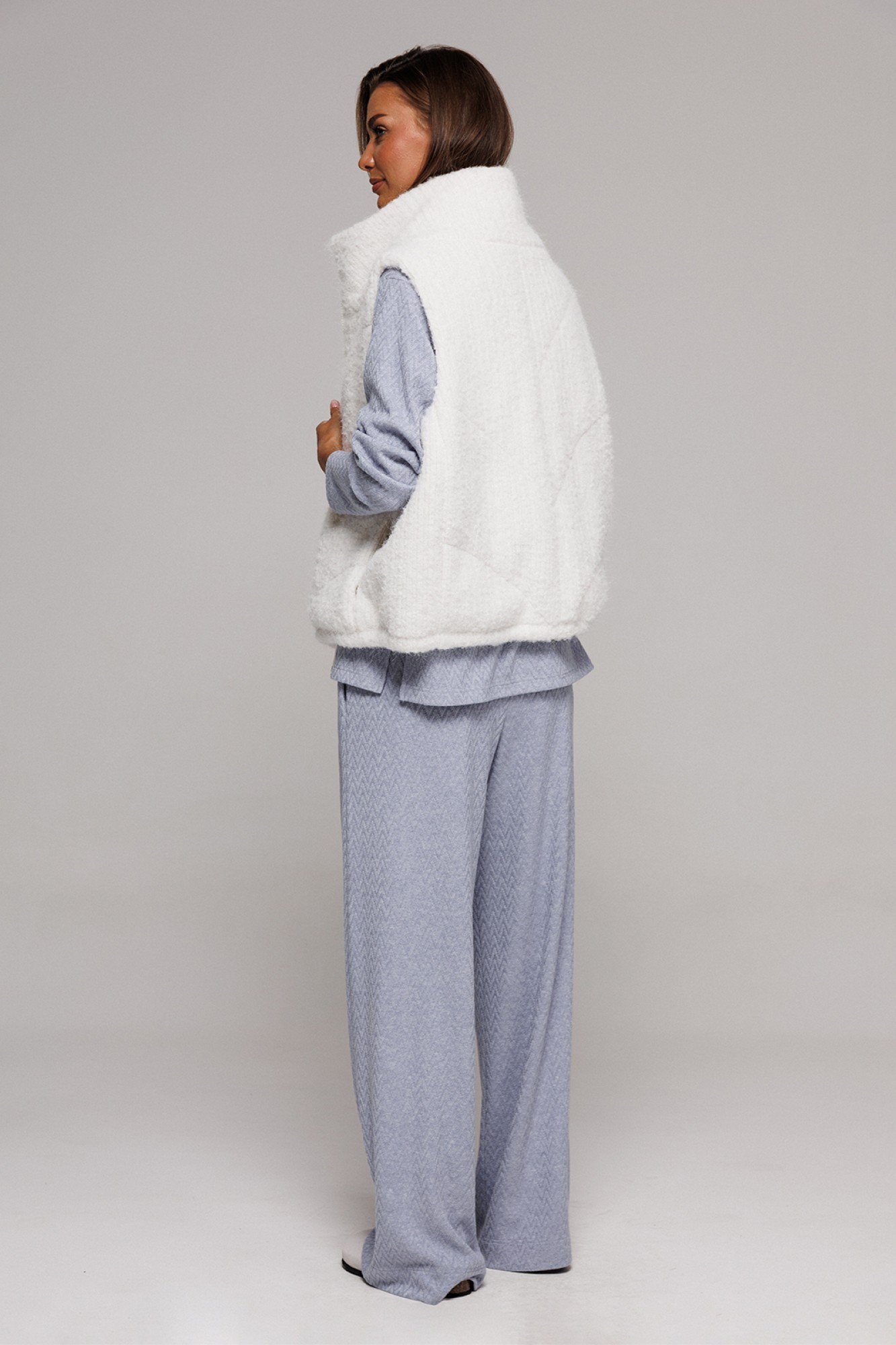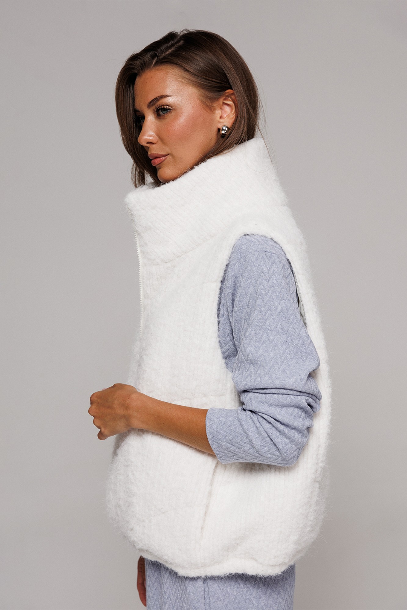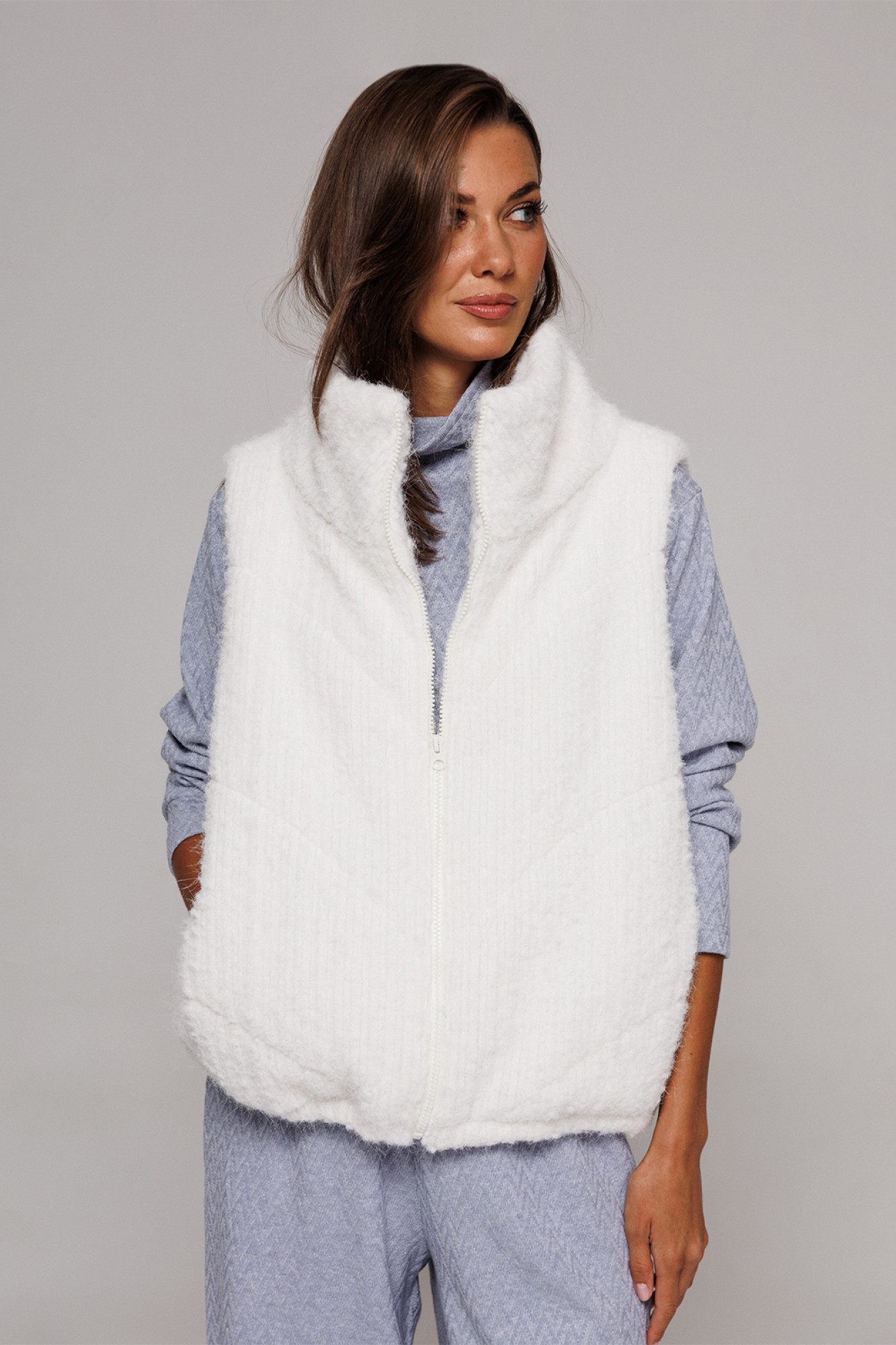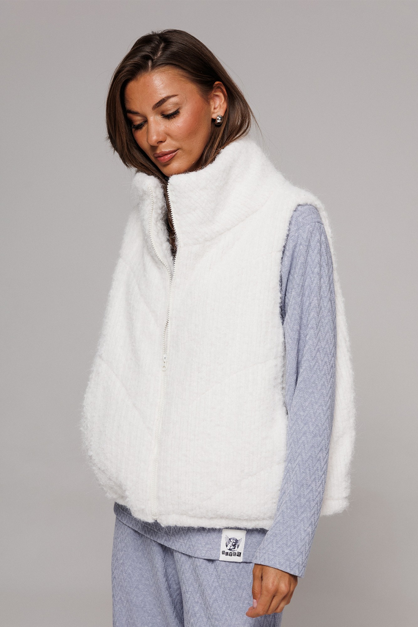 Жилет короткий свободного силуэта, слегка заужен к низу. Полочка с центральной застежкой на тесьму-молнию, с отрезным бочком и карманом в шве притачивания бочка. По низу жилета вставлена эластичная тесьма с фиксатором на спинке. Воротник - стойка. Жилет из трикотажного полотна с фигурной стежкой на синтепоне (isosoft 150г/м²) и подкладке.
