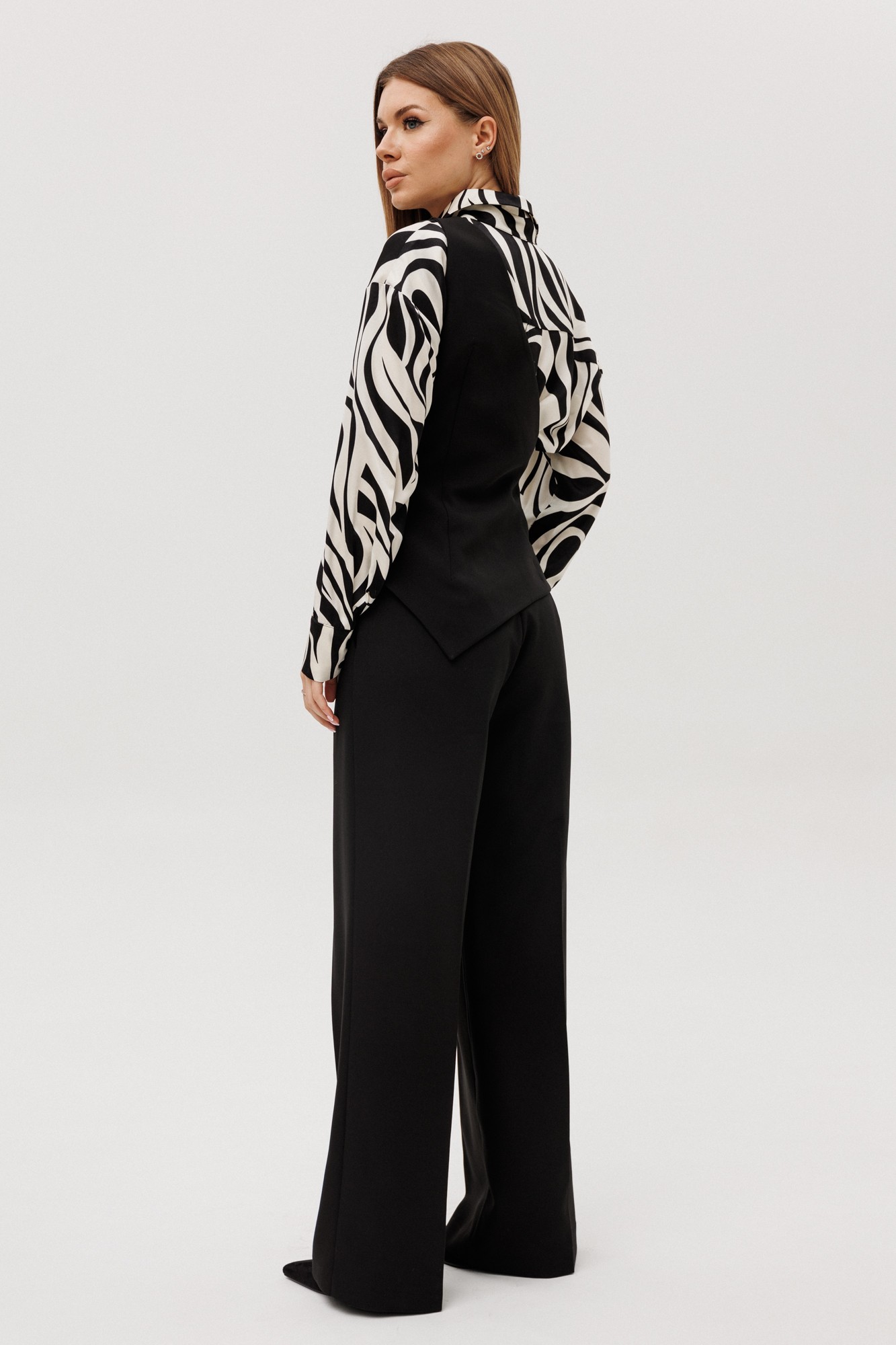 Женский жилет с уникальным асимметричным дизайном, объединяющим классическую элегантность и современные детали. Основная часть выполнена в насыщенном черном цвете, что придает изделию универсальность. В качестве контраста используется ткань с мелким геометрическим принтом в черно-белом цвете, добавляющая жилету изысканности. Декоративный клапан на передней части подчеркивает изысканный вкус, а фигурный низ добавляет игривости и женственности. Застежка на разъемную молнию, расположенная в боковом шве, обеспечивает удобство при надевании и снимании, делая модель практичной в повседневной носке.