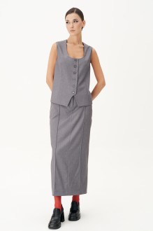 Жилет женский полуприлегающего силуэта с центральной застежкой на петли и пуговицы. Перед с отрезными бочками и прорезными карманами с листочкой, спинка с отрезными бочками, средним швом и хлястиком. Горловина V-образной формы, низ фигурный.