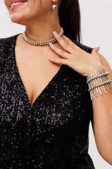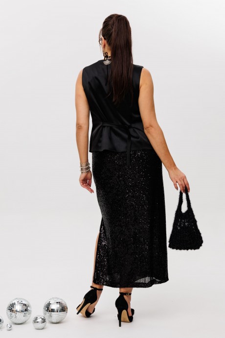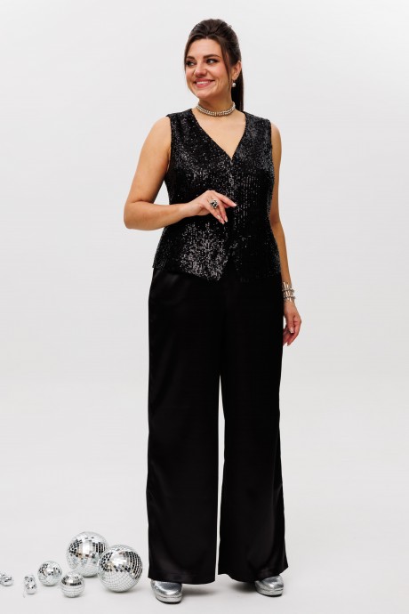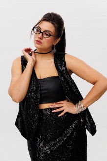 Спереди жилет украшен блестящими пайетками, которые придают образу эффектное сияние, а атласная спинка добавляет мягкость и утончённость. V-образный вырез и аккуратный хлястик на спинке делают модель особенно стильной, подчеркивая её продуманный крой. Застежка на замок завершает образ, сохраняя лаконичность и удобство.