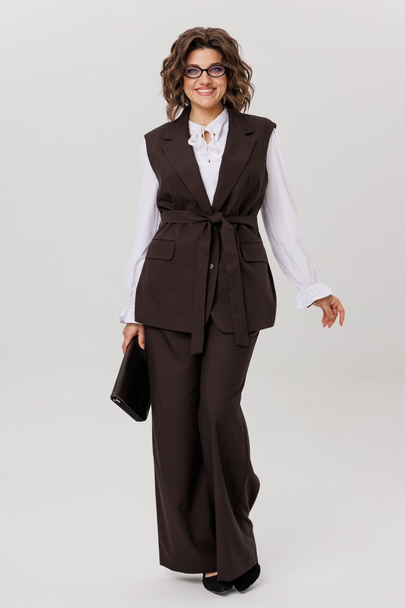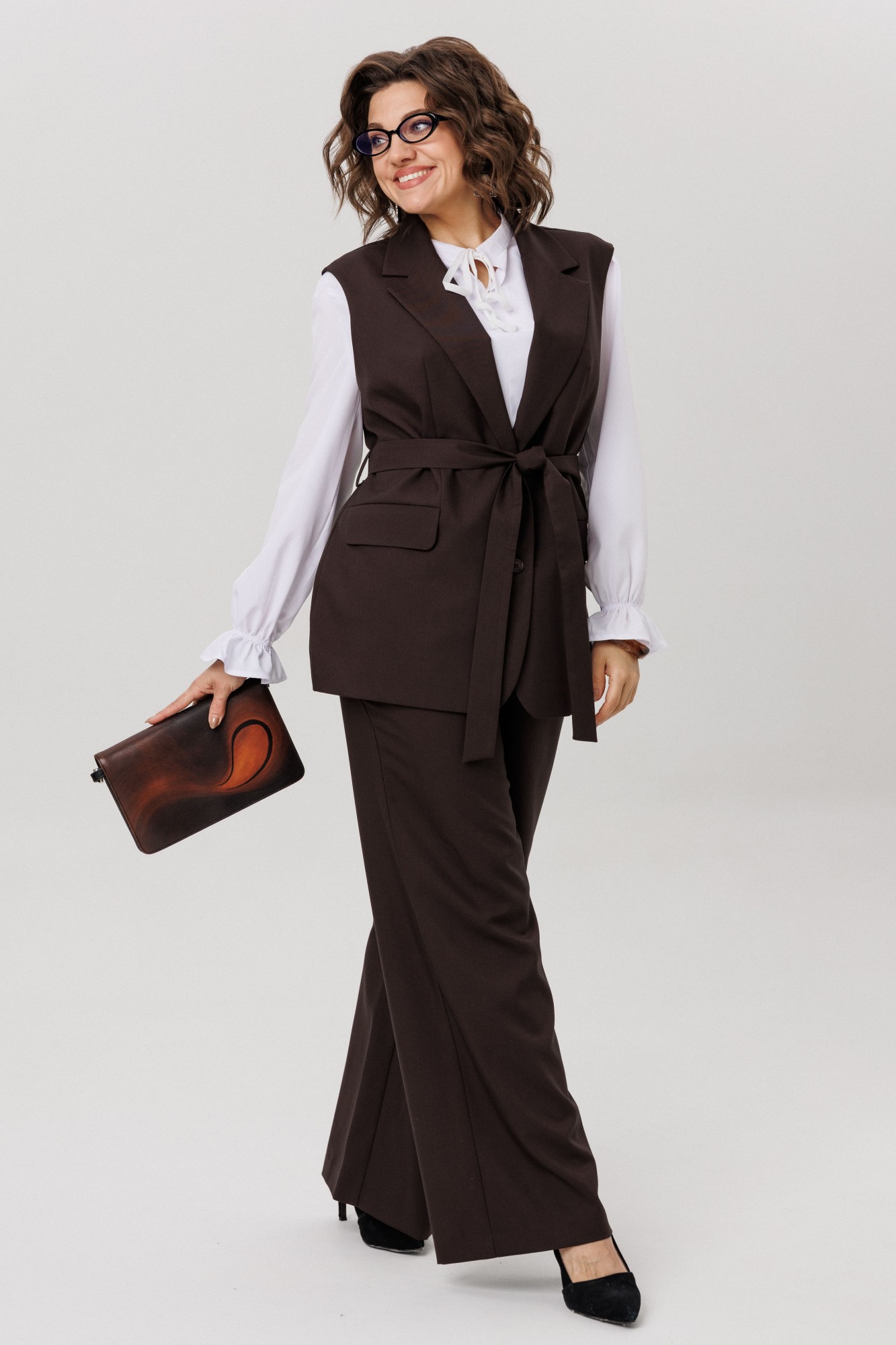 Изысканный жилет от Анелли на каждый день. Этот полуприлегающий жилет с утончённой однобортной застёжкой на петли и пуговицы станет великолепным дополнением вашего гардероба. Прорезные карманы с аккуратным клапаном и изящный воротник с отложными лацканами придают ему утончённый и стильный вид. Входящий в комплект пояс эффектно подчеркивает талию, создавая идеальный силуэт и добавляя нотку женственности. Жилет прекрасно сочетается как с классическими брюками, так и с романтичными юбками, а также выглядит потрясающе на платьях. Он станет ярким акцентом в вашем образе, подчеркивая ваш безупречный вкус и уникальную индивидуальность. С этим шикарным жилетом у вас есть бесконечные возможности для стилизации — дайте волю своей фантазии и создавайте уникальные образы, которые будут восхищать окружающих каждый день! На модели брюки 1702 и блуза 1281. Также, можно купить жилет и брюки в костюме 1501.