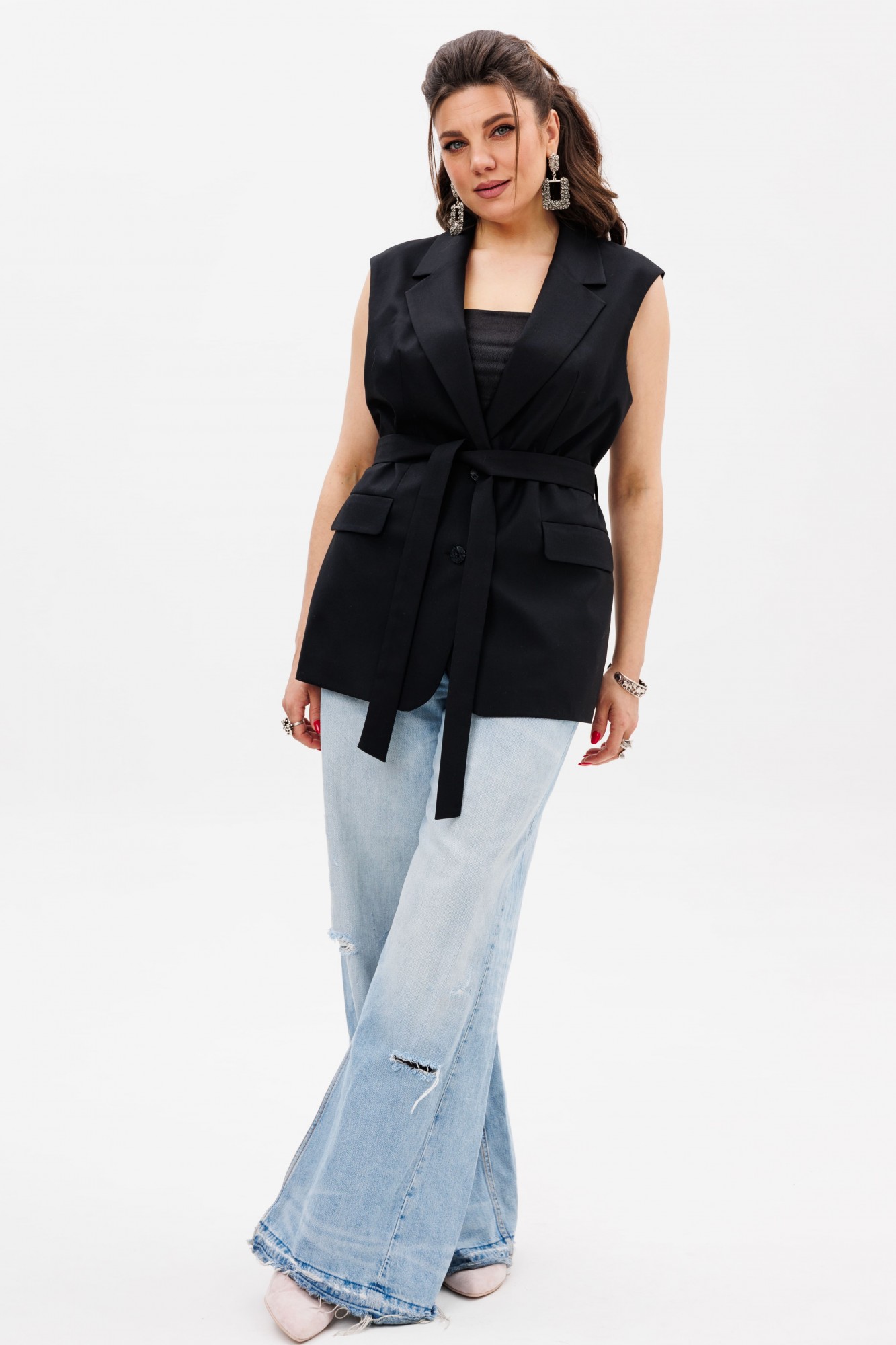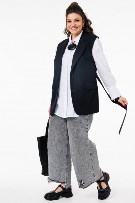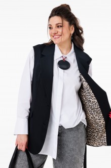 Изысканный жилет от Анелли из трикотажа. Этот полуприлегающий жилет с утончённой однобортной застёжкой на петли и пуговицы станет великолепным дополнением вашего гардероба. Прорезные карманы с аккуратным клапаном и изящный воротник с отложными лацканами придают ему утончённый и стильный вид. Входящий в комплект пояс эффектно подчеркивает талию, создавая идеальный силуэт и добавляя нотку женственности. Жилет прекрасно сочетается как с классическими брюками, так и с романтичными юбками, а также выглядит потрясающе на платьях. Он станет ярким акцентом в вашем образе, подчеркивая ваш безупречный вкус и уникальную индивидуальность. С этим шикарным жилетом у вас есть бесконечные возможности для стилизации — дайте волю своей фантазии и создавайте уникальные образы, которые будут восхищать окружающих каждый день! На модели в жилете цвета «ночи» брюки 1416.1 и белая рубашка 1203.1.