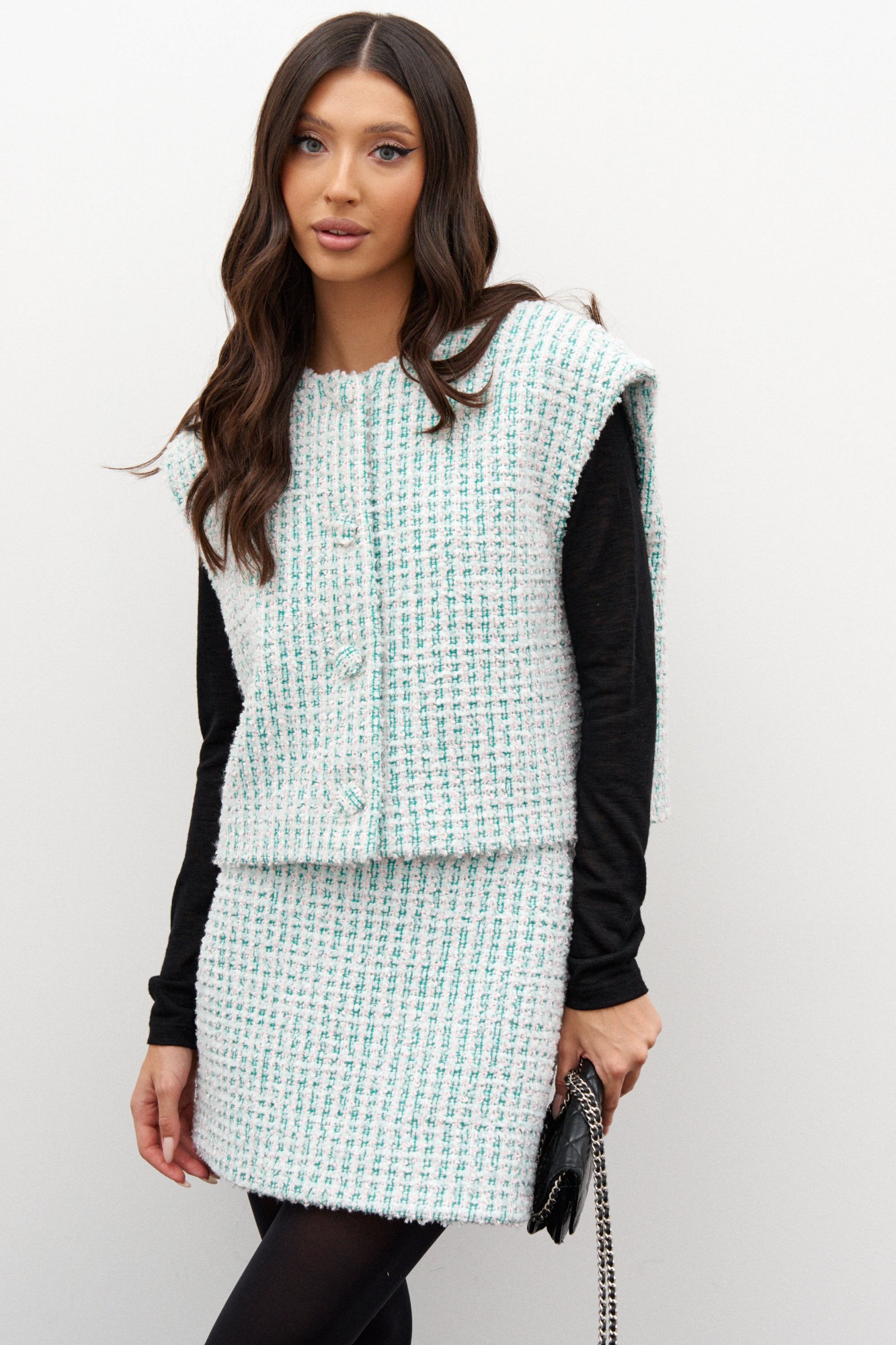 Жилет прямого кроя выполнен из плотна букле в бело-зеленую расцветку. Характеристики: прямой крой, горловина круглая, подкладка, застежка центральная на петли пуговицы, пуговицы выполнены из основной ткани.