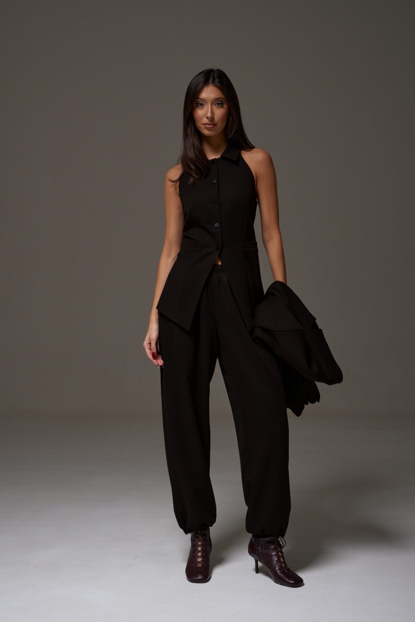 Жилет с открытыми плечами прилегающего силуэта выполнен из костюмной ткани. Характеристики: прилегающий силуэт, подкладка, застежка центральная на петли пуговички, отложной воротник, по переду изделия карманы.