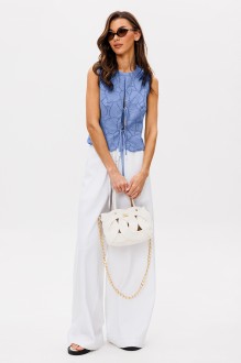 Жилет из ажурного шитья полуприлегающего силуэта без рукавов. Полочка с центральной застежкой на завязки и крючок, с 2-мя вертикальными вытачками от низа для лучшего прилегания изделия. Спинка с вертикальной вытачкой от низа и центральным швом. Жилет на подкладке из хлопка.