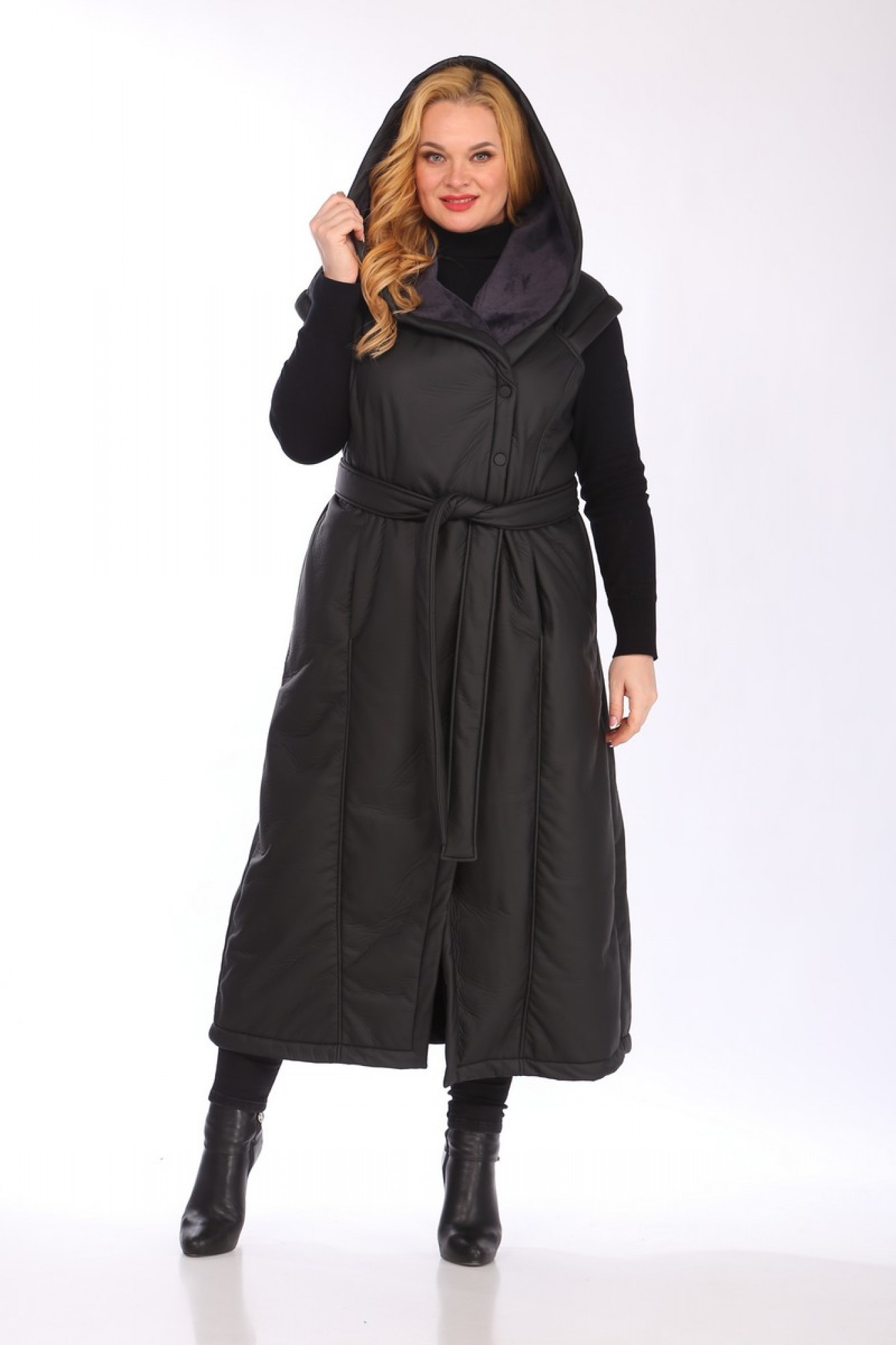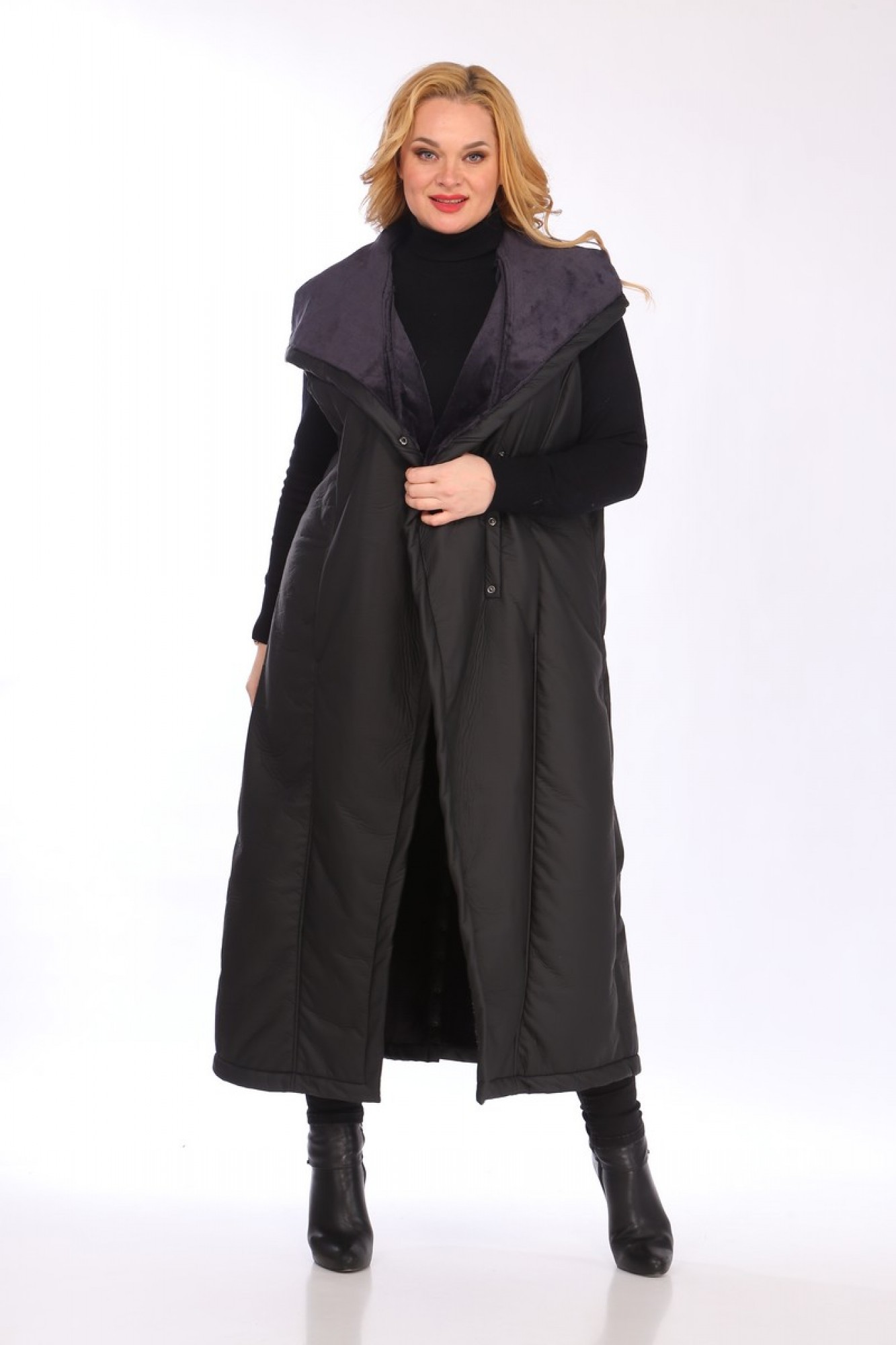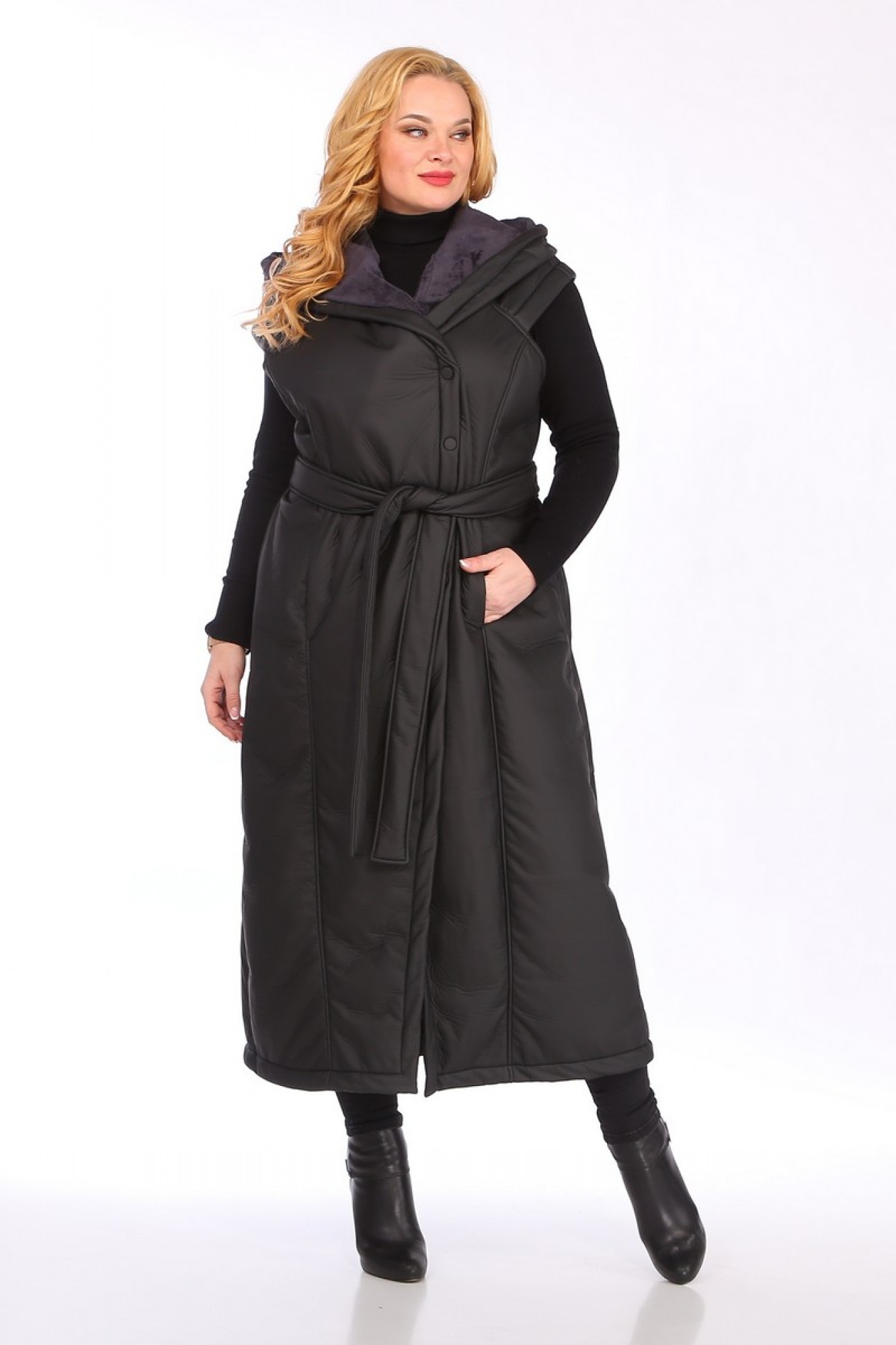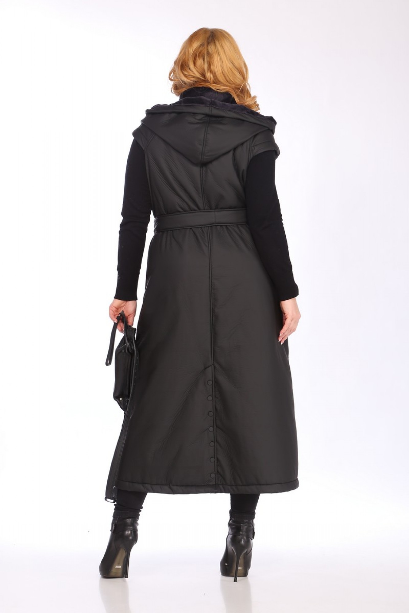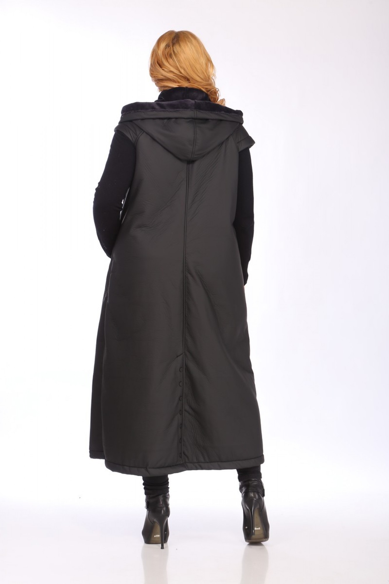 Жилет женский из плащевой ткани с меховой изнанкой. Полочка с рельефами, в которых расположены внутренние функциональные карманы. Застежка центральная на косую на 4 кнопки. Капюшон втачной. Спинка с центральным швом. В центральном шве по спинке и на рукавах функциональные шлицы на кнопках. В комплекте пояс из основной ткани. Выполнен из мягкой непромокаемой ткани. Все кнопки на изделии металлические. Жилет без утеплителя и подкладки, изнанка - экомех. По температурному режиму подходит для весны, осени и еврозимы (до небольшого минуса). Примечание: Перед первой примеркой рекомендуется пройти изнанку (мех) изделия липким роликом для чистки одежды.