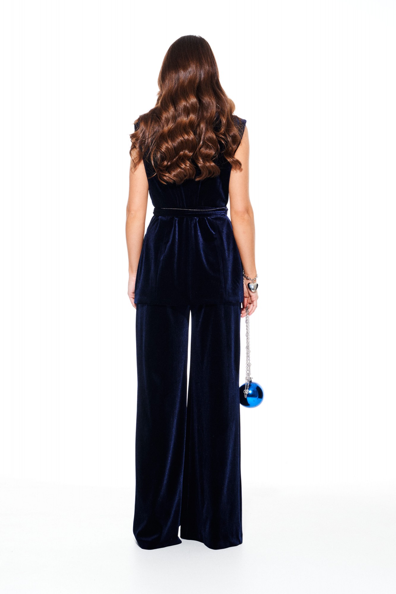 Жилет из бархата на трикотажной основе, прямого силуэта, однобортный, с отложным воротником, на подкладке. Детали переда с рельефами и прорезными карманами с клапаном и двумя обтачками. Спинка со средним швом и рельефами. Воротник, клапаны, подборта и пояс – оформлены декоративной тесьмой.