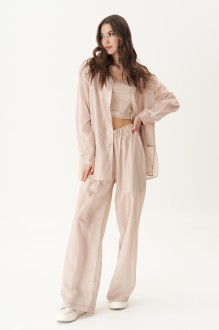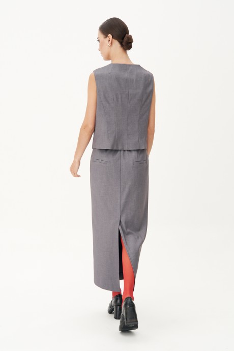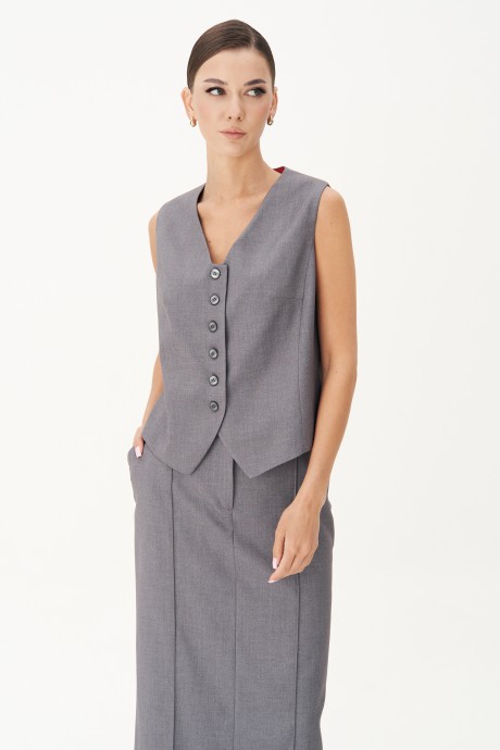 Жилет классический, полуприлегающего силуэта с центральной застёжкой, фигурным бортом и V-образным вырезом. Полочка с отрезным бочком и нагрудной вытачкой. Спинка с центральным швом, отрезным бочком, талиевой и плечевой вытачкой.