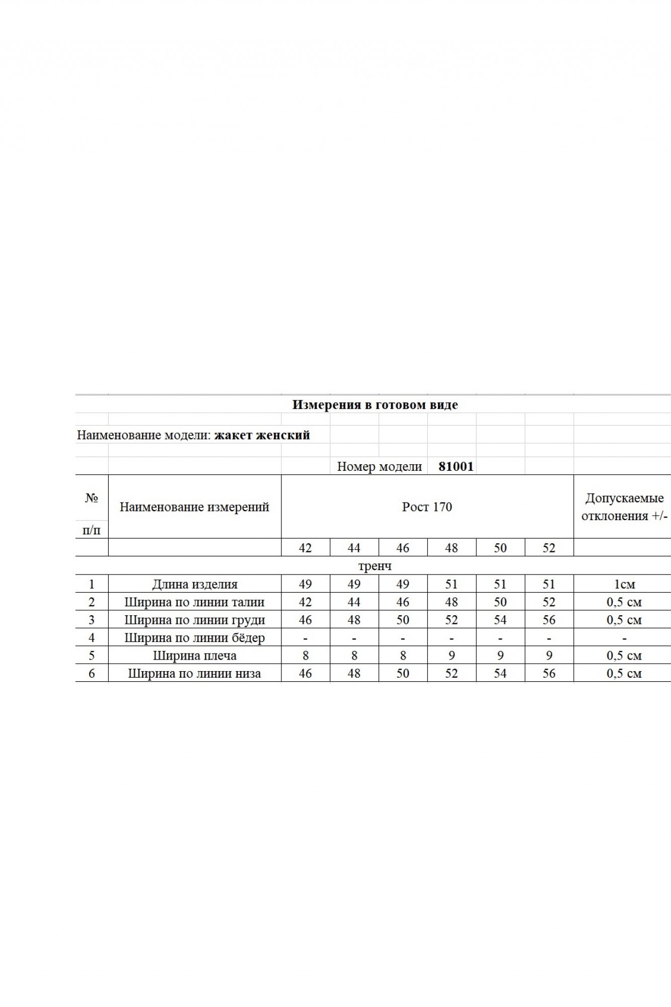 Таблица размеров