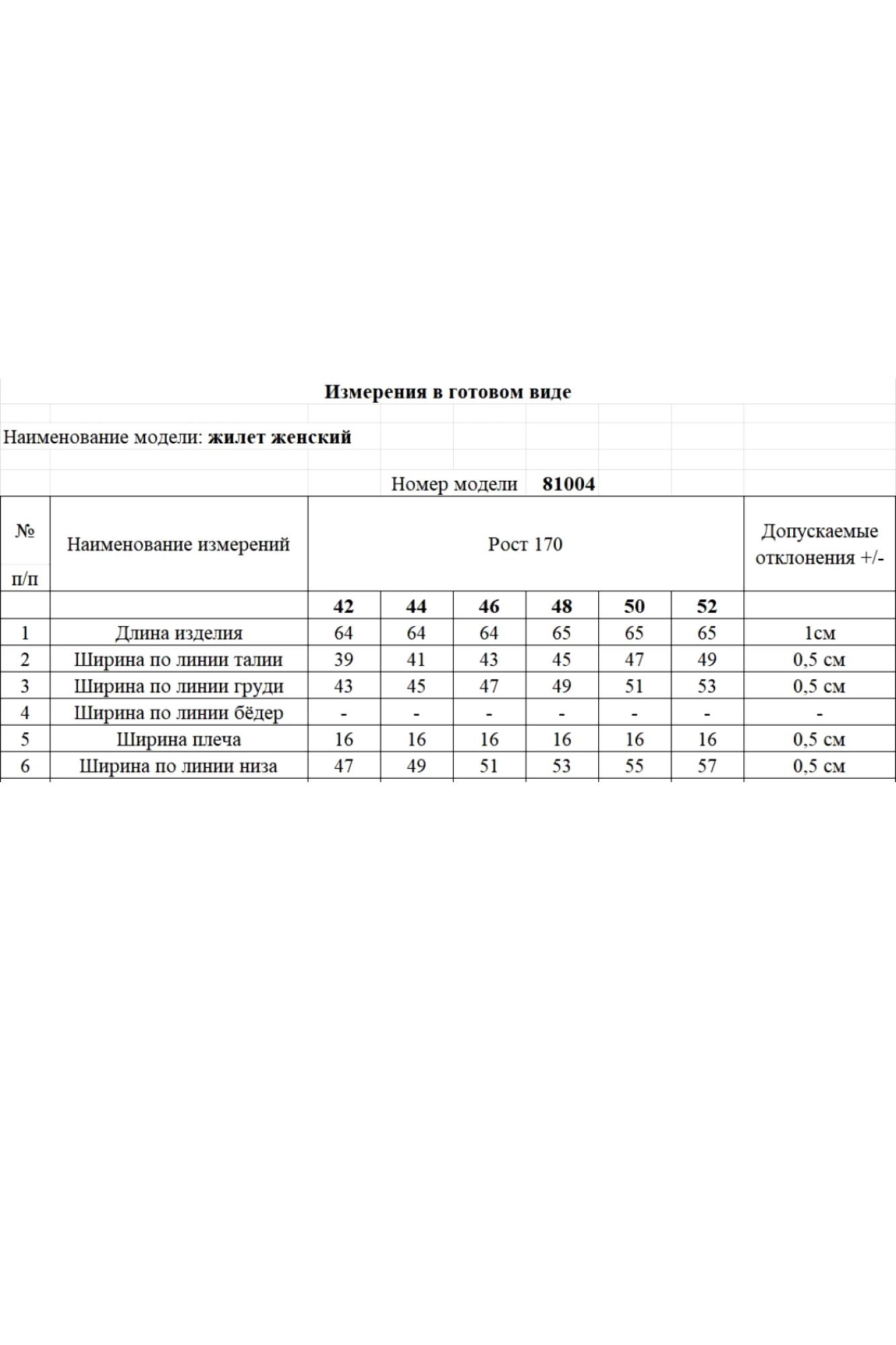 Таблица размеров