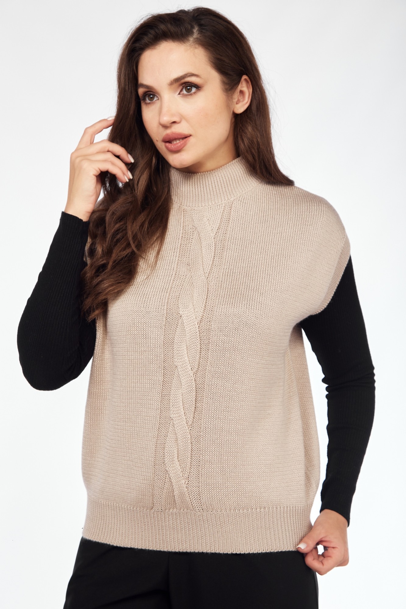 Вязанный жилет имеет укороченный силуэт, углубленные проймы, свободный крой, не сковывающий движения. Большой плюс жилета в том, что он легко надевается и снимается. Плотная вязка и вывязанные косы делают жилет максимально модным и стильным. Низ жилета и проймы декорированы манжетом крупной вязки. Горловина оформлена стойкой. Представленная модель в составе имеет шерсть, отлично держит форму, не растягивается. Для того, чтобы наш жилет радовал Вас как можно дольше, важно обратить внимание на уход: стирать при температуре не выше 30 градусов в щадящем режиме, сушить в горизонтальном положении, утюжить в режиме отпаривания, появившийся пилинг удалять с помощью спец. машинки.