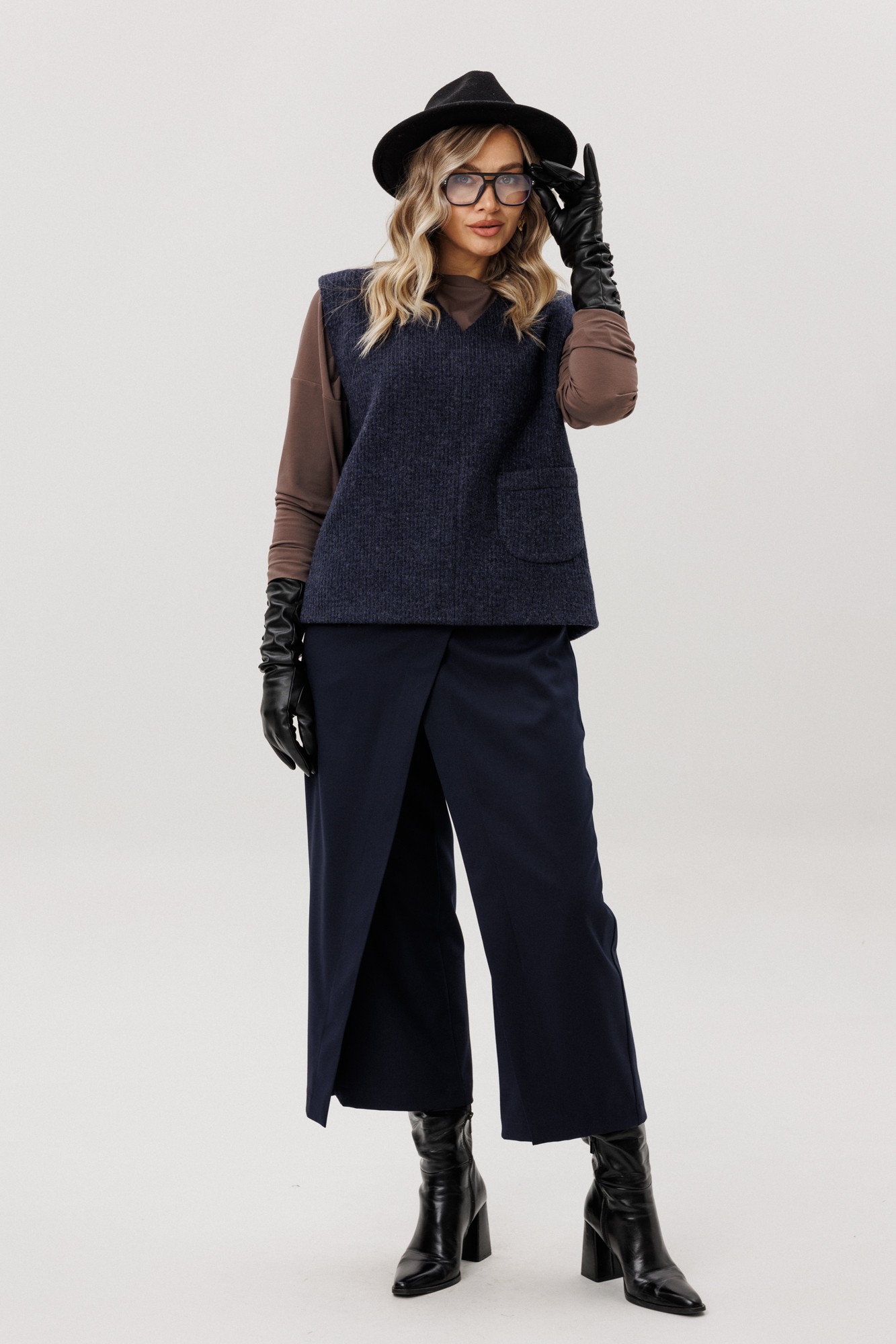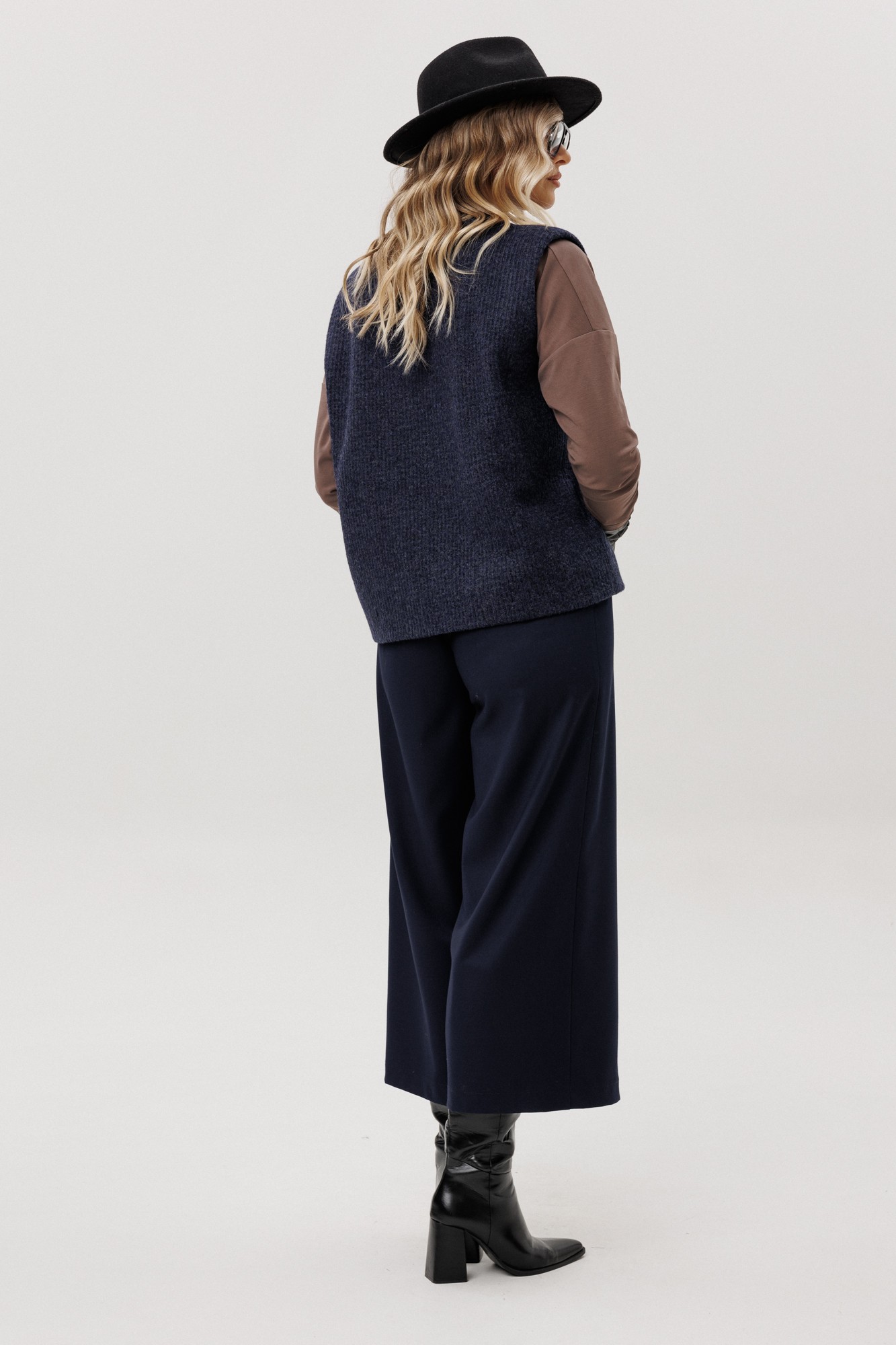 Жилет из полушерстяного вязанного полотна на трикотажной подкладке без застежки.