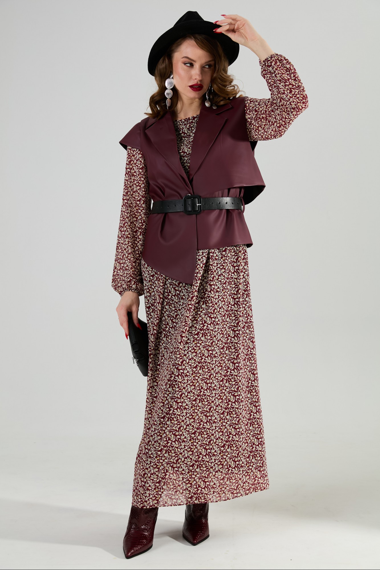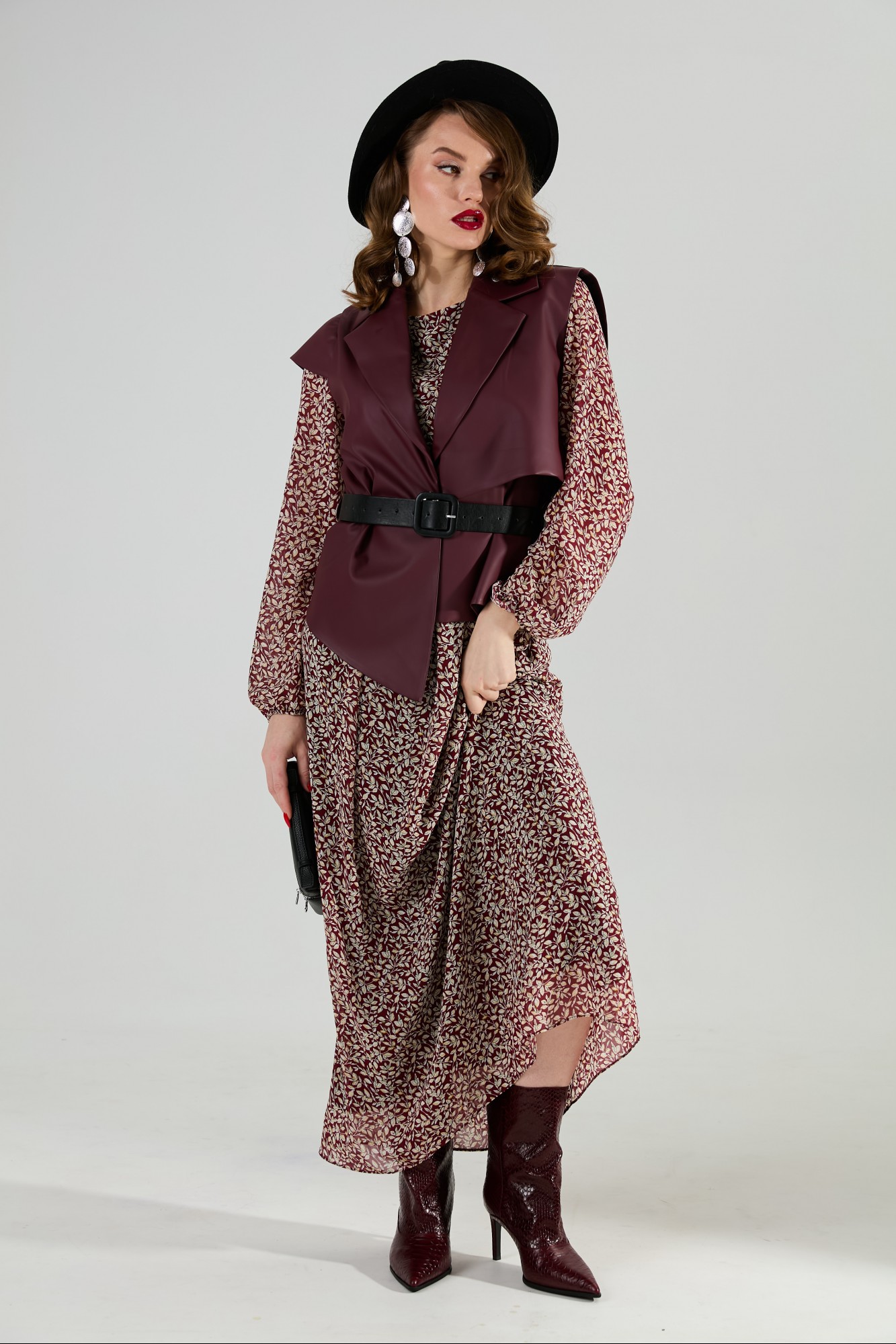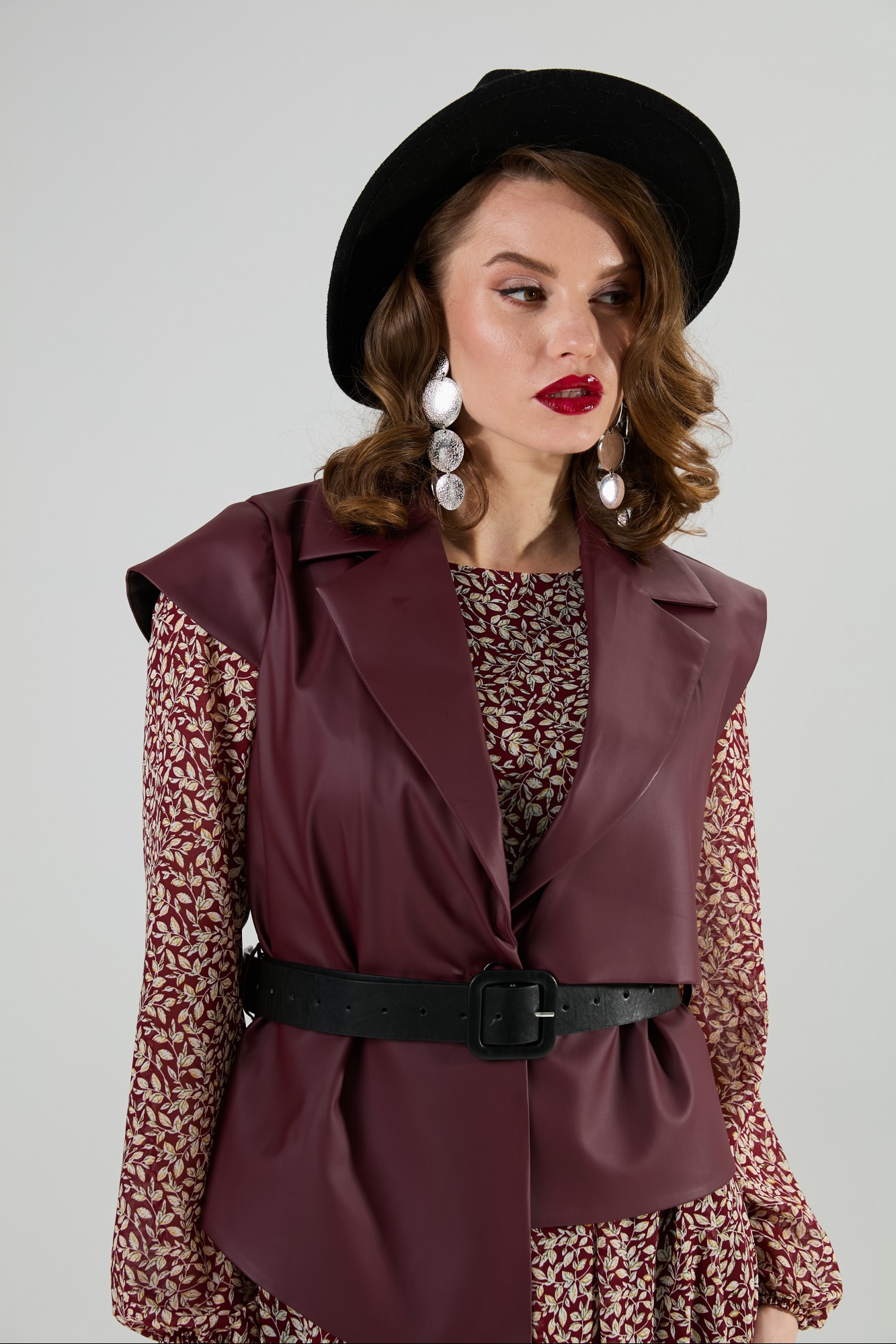 Жилет из экокожи прямого силуэта с воротником пиджачного типа. По правой пройме переда расположена фигурная деталь "крылышко". Спинка со средним швом. По низу правого переда и низу правой спинки фигурная деталь. По левой части переда и левой части спинки отлетная кокетка. Изделие идёт в комплекте с ремнем из экокожи.
