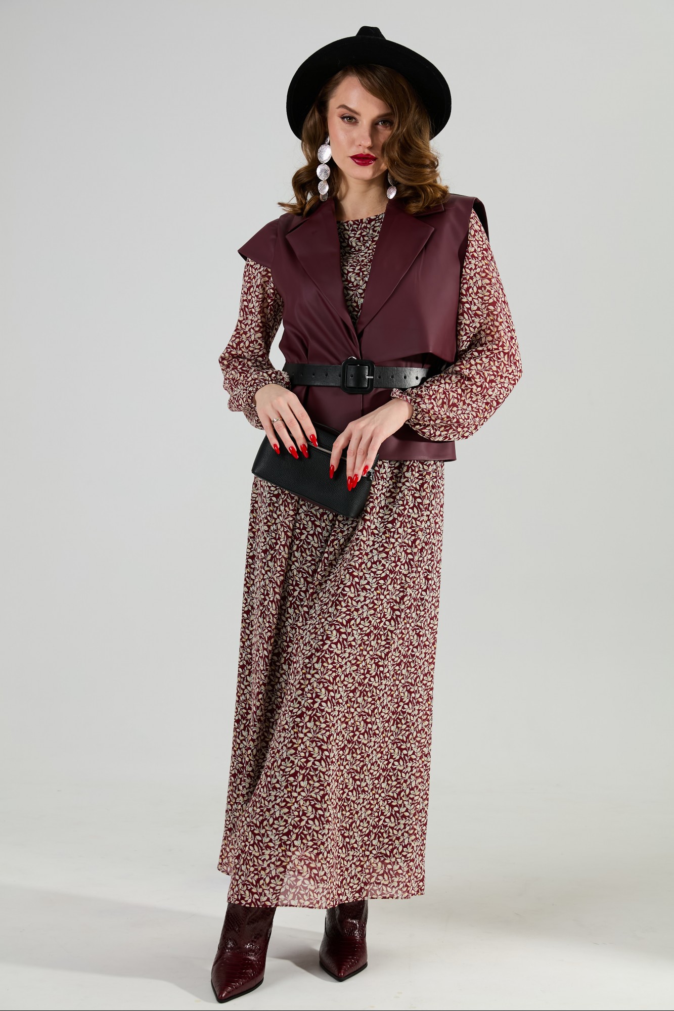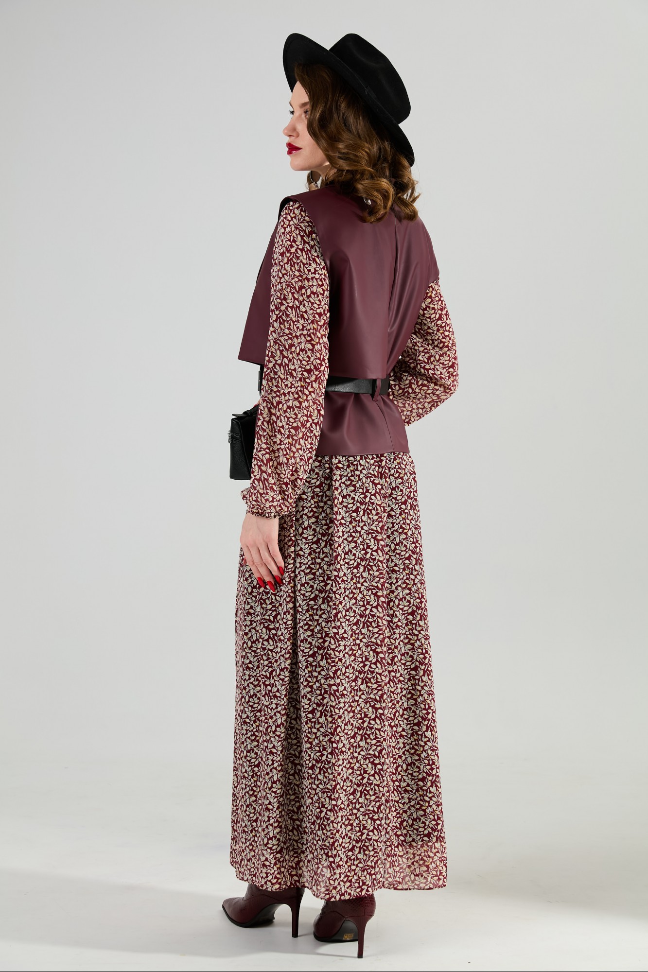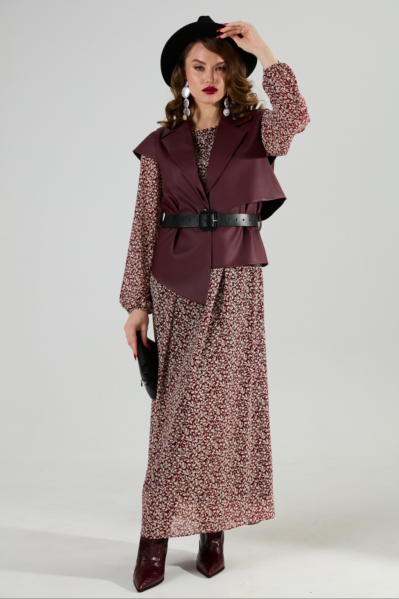 Жилет из экокожи прямого силуэта с воротником пиджачного типа. По правой пройме переда расположена фигурная деталь "крылышко". Спинка со средним швом. По низу правого переда и низу правой спинки фигурная деталь. По левой части переда и левой части спинки отлетная кокетка. Изделие идёт в комплекте с ремнем из экокожи.