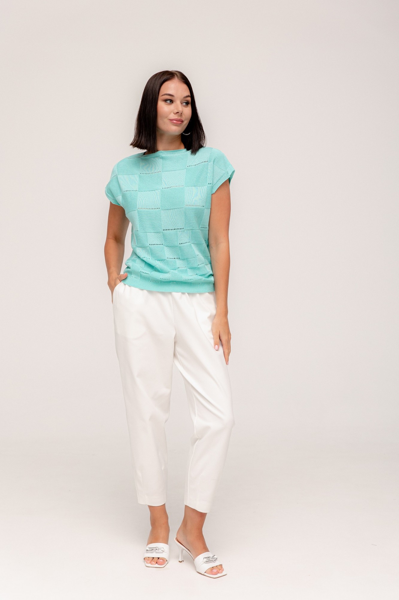 Жилет прямого силуэта со спущенной линией плеча. Горловины переда и спинки вывязаны в форме "лодочка". По низу изделия -ластик. Перед и спинка выполнены комбинированным переплетением с рисунком - квадраты. Жилет изготовлен из хлопкосодержащей пряжи в составе которой хлопок 50%, ПАН 50%. Носить комфортно, удобно и практично.