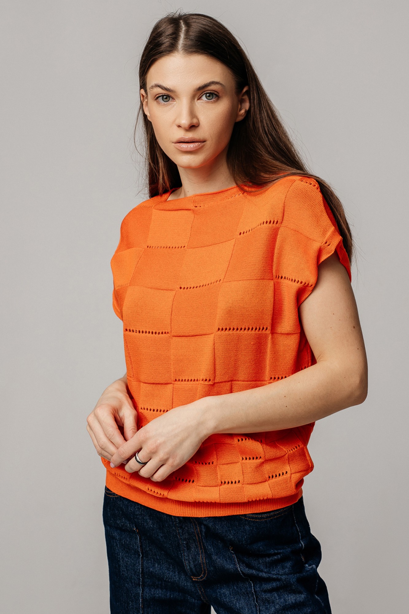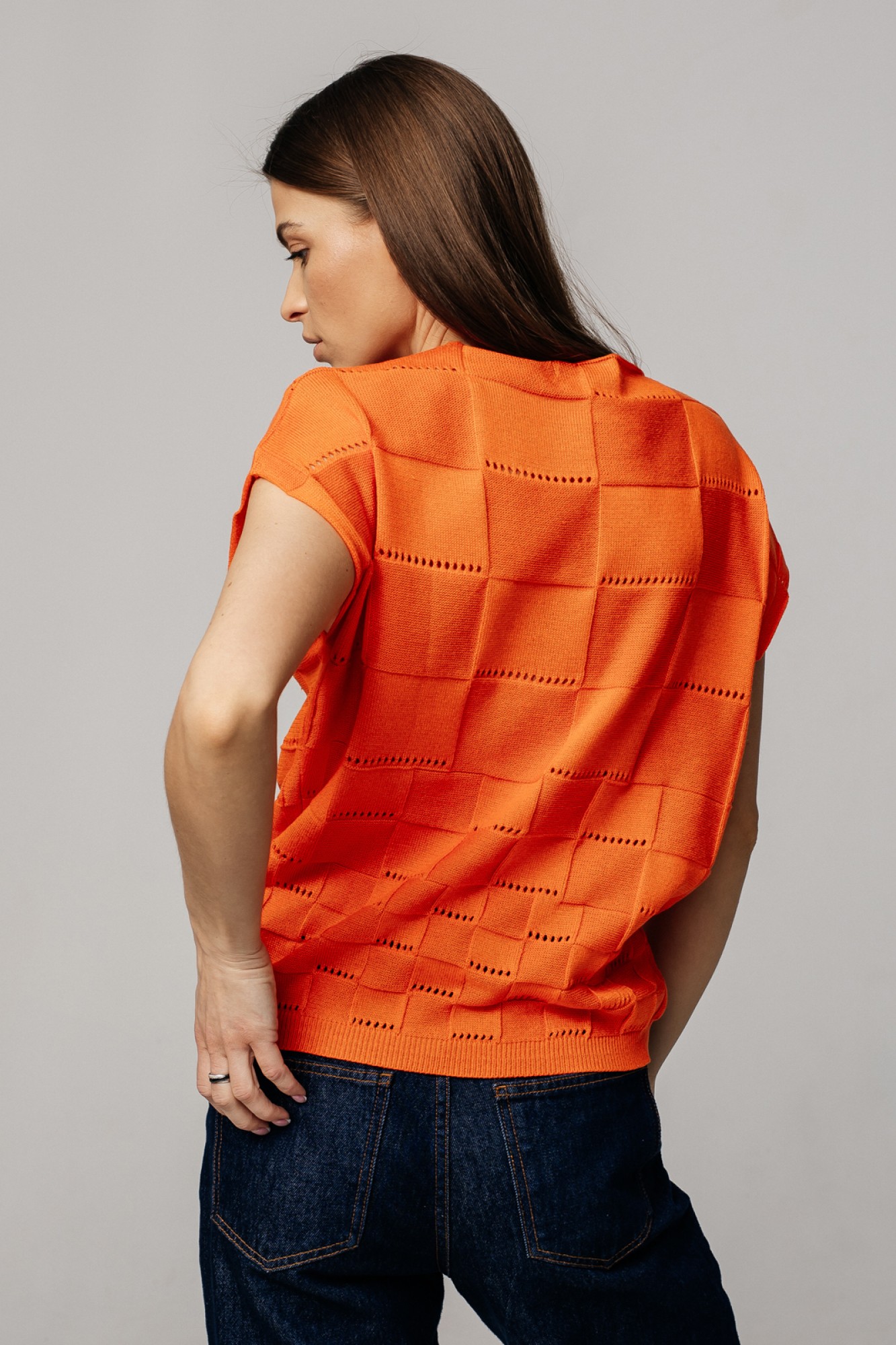 Жилет прямого силуэта со спущенной линией плеча. Горловины переда и спинки вывязаны в форме "лодочка". По низу изделия -ластик. Перед и спинка выполнены комбинированным переплетением с рисунком - квадраты. Жилет изготовлен из хлопкосодержащей пряжи в составе которой хлопок 50%, ПАН 50%. Носить комфортно, удобно и практично.