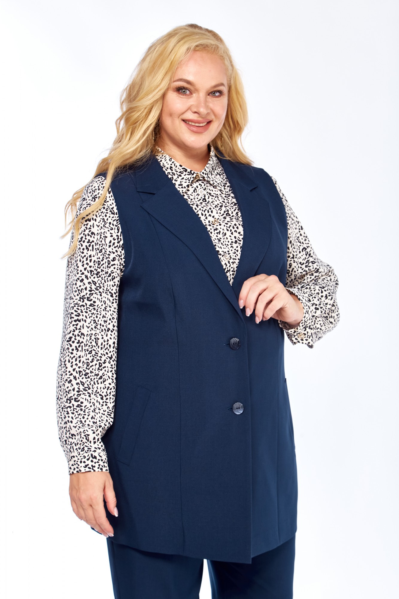 Элегантный женский жилет черного цвета - обязательный элемент базового гардероба. Изготовленный из качественной костюмно-плательной ткани, этот модель украшена отложным воротником и широкими лацканами. Полуприлегающий силуэт подчеркивается рельефами, идущими от плеча до низа как спереди, так и на спинке. Жилет имеет застежку на две пуговицы в тон. Функциональность добавляют прорезные карманы со листочкой на уровне бёдер. Длина изделия по спинке составляет 71 см, что делает его идеальным выбором для сочетания с различными элементами одежды, предоставляя массу вариантов для создания стильных образов.