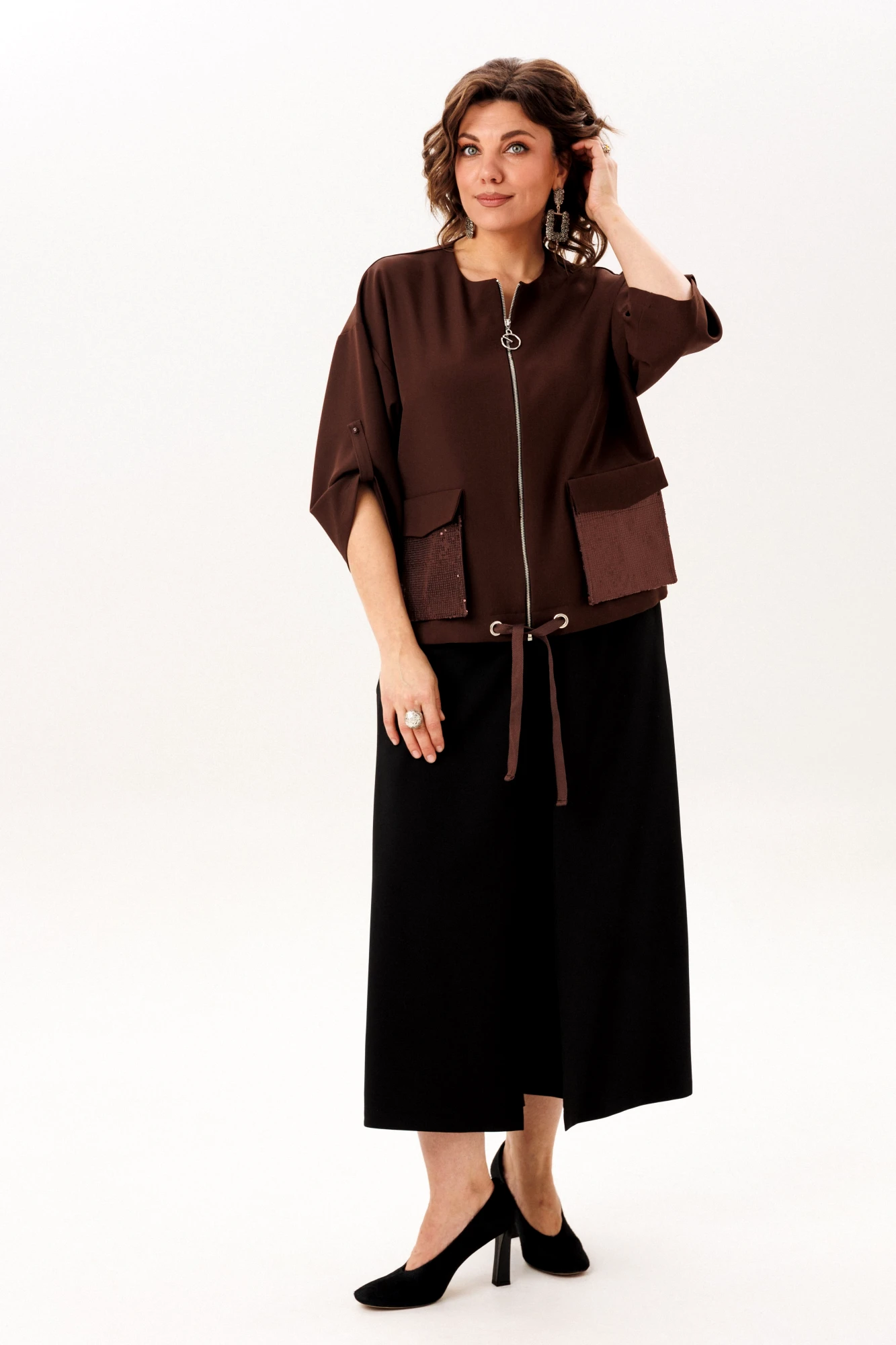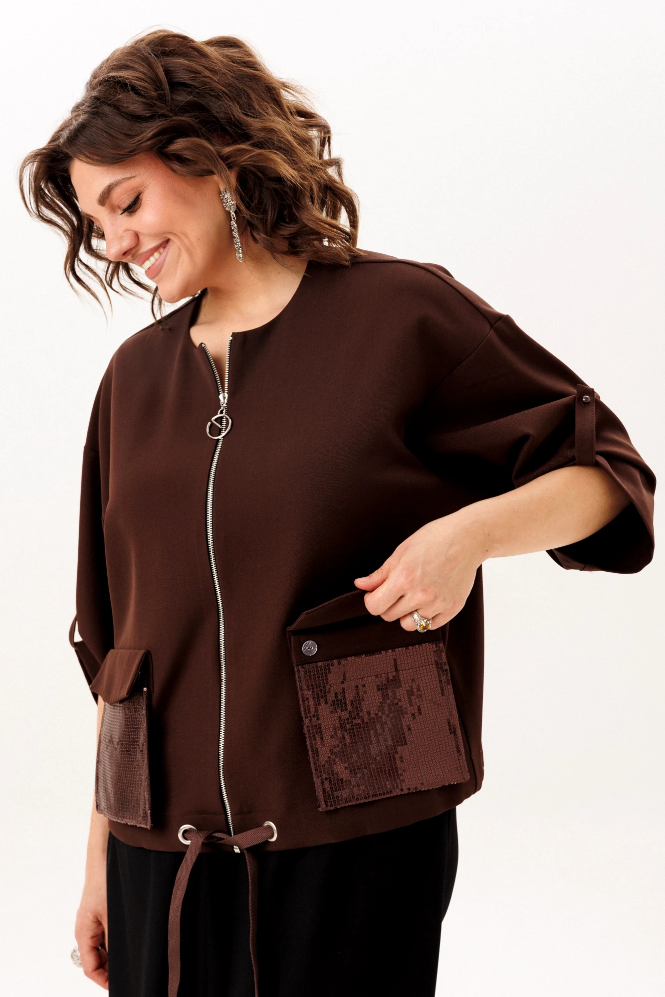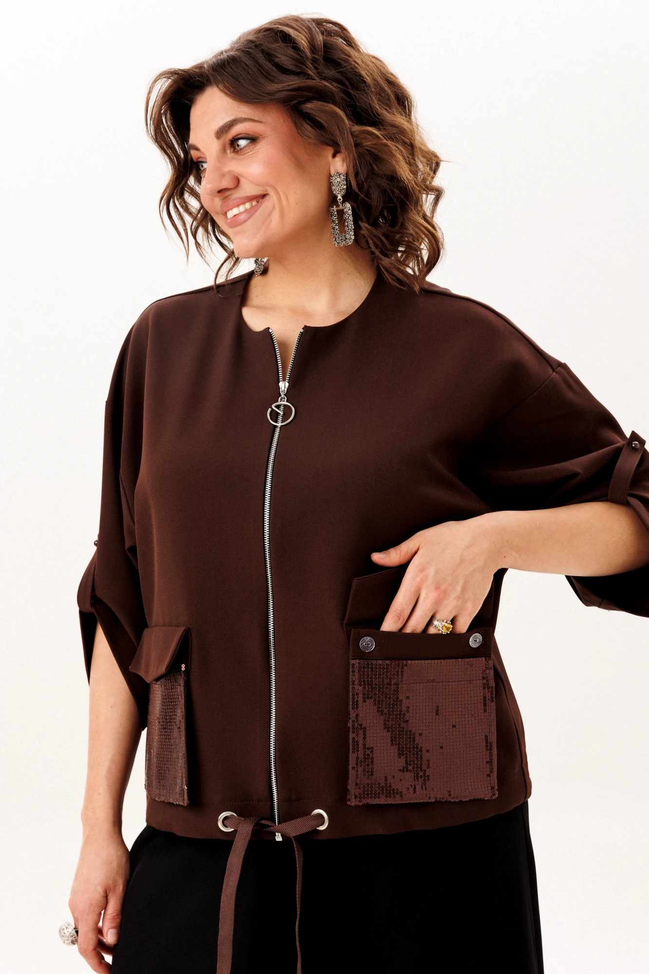 Центральная застёжка-молния добавляет чёткий современный акцент и практичность. Но истинной душой этого джута становятся два объёмных кармана, усыпанных россыпью пайеток: днём они - лишь тактильная фактура, но с приходом вечера пробуждаются, начиная тихую игру со светом, преображая повседневную вещь в предмет для особых моментов. Завершает образ умная деталь - кулиска по низу, позволяющая легко регулировать длину и создавать новый силуэт.